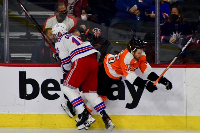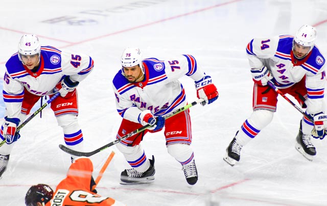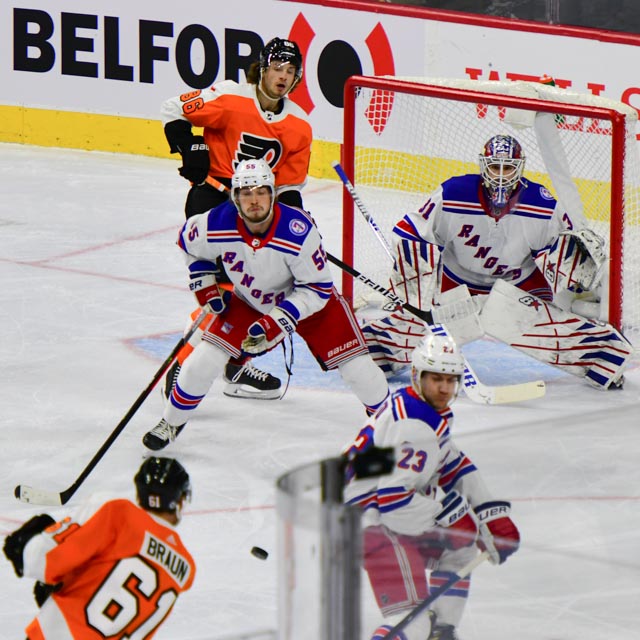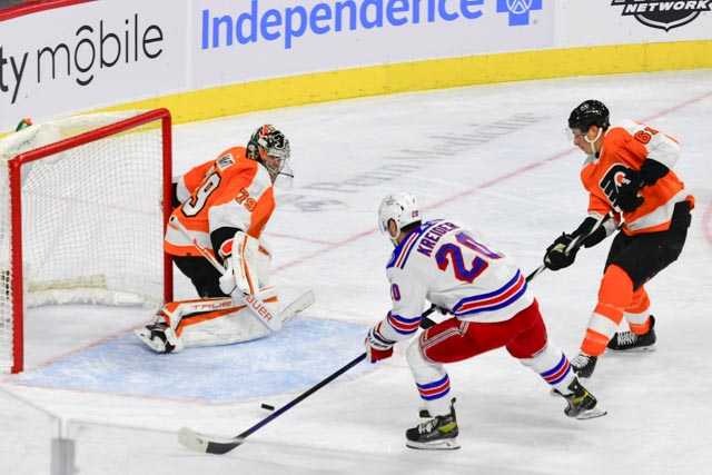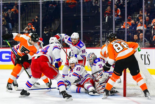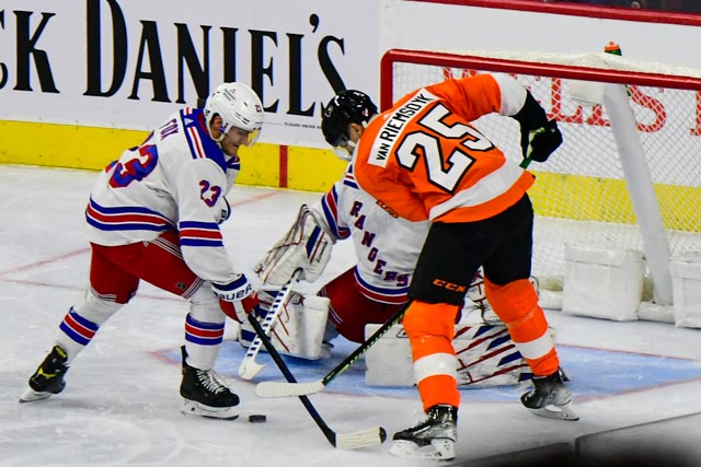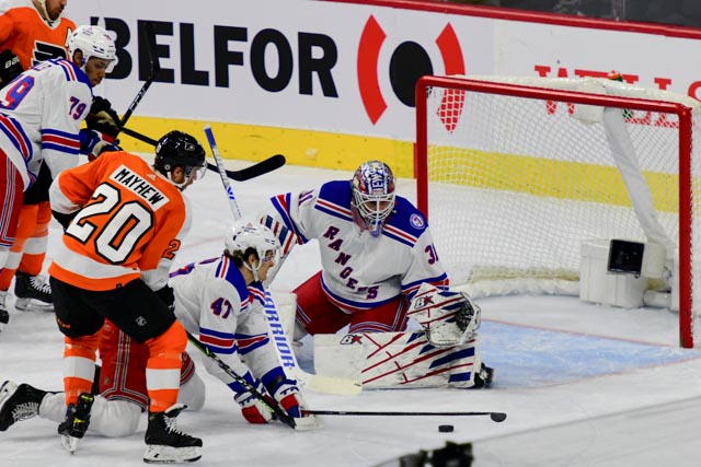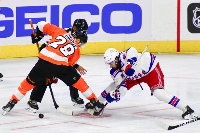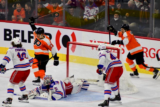 The Rangers’ Mika Zibanejad (power play), and the Flyers’ Oskar Lindblom traded goals in the first period for a 1-1 tie that held into the third period.