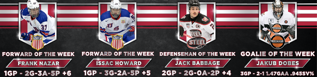 The United States Hockey League (USHL) announced Friday the Forwards, Defenseman and Goaltender of the Week for Week 3 of the 2020-21 season. The USA Hockey National Team Development Program’s (NTDP) Isaac Howard and Frank Nazar split the Forward of the Week honors after five-point performances while Jack Babbage (Chicago Steel) and Jakub Dobes (Omaha Lancers) took home Defenseman and Goaltender of the Week honors, respectively.