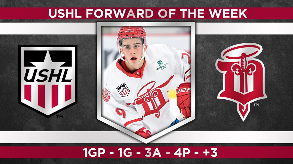 The Fighting Saints played only one game last week, but forward Tristan Lemyre factored heavily in the 7-1 win with a four-point night (1-3-4), which tied his career-best mark in a single game. The Denver University commit picked up primary assists on each of his team’s first two goals of the game and later picked up another, this time on the power play, in the second period. In the third, Lemyre scored his second goal in as many games when he capped the game’s scoring. The Mirabel, Quebec native played 50 games with Dubuque last season, notching 37 points (13-24-37) in his first USHL campaign.