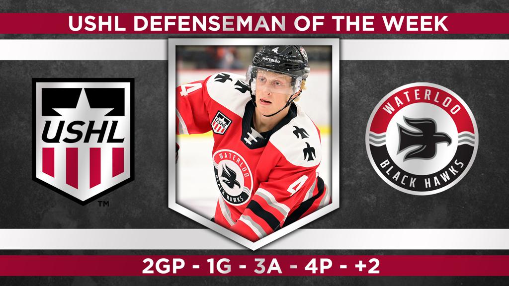 For the third time in four weeks, the Waterloo Black Hawks saw a player of theirs bring home a weekly honor, this time as Wylie was named Defenseman of the Week with four points (1-3-4) in two games. After being held off the scoresheet Friday night, the St. Cloud State University commit struck for a goal and three assists in a 4-3 overtime win Saturday night against the Dubuque Fighting Saints. Wylie picked up his first assist in the game’s opening goal in the opening frame and later assisted on a third period powerplay goal from teammate Mason Reiners and picked up the primary assist on the game-tying, powerplay goal with just 32 seconds left in regulation. After assisting on every Waterloo goal in a back-and-forth regulation, Wylie’s first goal of the season served as the overtime game winner as he sent the fans home happy.