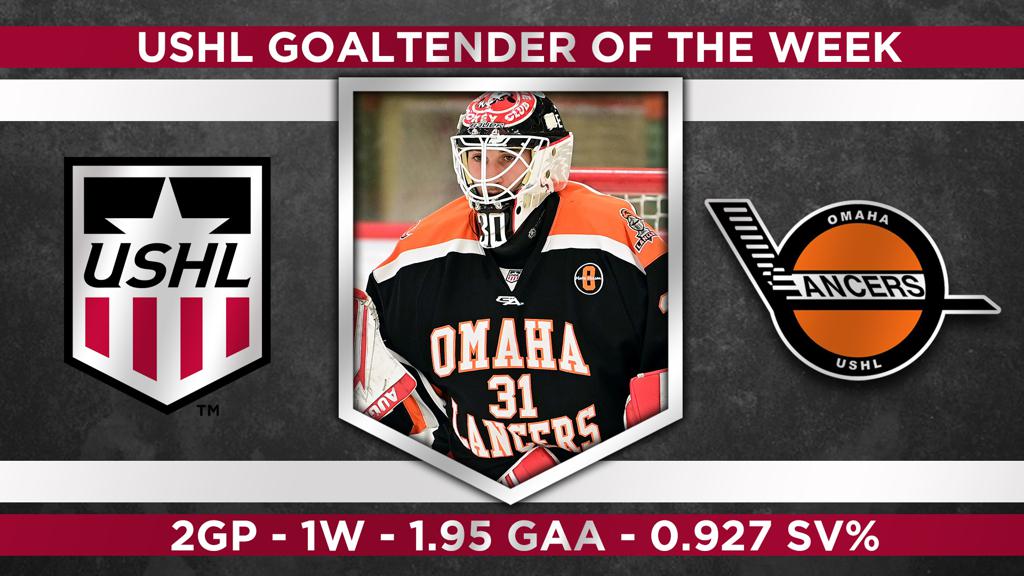 Despite splitting the weekend series, Kevin Pasche recorded a 1.95 goals against average and 0.927 save percentage, turning aside 51 of the 55 shots he faced, en route to earning his first Goaltender of the Week award. The Swiss netminder had a near perfect performance Friday night, stopping 26 of the 27 shots he faced in a 2-1 overtime win against Waterloo. The next night, Pasche was stuck with a loss, despite keeping his Lancers in the game with 25 saves in an eventual 3-2 loss to the Sioux City Musketeers. Despite a 1-3-0-0 record this season, Pasche has an impressive 2.25 goals against average and 0.922 save percentage, which are both in the top-10 among league netminders. Pasche is following in a steady line of Lancers goaltenders as each of the last two Omaha primary goaltenders each won a trio of Goaltender of the Week Awards in their time, including Jakub Dobes (two in 2020-21 and one in 2019-20) and Kyle McClellan (three in 2019-20). The Swiss netminding connection is also strong as fellow Switzerland native Akira Schmid won USHL Goaltender of the Year last season and was awarded Goaltender of the Week on four separate occasions.