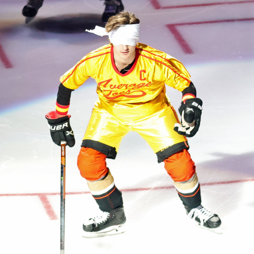 Anaheim Ducks Trevor Zegras dressed up as Peter Lafleur, from the movie “Dodgeball” and put on a blindfold before scoring with a twist.