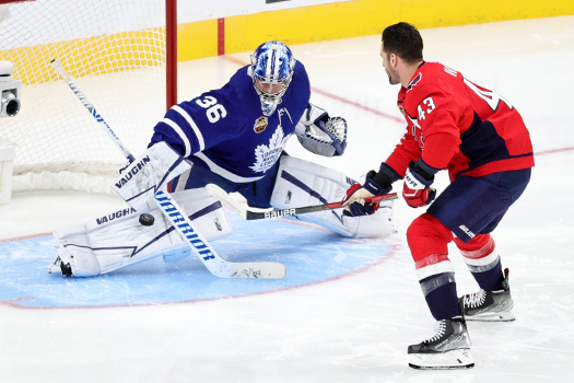 Jack Campbell stops a shot by Washington Capitals’ Tom Wilson durring the Dunkin’ NHL Save Streak challenge – Photo by Jack Lima