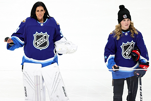 Adidas NHL Breakaway Challenge winner Alex Pietrangelo takes a shot on goalie Manon Rheaume – Photo by Jack Lima