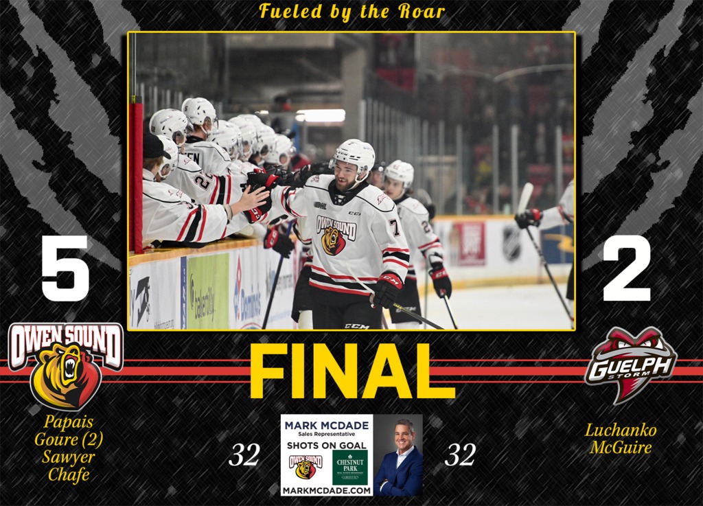Owen Sound stretched the score to 5-1 early in period three, when Goure sniped his second of the game beating Oster short-side top shelf. The goal came off a nice stretch feed to Papais from netidner Corbin Votary who would pick-up his first OHL point. The Storm were able to cut into the lead late in the game, while each team had a glorious chance turned aside by solid goaltending in the final minutes of play.