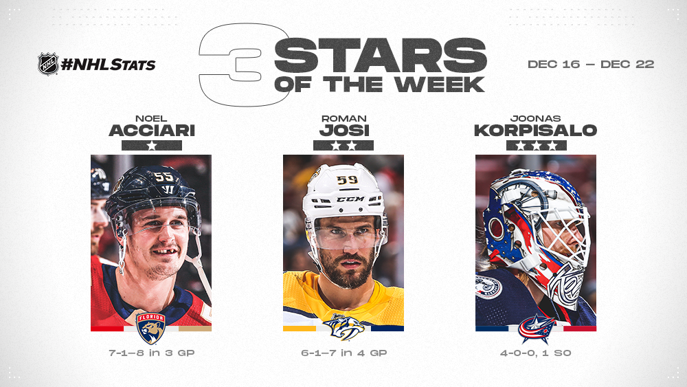 NEW YORK – Florida Panthers center Noel Acciari, Nashville Predators defenseman Roman Josi and Columbus Blue Jackets goaltender Joonas Korpisalo have been named the NHL’s “Three Stars” for the week ending Dec 22.
