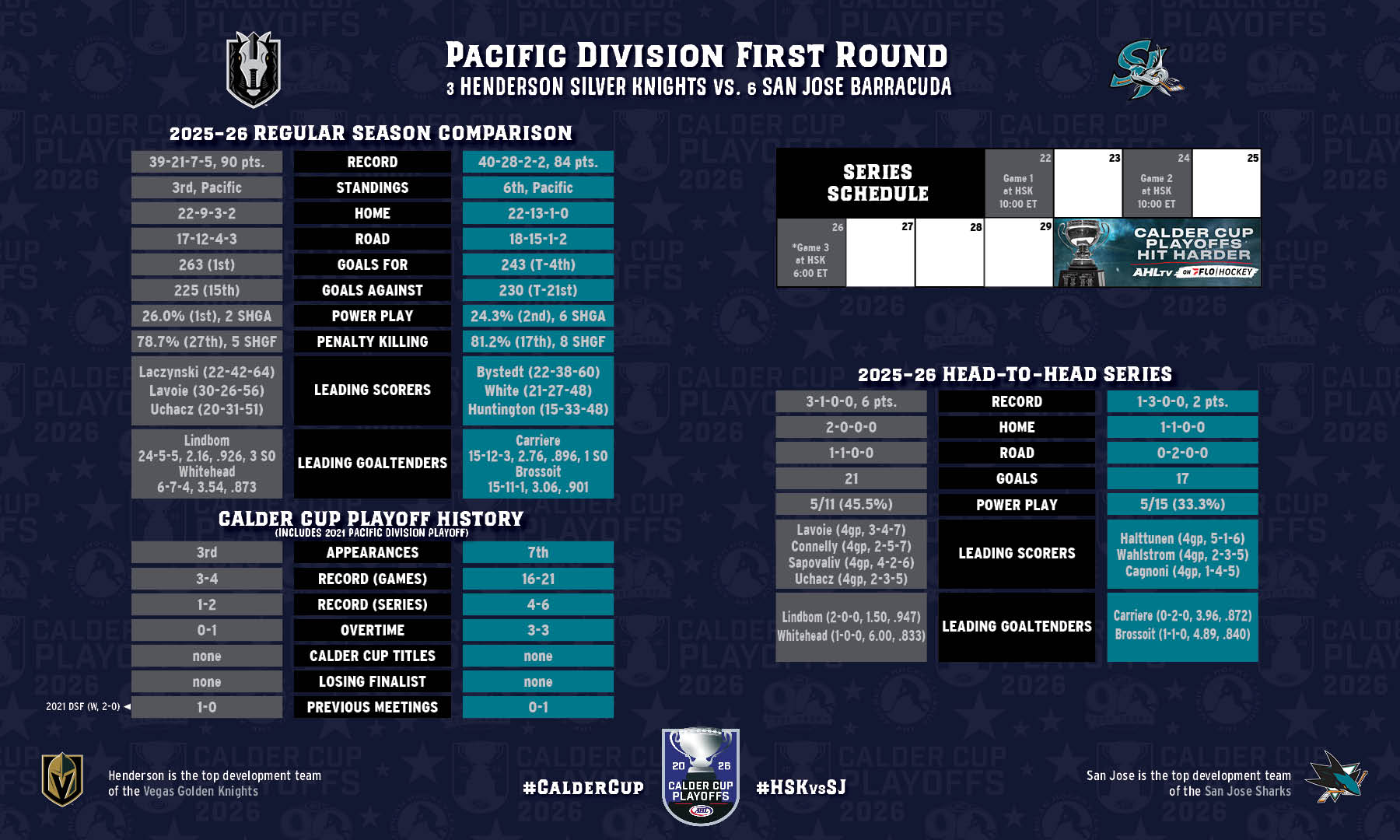 The final Game 1 of the night sees San Jose visit Henderson, where the Silver Knights finished the regular season with a seven-game home winning streak – including 9-6 and 4-1 victories over the Barracuda on Apr. 10-11.