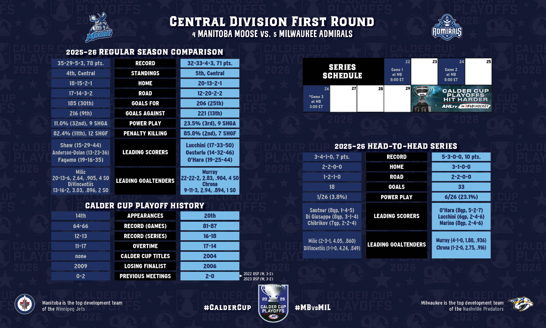 Manitoba finished 30th in the 32-team league in scoring and ranked last on the power play, but the Moose were ninth in goals allowed and 11th on the penalty kill. Milwaukee’s special teams were both elite during the regular season, coming in third on the power play and second in penalty killing. In eight head-to-head meetings, the Admirals killed off 25 of 26 Moose power plays (96.2 percent).