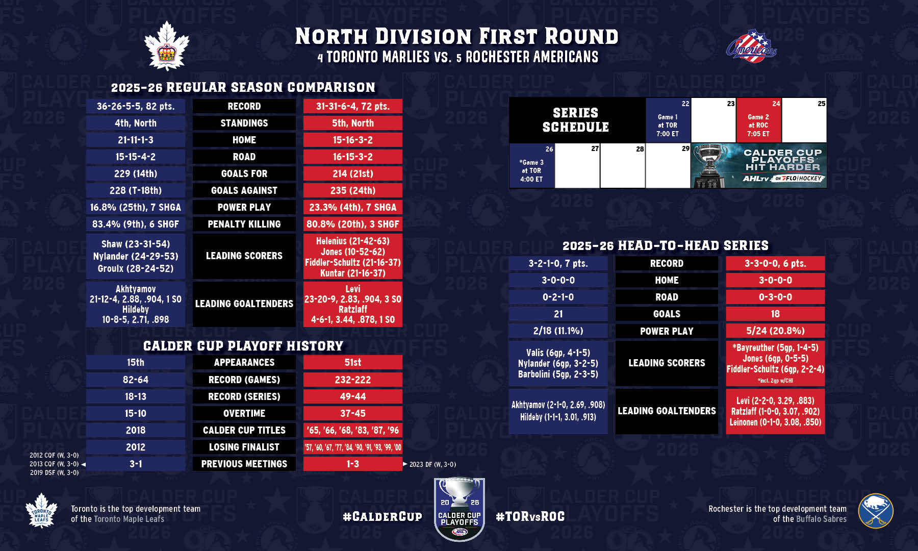 Toronto hosts Rochester in Game 1 of the North Division’s first-round series at Coca-Cola Coliseum this evening. The home team won all six regular-season meetings between the clubs in 2025-26.