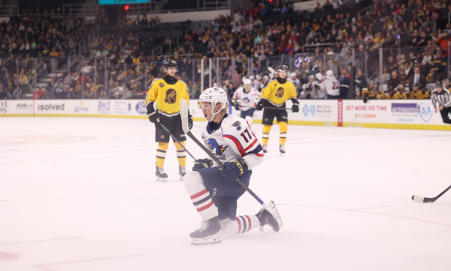 The star winger was far from finished, though. With time dwindling on regulation, Alexandrov won a puck battle on the left-wing boards and moved to the front of the net after the puck got to Leo Loof at the left point. Loof flipped the puck into traffic, where Alexandrov deflected it across his body and under Bussi’s legs, giving Springfield the 3-2 lead with just 18.6 seconds left.