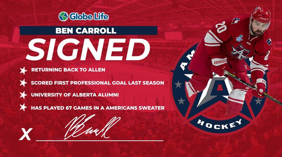 ALLEN, TX – The Allen Americans and partner Globe Life are proud to announce the signing of defenseman Ben Carroll for the 2021-2022 season.