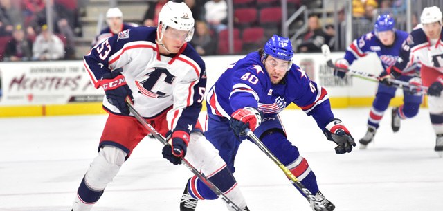 In the second period, MacInnis scored an unassisted goal of his own to cut Cleveland’s deficit in half. With Brett Gallant serving the first half off a double-minor high-sticking infraction, the Monsters forward pounced on a loose puck just outside the Rochester blueline and sped off on a 2-on-1 rush. MacInnis got to the hash marks and unleashed a shot that glanced off the blocker of Johansson and in for his sixth goal of the season.