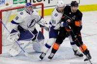 Goalie Andrei Vasilevskiy #88 and Erik Cernak #81 of the Tampa Bay Lightning and Sean Couturier #14 of the Philadelphia Flyers