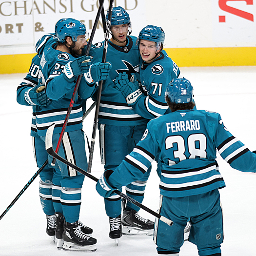 Sharks defenseman Shakir Mukhamadullin (center) celebrates his first period goal with teammates Barclay Goodrow (23) Maklin Celebrini (71) and Mario Ferraro (38) – Photo by Jack Lima