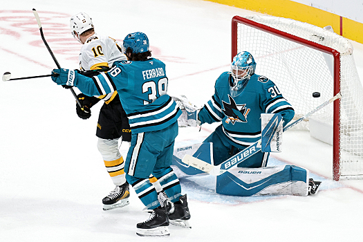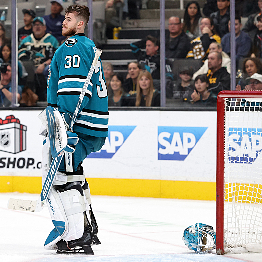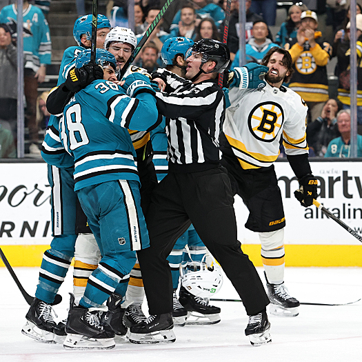 Sharks goalie Yaroslav Askarov loses his mask during third period actionTempers flare after the final buzzer as Sharks Vincent Desharnais (5) Barclay Goodrow (center) and Mario Ferraro (38) tangle with Bruins Tanner Jeannot (84) and Mark Kastelic (47)Tempers flare after the final buzzer as Sharks Vincent Desharnais (5) Barclay Goodrow (center) and Mario Ferraro (38) tangle with Bruins Tanner Jeannot (84) and Mark Kastelic (47) – Photo by Jack Lima