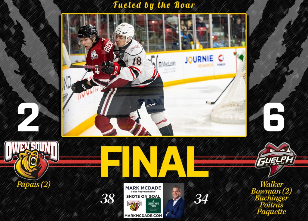 Unfortunately, for the Bears the momentum built late in period two was erased by Bowman’s second goal just over a minute into the third period. The Attack would press to cut the lead back to a single goal, but Guelph showed strong defence, and when Owen Sound had opportunities, Leaver was solid in the Storm net. A pair of empty net goals in the final minutes of the game sealed the game at 6-2 as the Attack dropped their fourth straight game.