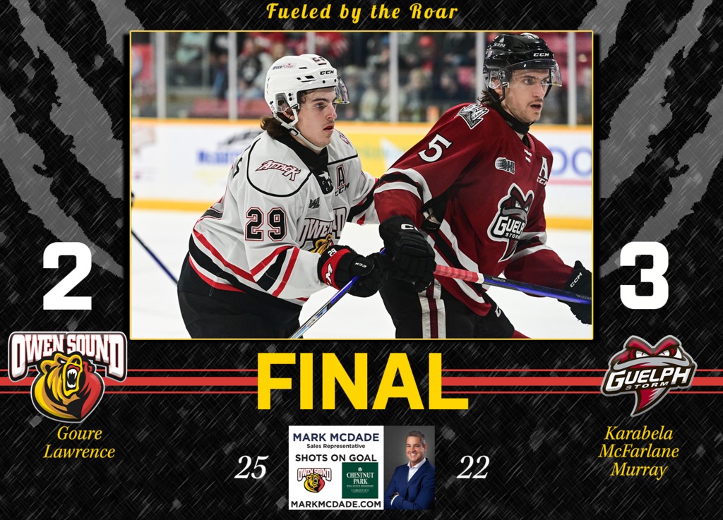It’s been a tough few games for the Owen Sound Attack against their Highway 6 rival Guelph Storm. After dropping a pair of game two weeks ago, as well as, the first half of the weekend home-and-home, the Attack lost their fourth straight meeting with their division rival Saturday night, falling 3-2 in overtime.