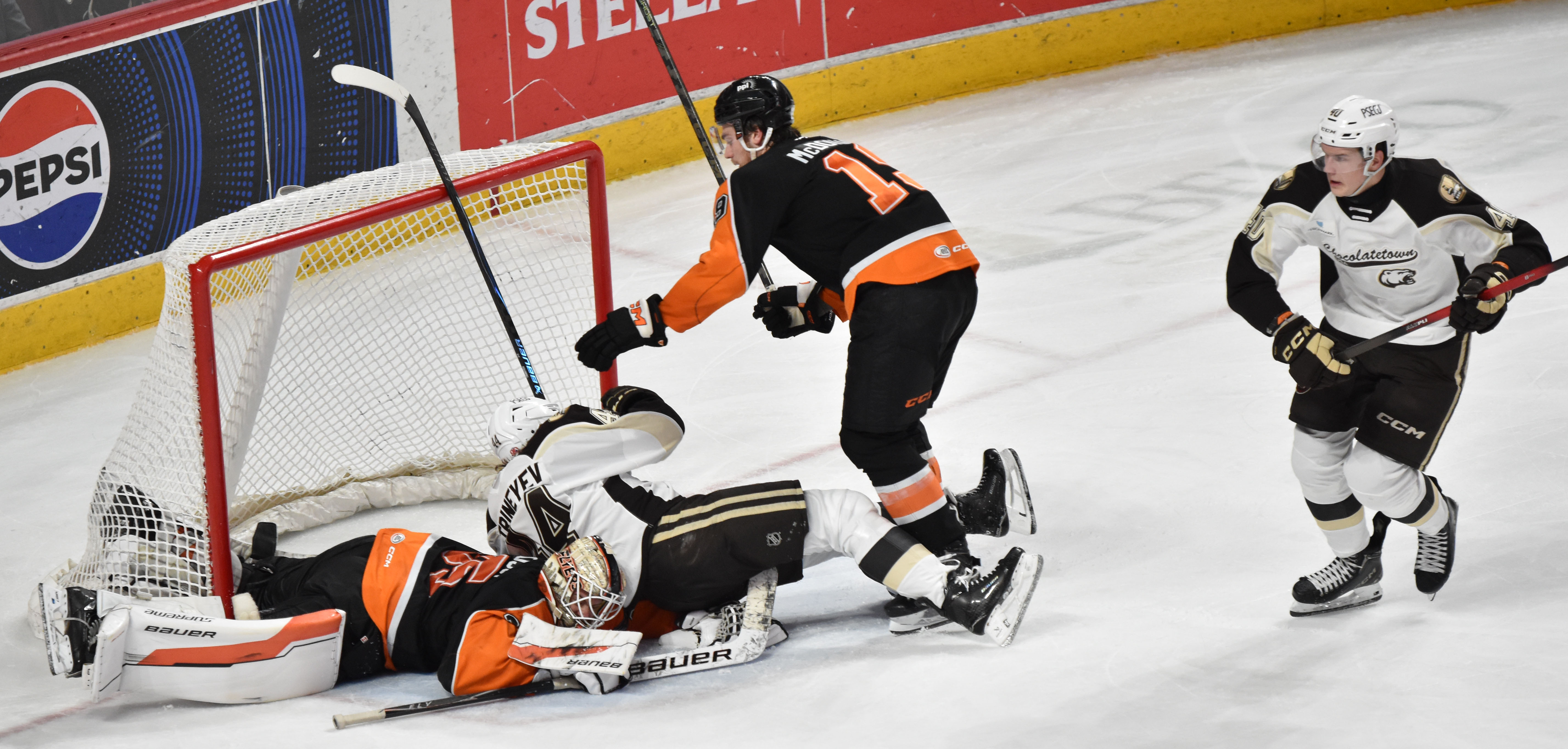 Cooper Marody (5th), Tucker Robertson (11th) and Phil Tomasino (3rd with Lehigh Valley) also found the back of the net. Meanwhile, a frustrated Bears team took out its frustrations on its rivals to the tune of three fights and some early dismissals thus potentially setting the stage for a feisty and spirited rematch in Hershey tomorrow night with the Phantoms bringing the brooms out in search of the two-game sweep.
