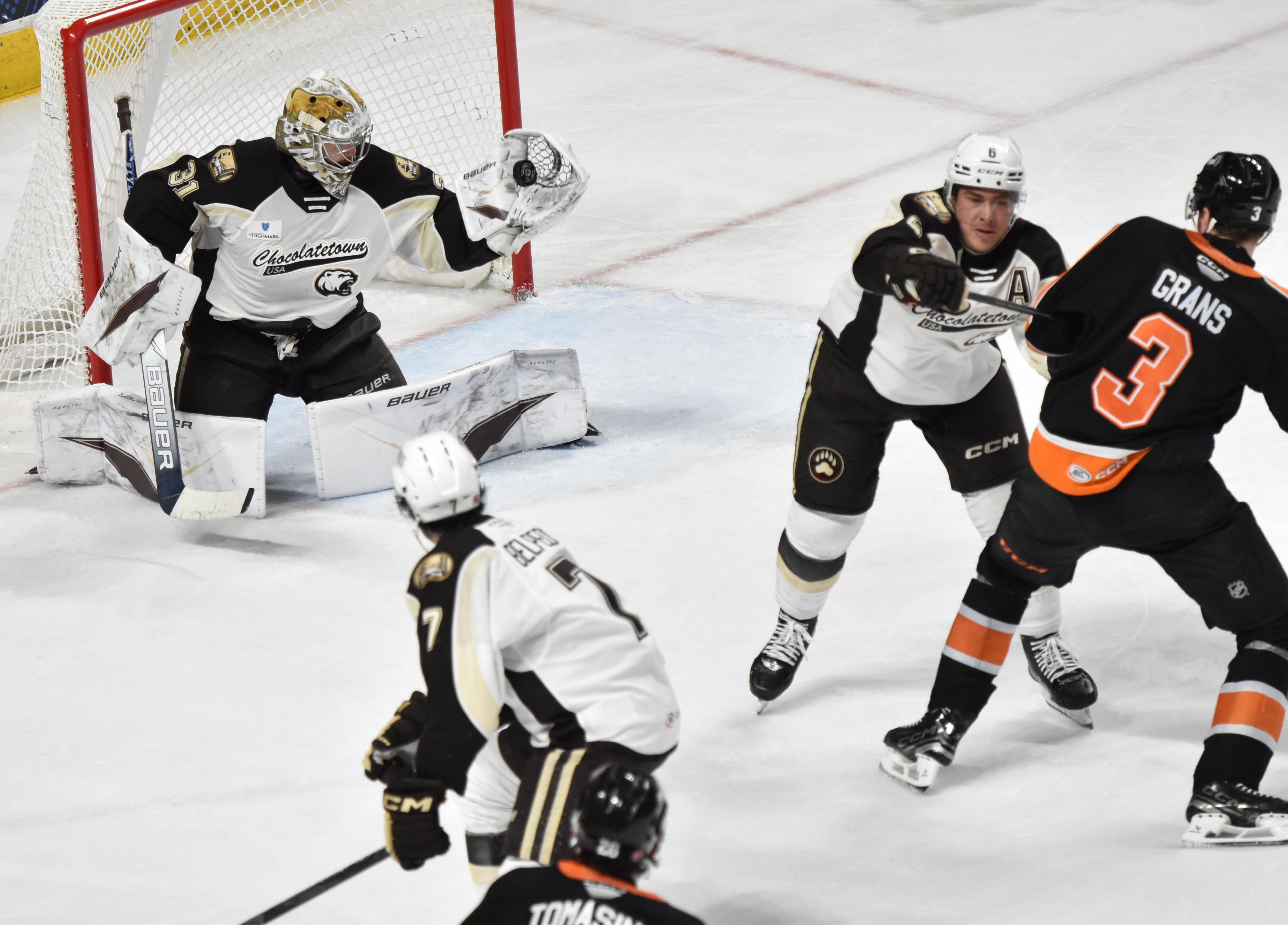 Continued pressure had the Bears on their heels early in the second period with Hershey’s skaters unable to find an exit. The sustained cycle and continued retrievals successfully wore down the Chocolate and White allowing Robertson to slip to the low slot undefended. Lane Pederson on the right boards found Robertson down low who went from right-to-left across the crease to bury the backhander past Stevenson at 4:32 into the second period for a 3-0 lead.