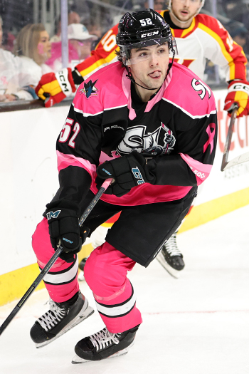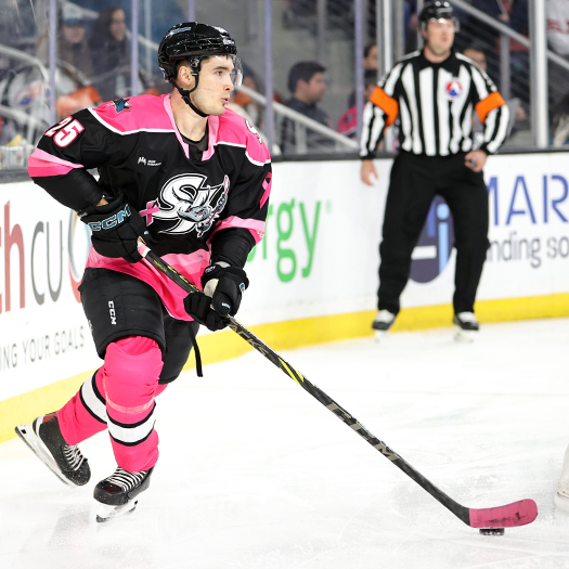 Barracuda’s defenseman Antemi Kniazev looks to make a pass wearing special Pink In The Rink uniforms – Photo by Jack Lima
