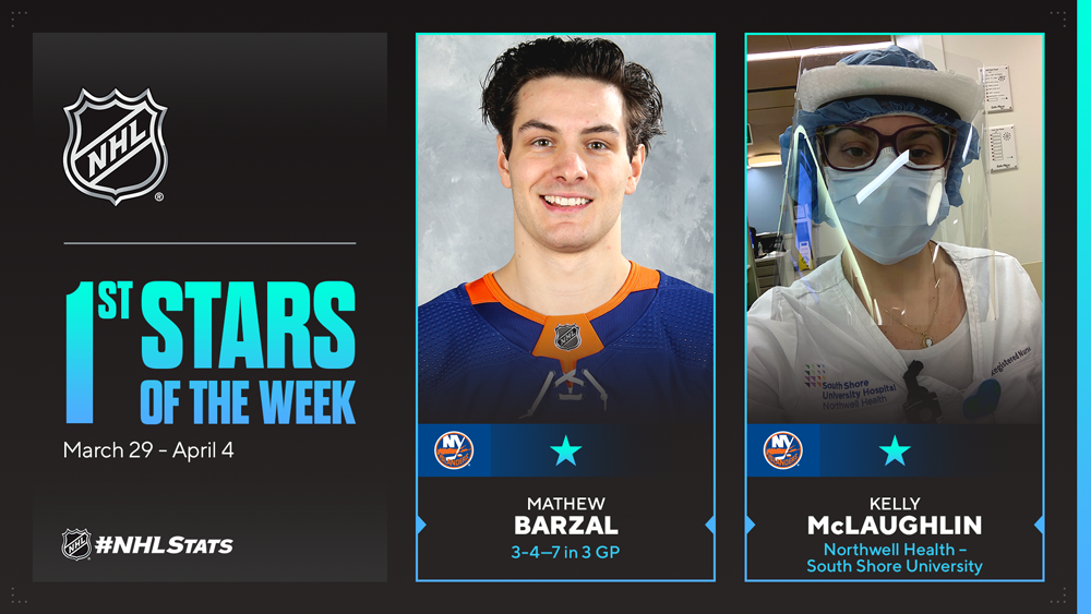 NEW YORK – New York Islanders center Mathew Barzal and Northwell Health — South Shore University Hospital RN Kelly McLaughlin have been named the NHL’s “First Stars” for the week ending April 4.