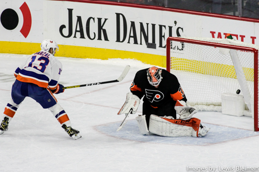 Mathew Barzal #13 of the New York Islanders scores in the shootout.