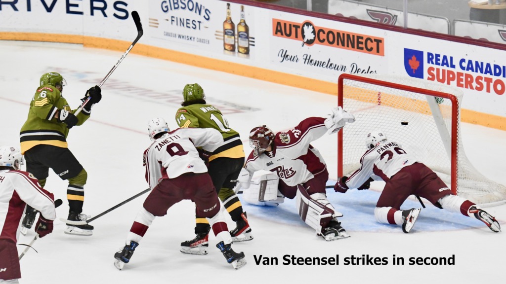 Van Steensel struck at 9:07 of the middle period with Lockhart off for high-sticking, cashing the rebound of a Michael Podolioukh shot from the slot. Anthony Romani had the other assist as all three players earned a first point on the season.