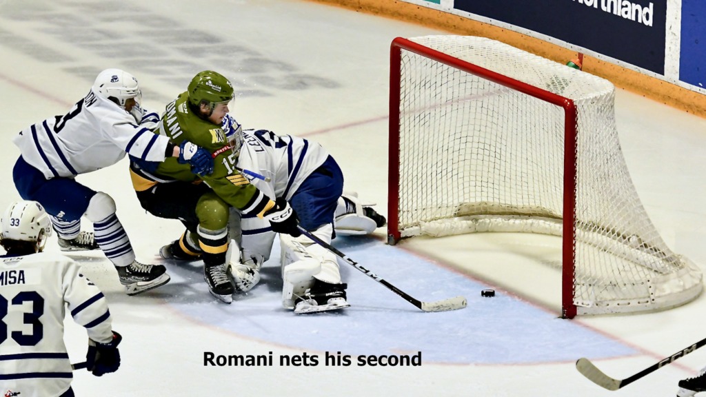 Romani made it 3-0 at 8:03, wiring the puck home from a sharp angle in the right circle, assisted by Owen Van Steensel and Nelson, before striking again at 11:25. Romani swept past Dylan Gordon in the slot on the backhand before going to his forehand on crashing the crease. Pasquale Zito and Luc Brzustowski, who earned his first OHL playoff point, had assists.
