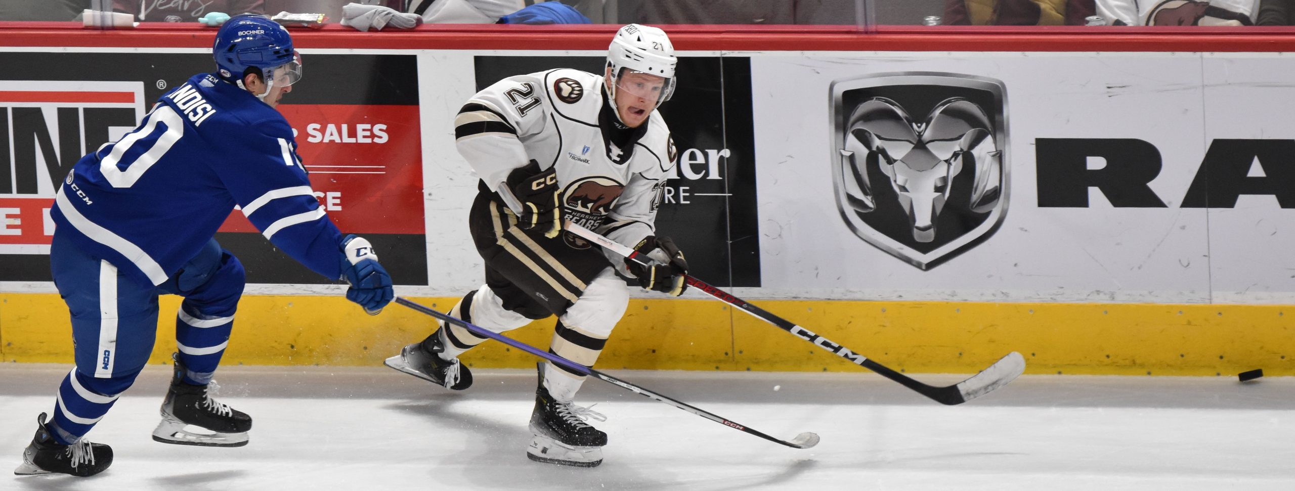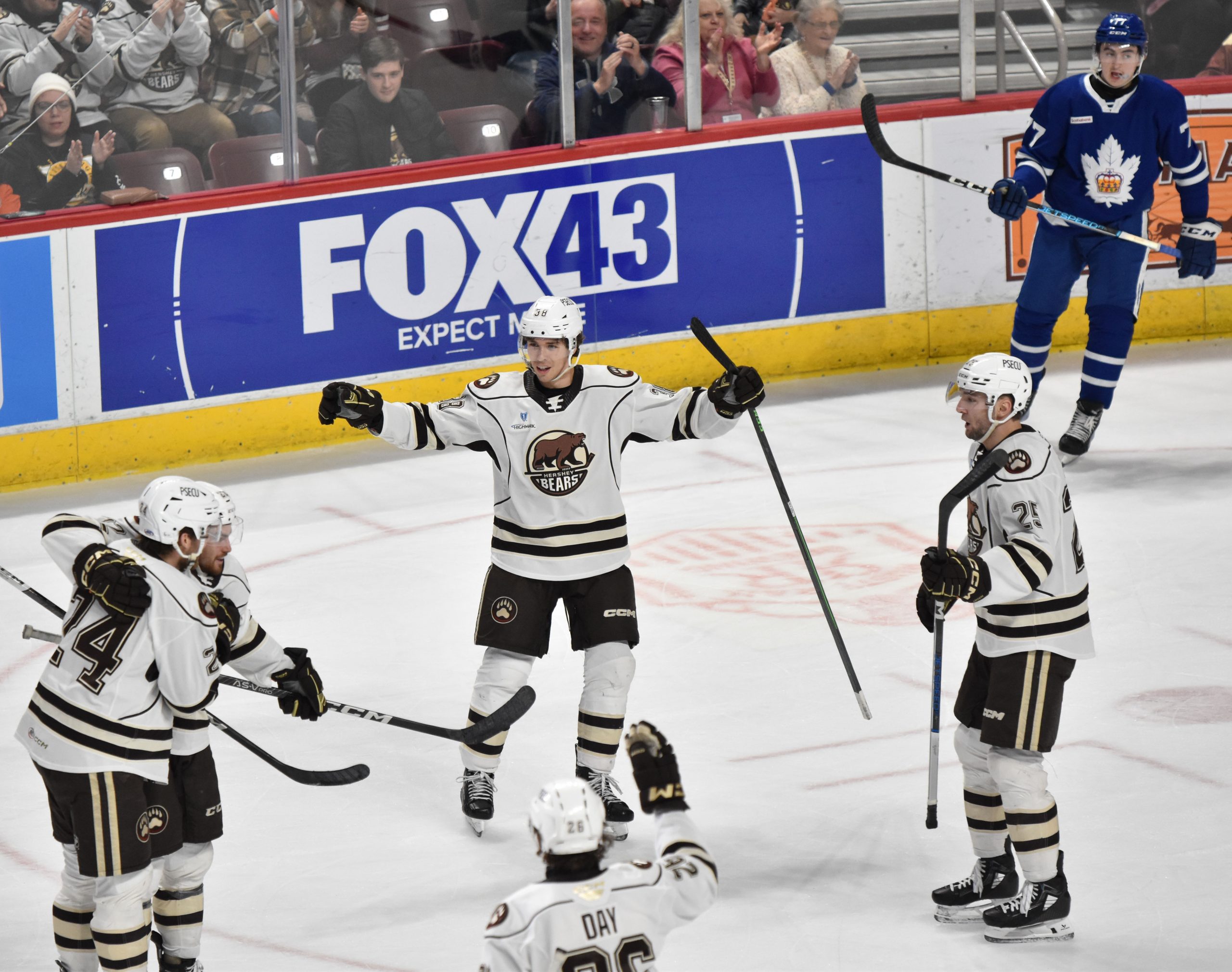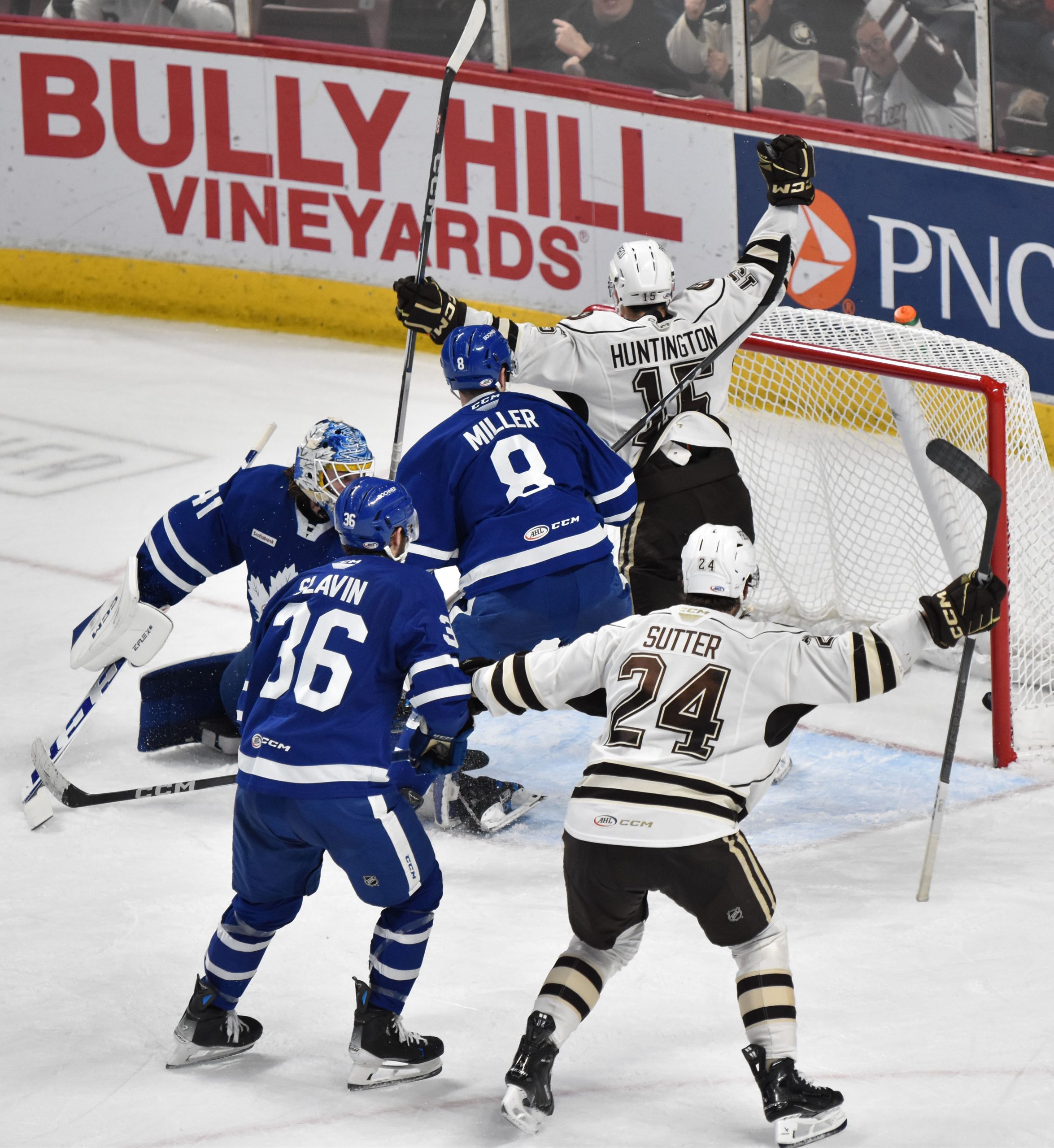 Jimmy Huntington scored the tying goal with 20 seconds remaining in regulation and Joe Snively delivered the game-winner with less than two seconds left on the clock in sudden-death, and the Hershey Bears (34-7-0-2) battled back for a 4-3 overtime victory over the Toronto Marlies (17-14-6-1) on Sunday evening in front of a crowd of 10,159 at GIANT Center.