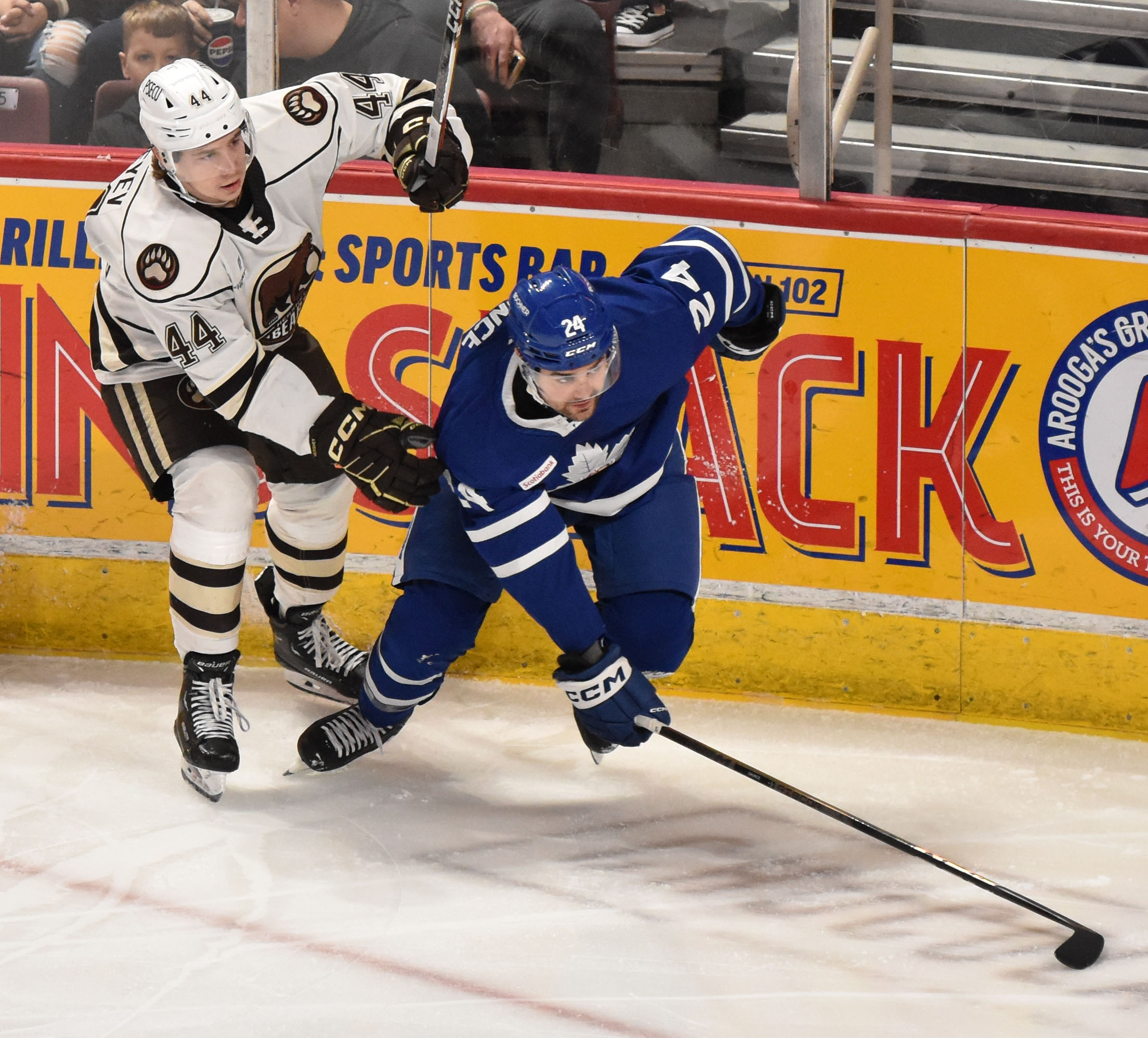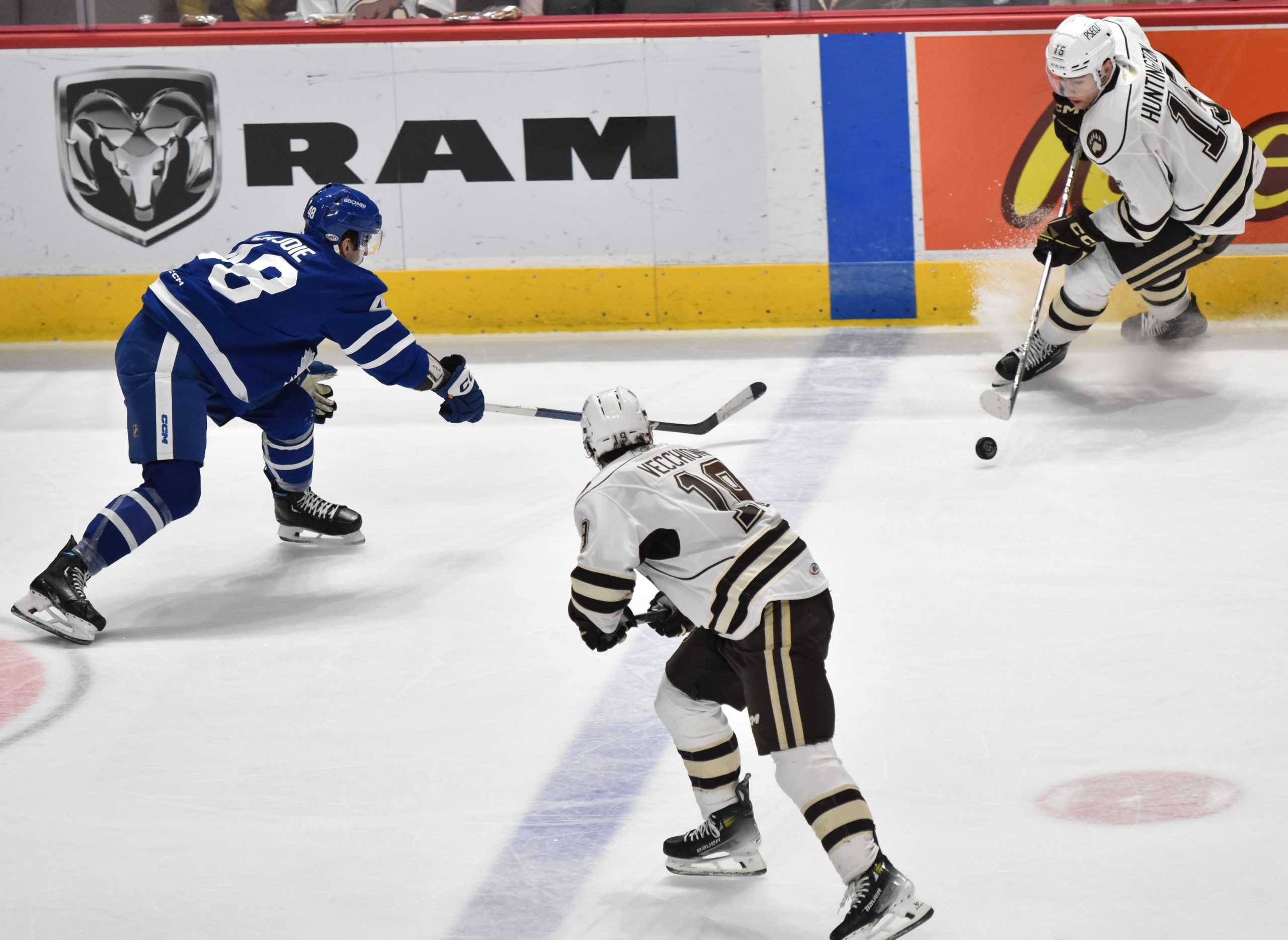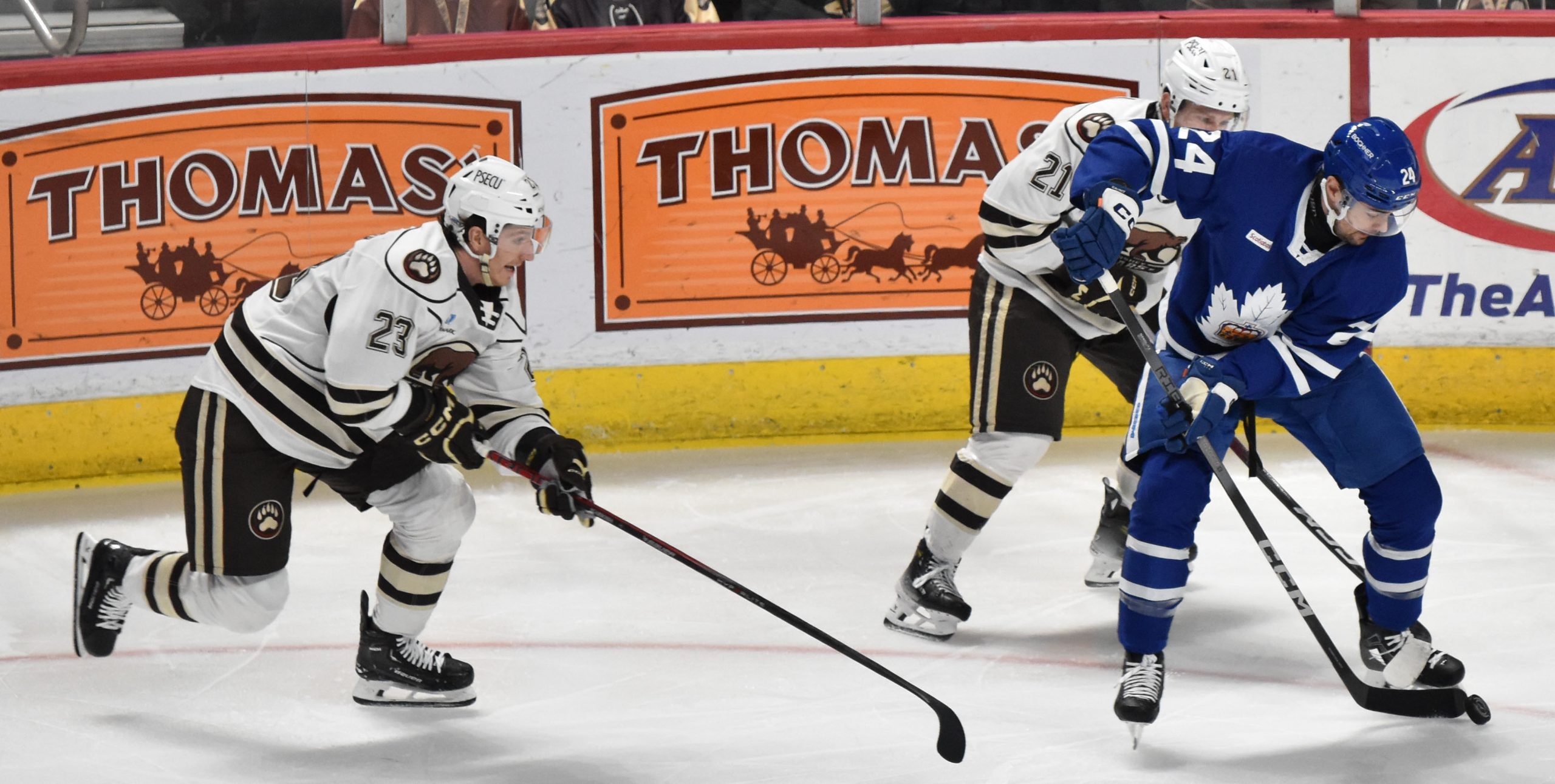 Jimmy Huntington scored the tying goal with 20 seconds remaining in regulation and Joe Snively delivered the game-winner with less than two seconds left on the clock in sudden-death, and the Hershey Bears (34-7-0-2) battled back for a 4-3 overtime victory over the Toronto Marlies (17-14-6-1) on Sunday evening in front of a crowd of 10,159 at GIANT Center.