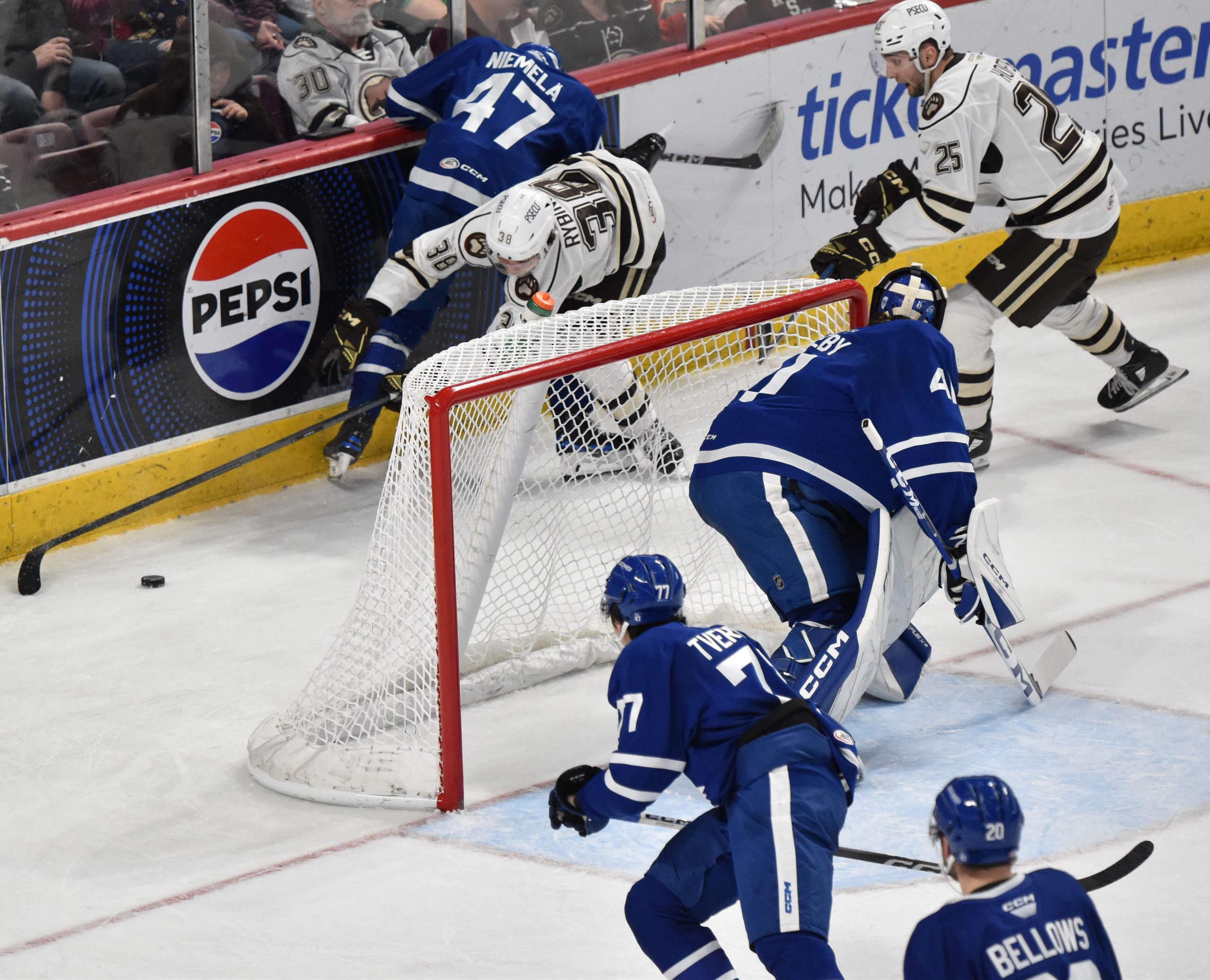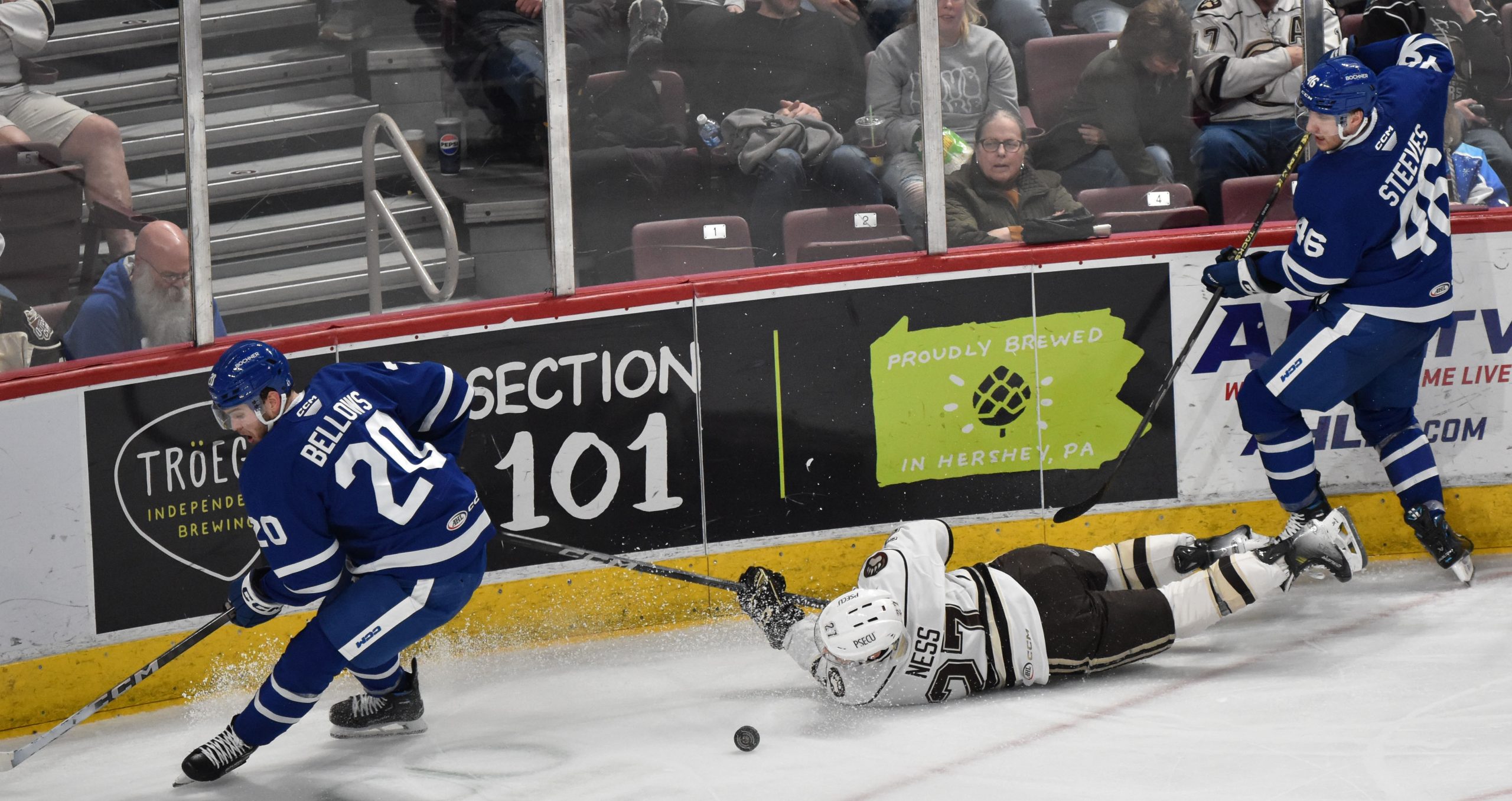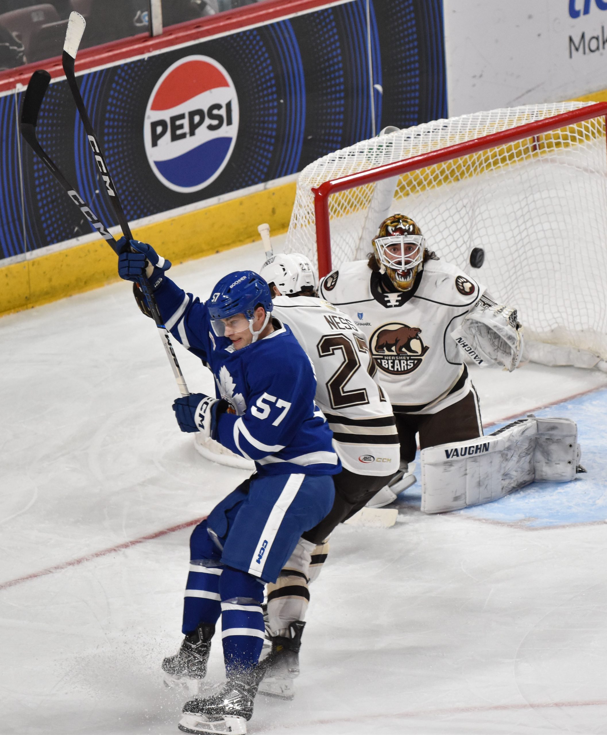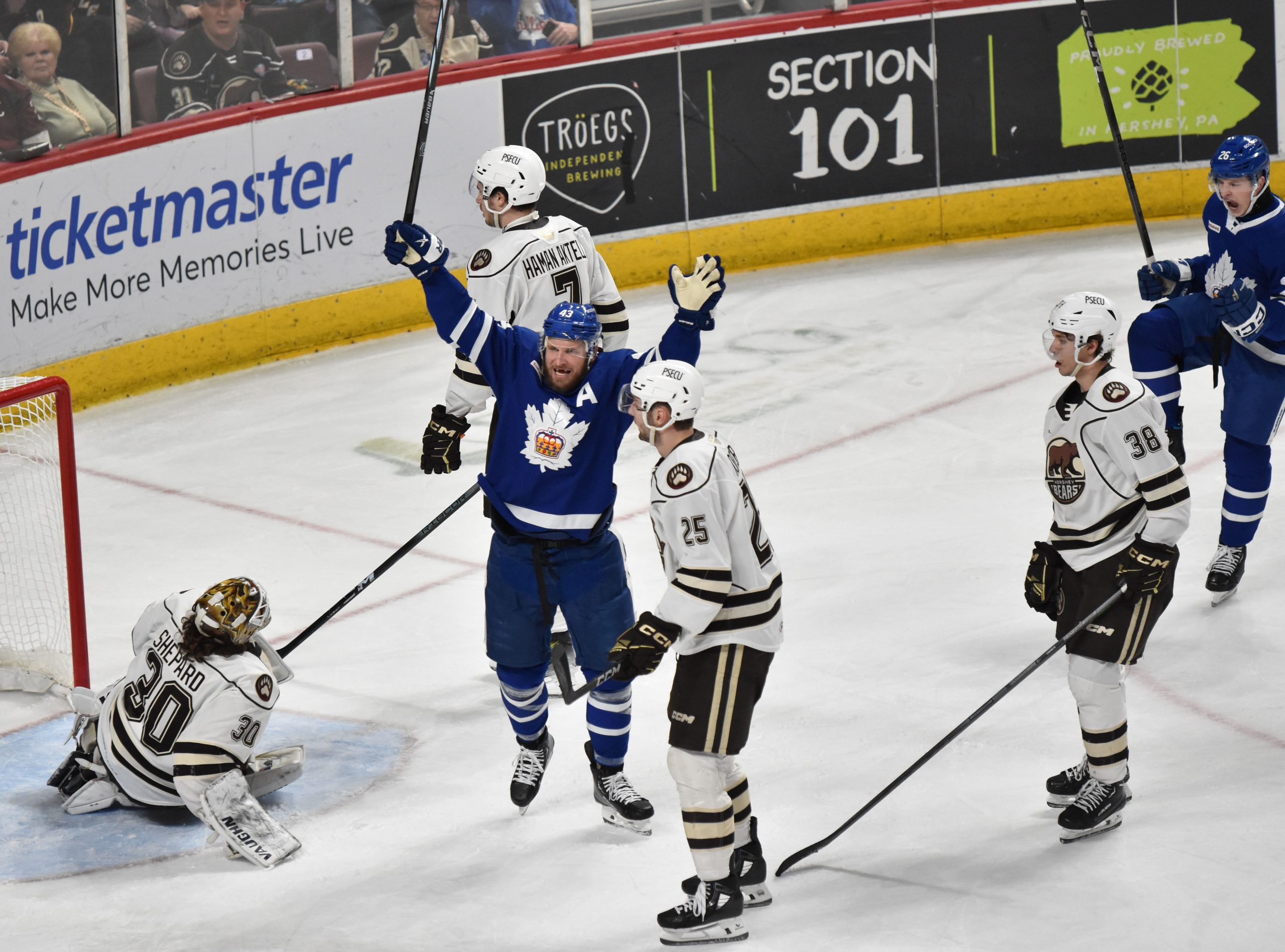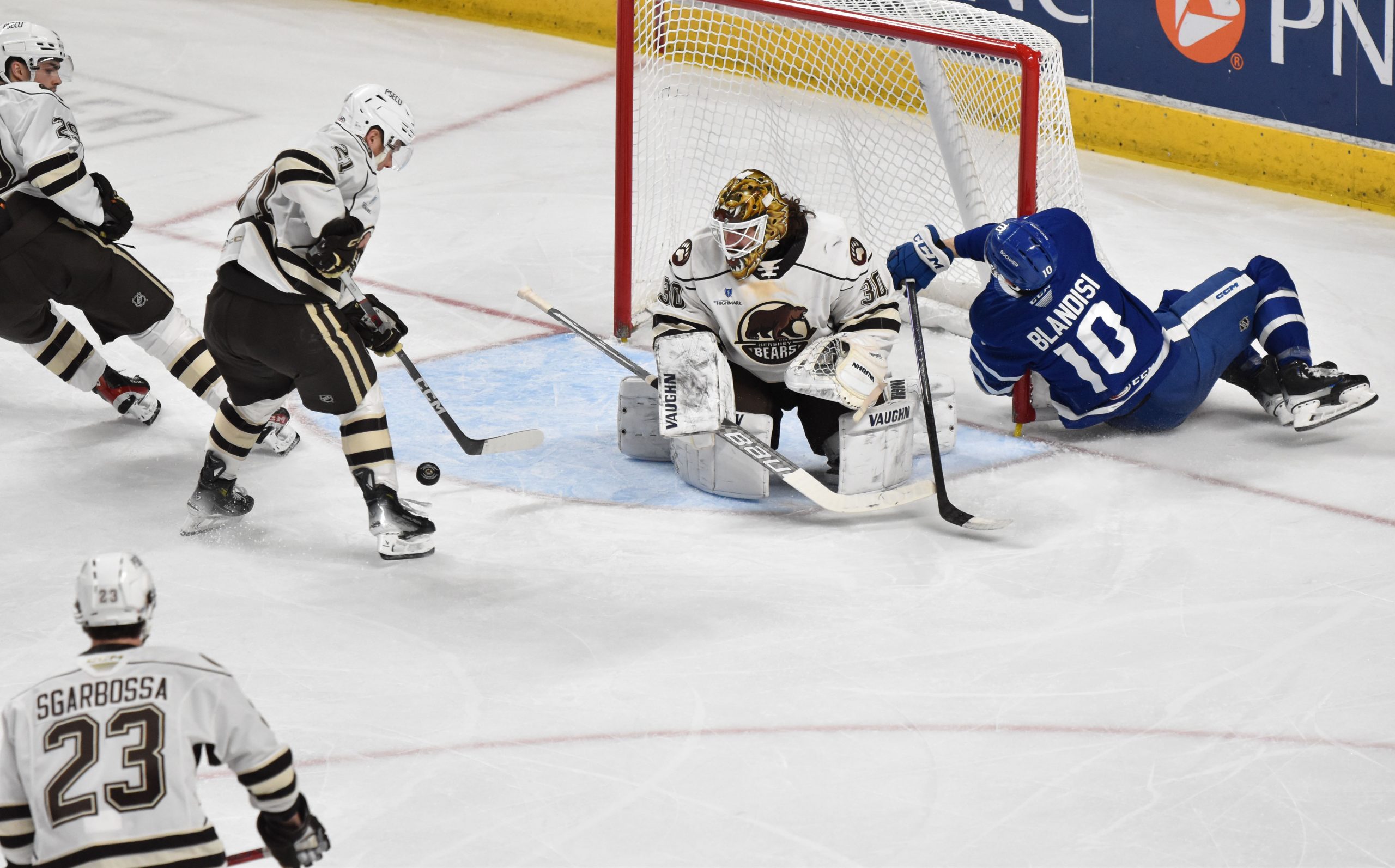 Toronto knotted the game at 10:02 of the third period with a power-play goal from Joseph Blandisi after the Marlies had kept the puck in the Hershey zone and foiled had foiled a handful of chances with several scrambling saves.