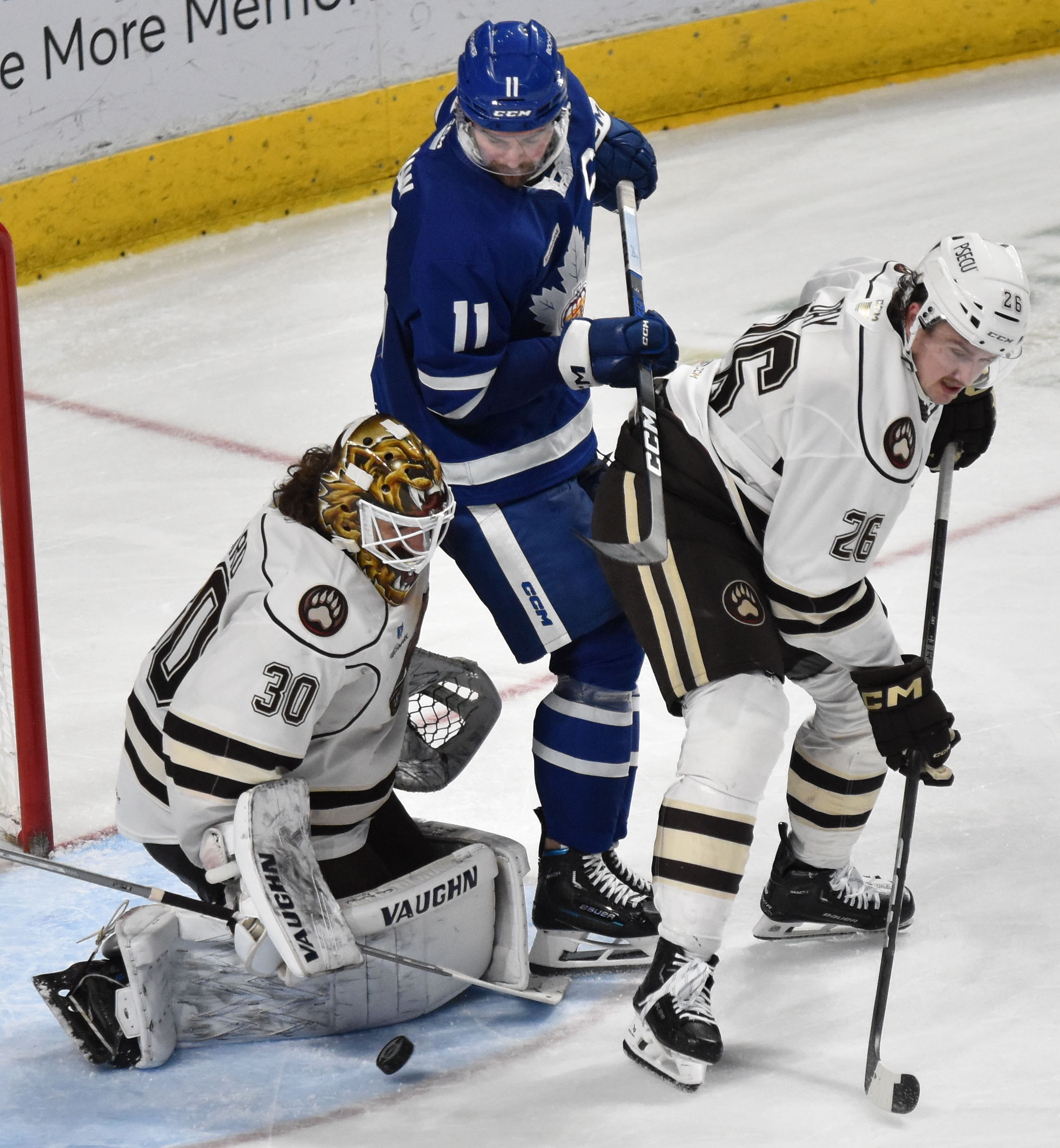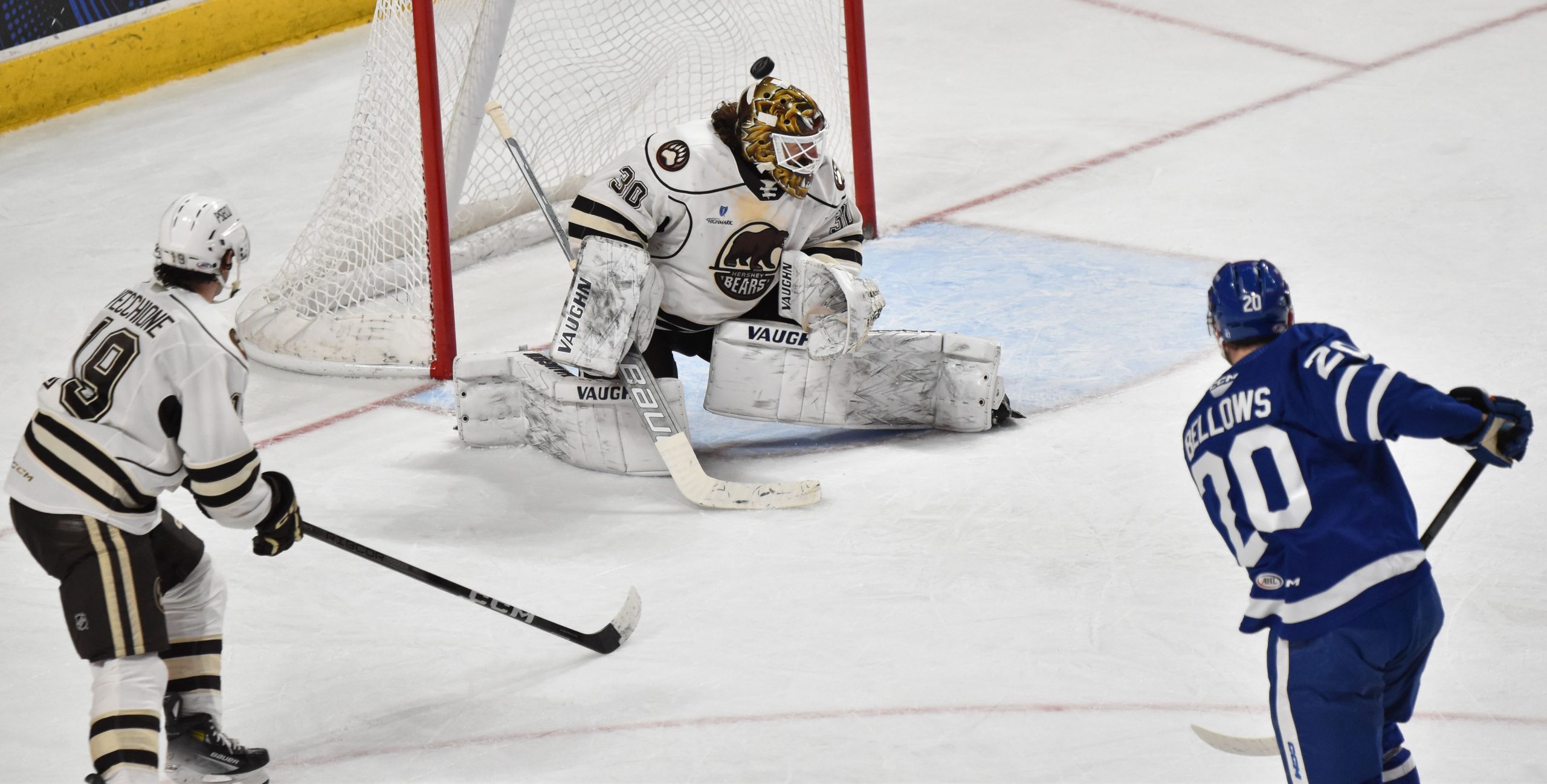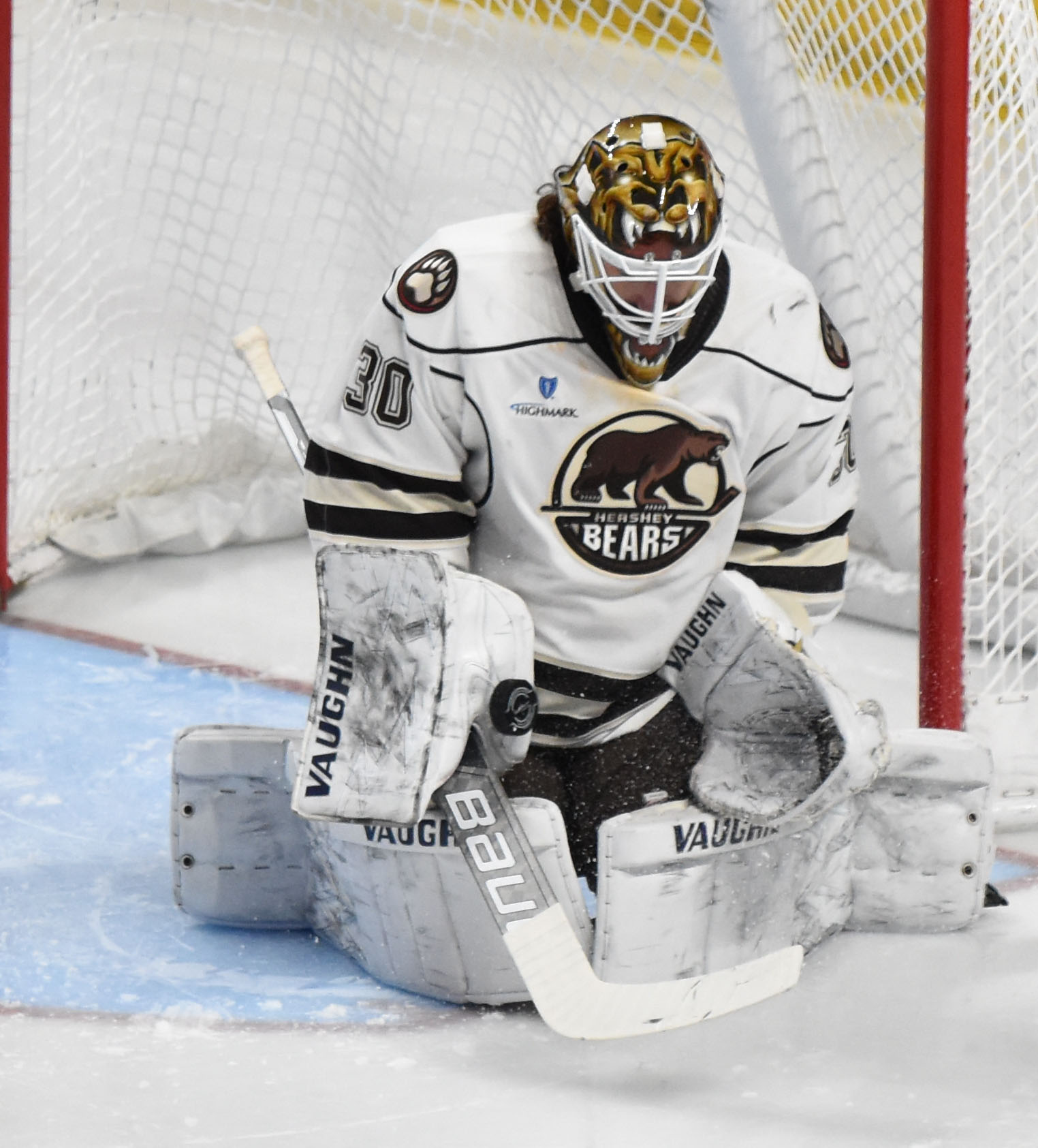 With Shepard pulled for an extra skater, the Bears were able to cycle the puck in the offensive zone – Mike Vecchione sent a cross-ice pass from the right side to Ivan Miroshnichenko at the left circle; Miroshnichenko’s shot on net was deflected at the crease by Huntington for the tying score at 19:40. The goal marked Huntington’s 100th career AHL point.