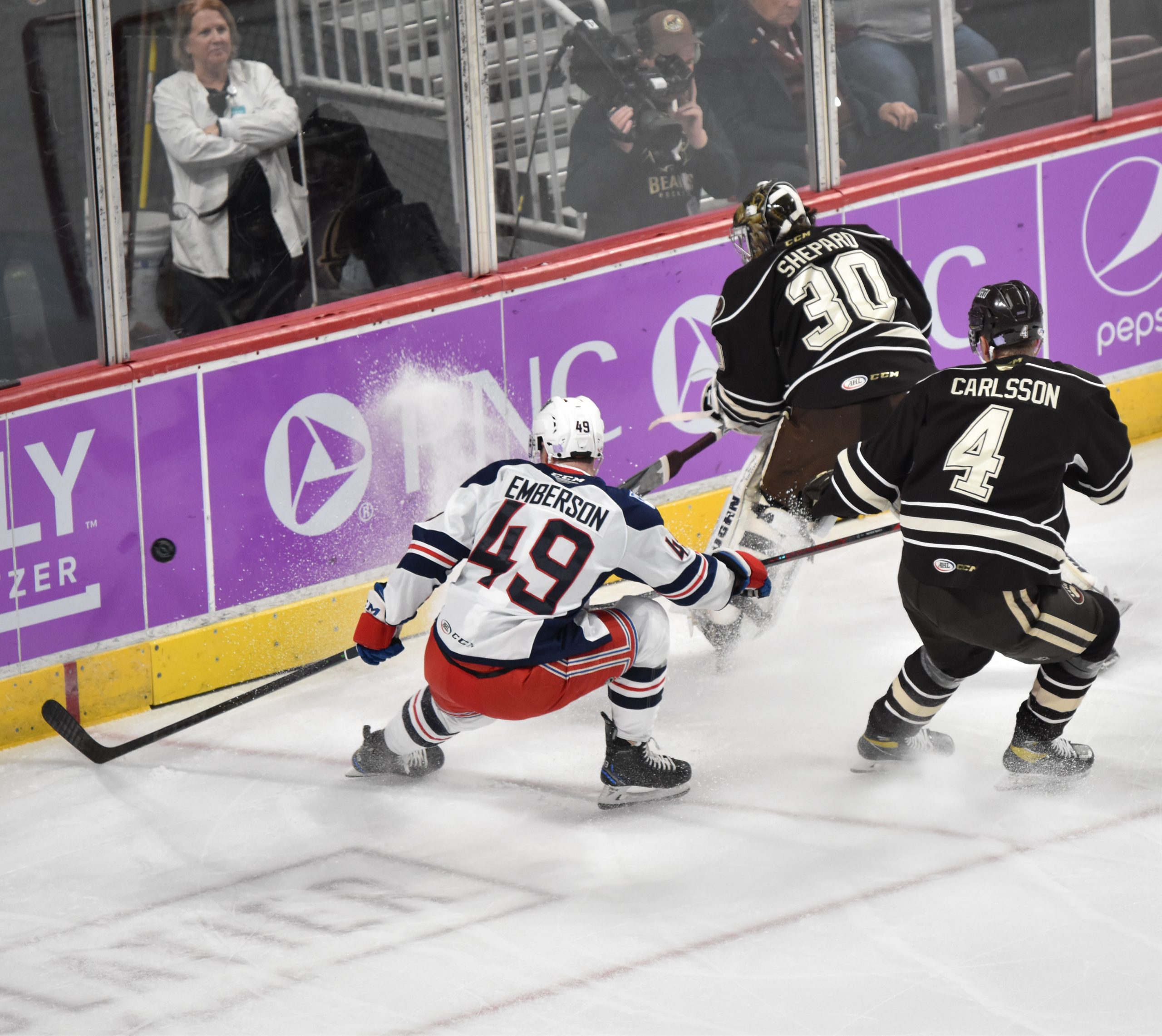 The Bears made it 6-1 at 19:46 when Hendrix Lapierre buried a Dylan McIlrath rebound that briefly went to video review when it appeared Garand got a piece of Lapierre’s shot with the paddle of his goalie stick, but it was confirmed that the puck had fully crossed the goal line, giving the Bears rookie his fourth of the season. Shane Gersich added the secondary helper.