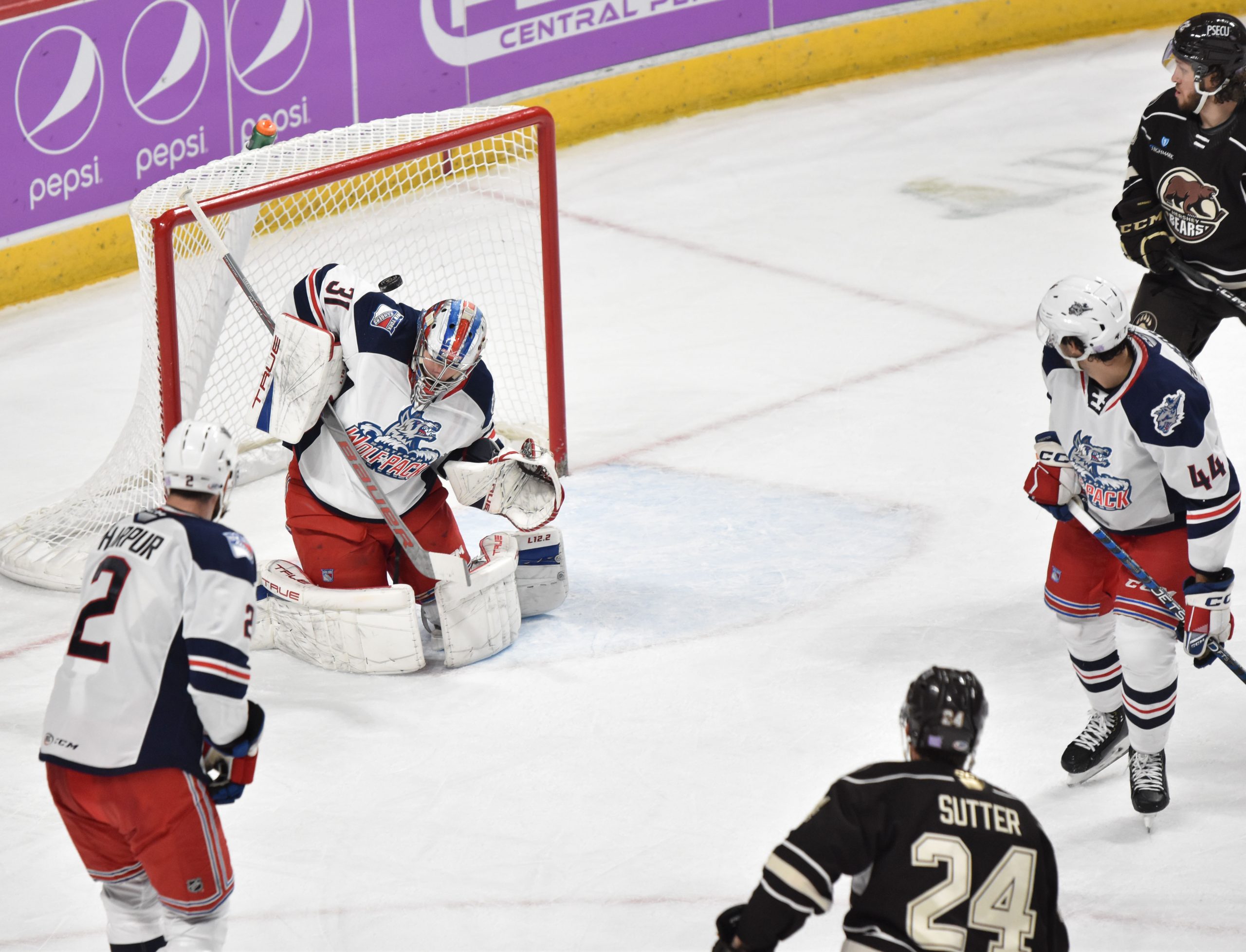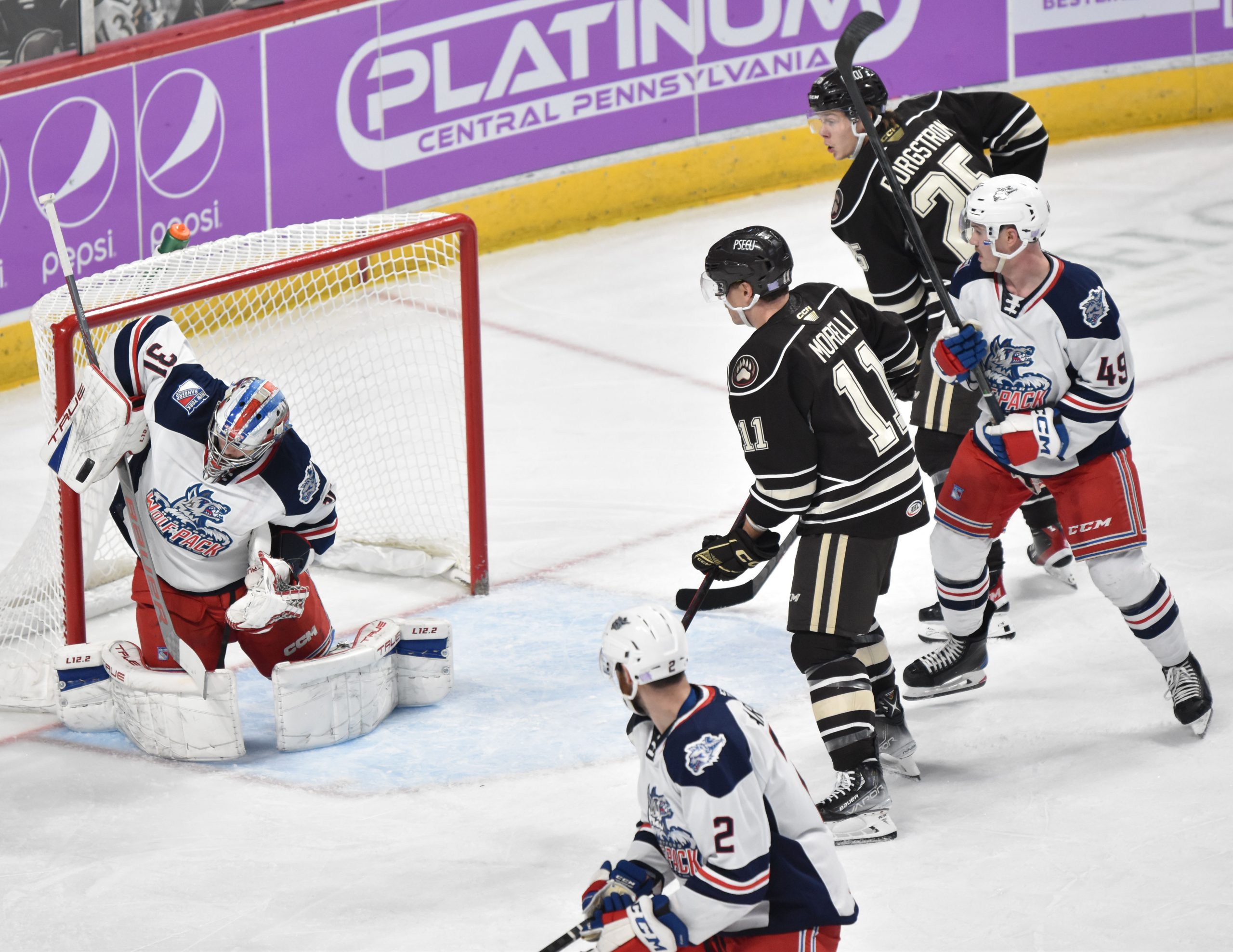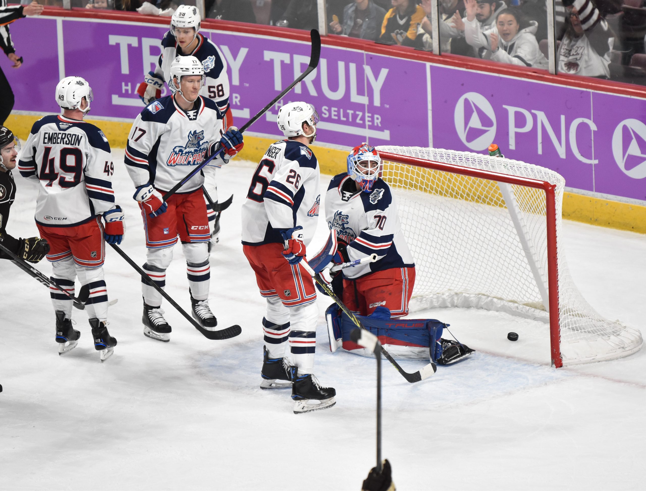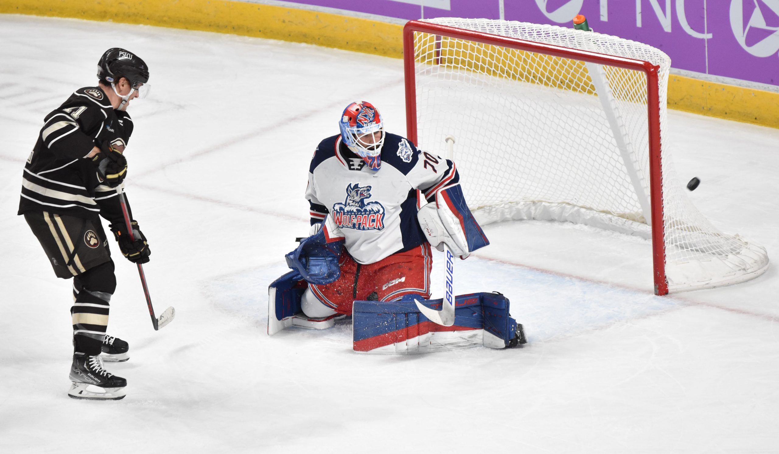 The Wolf Pack replaced Domingue in net with Dylan Garand to begin the second, but the Bears continued the onslaught, as Anas reached the century mark for career goals when he deflected Vincent Iorio’s shot from the right point past Garand at 5:50 for his fourth of the season. Gabriel Carlsson received credit for the secondary assist.