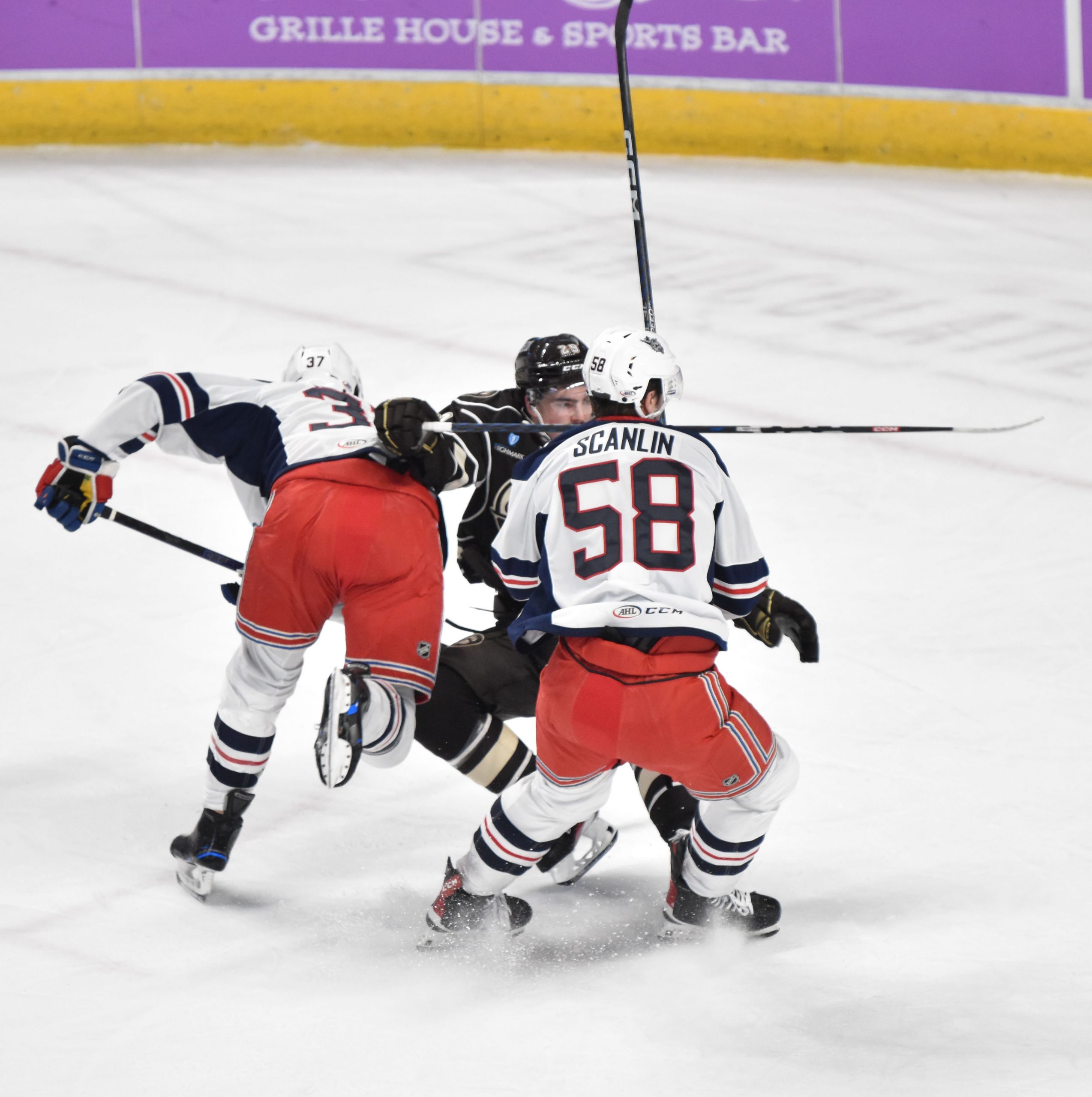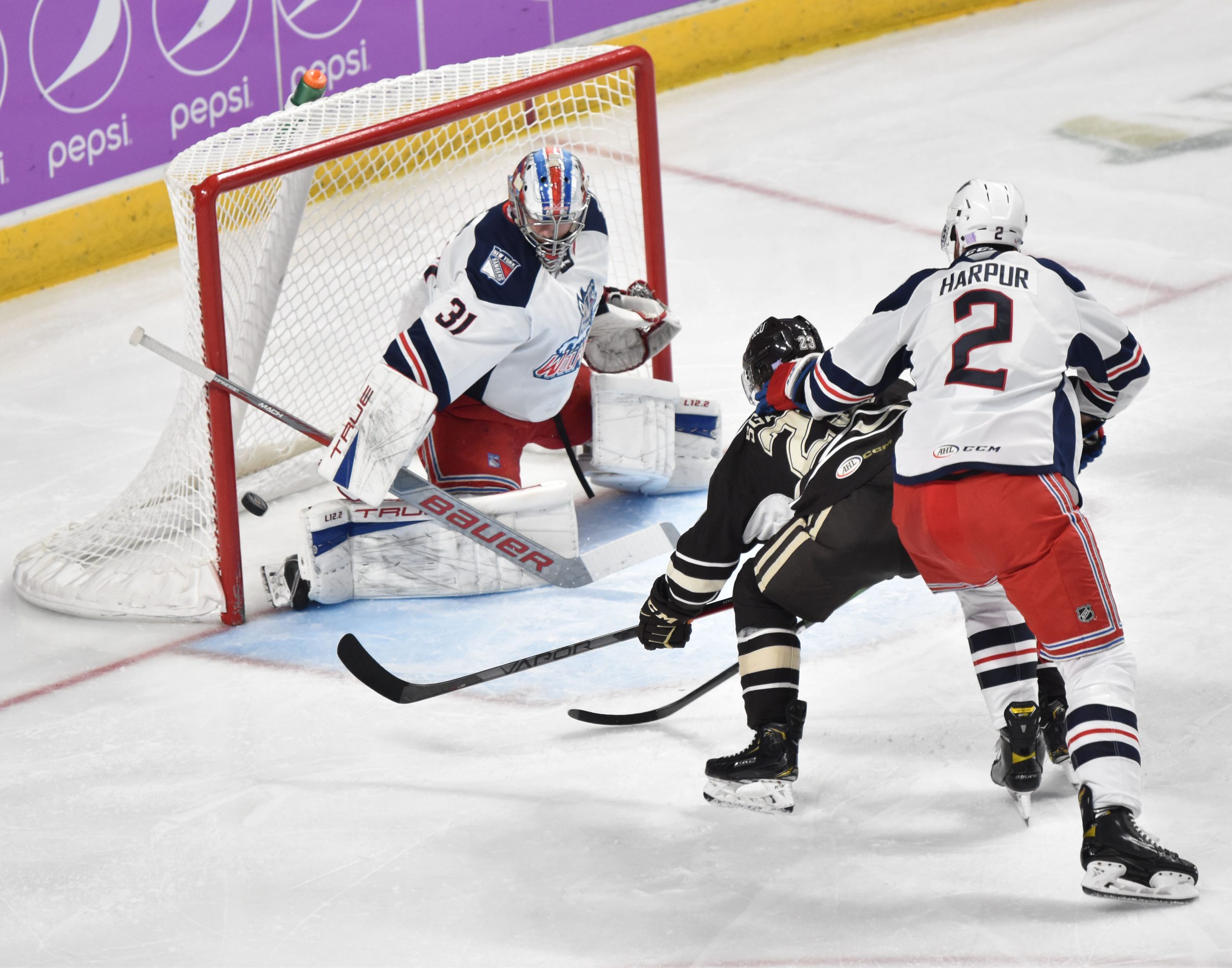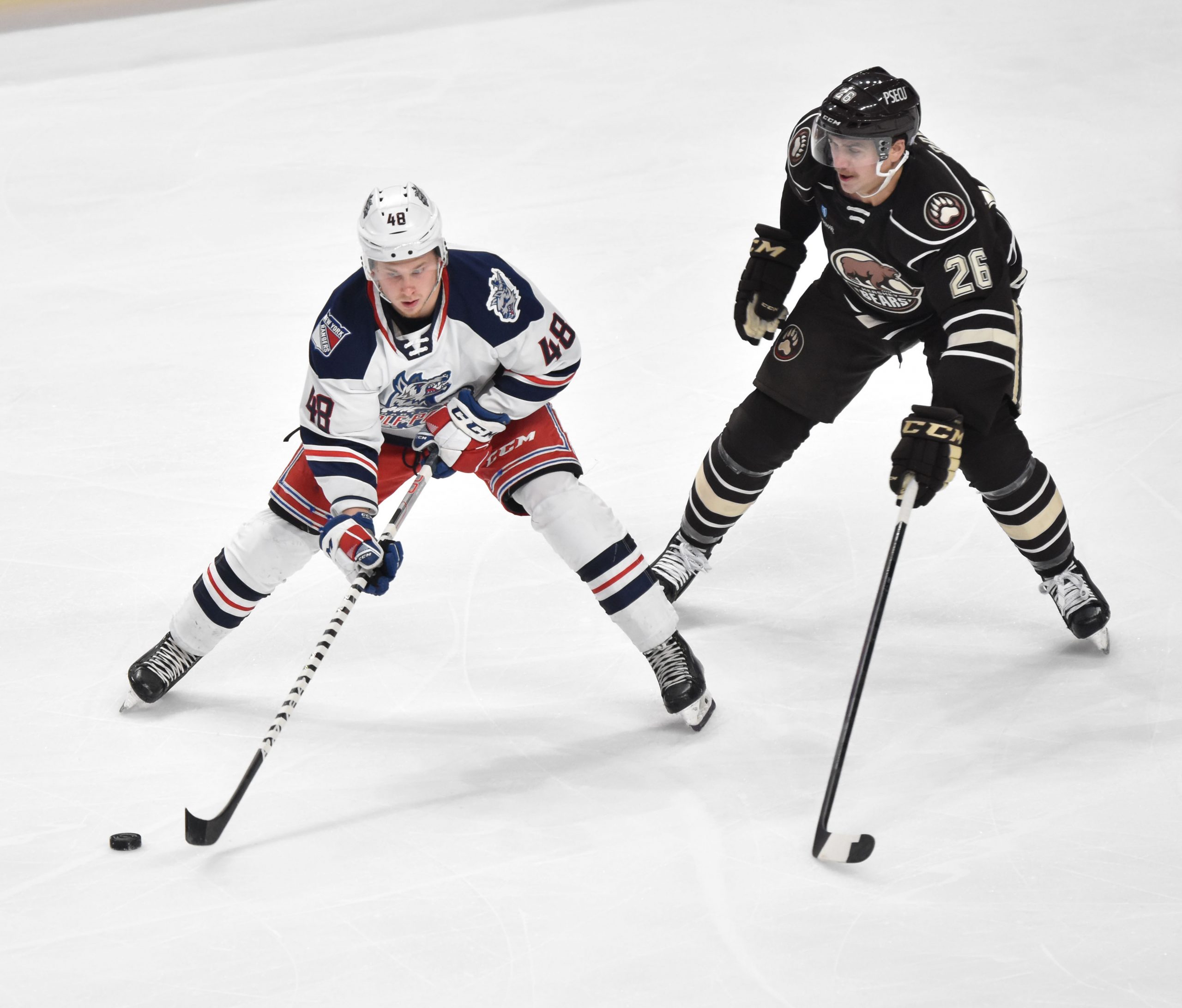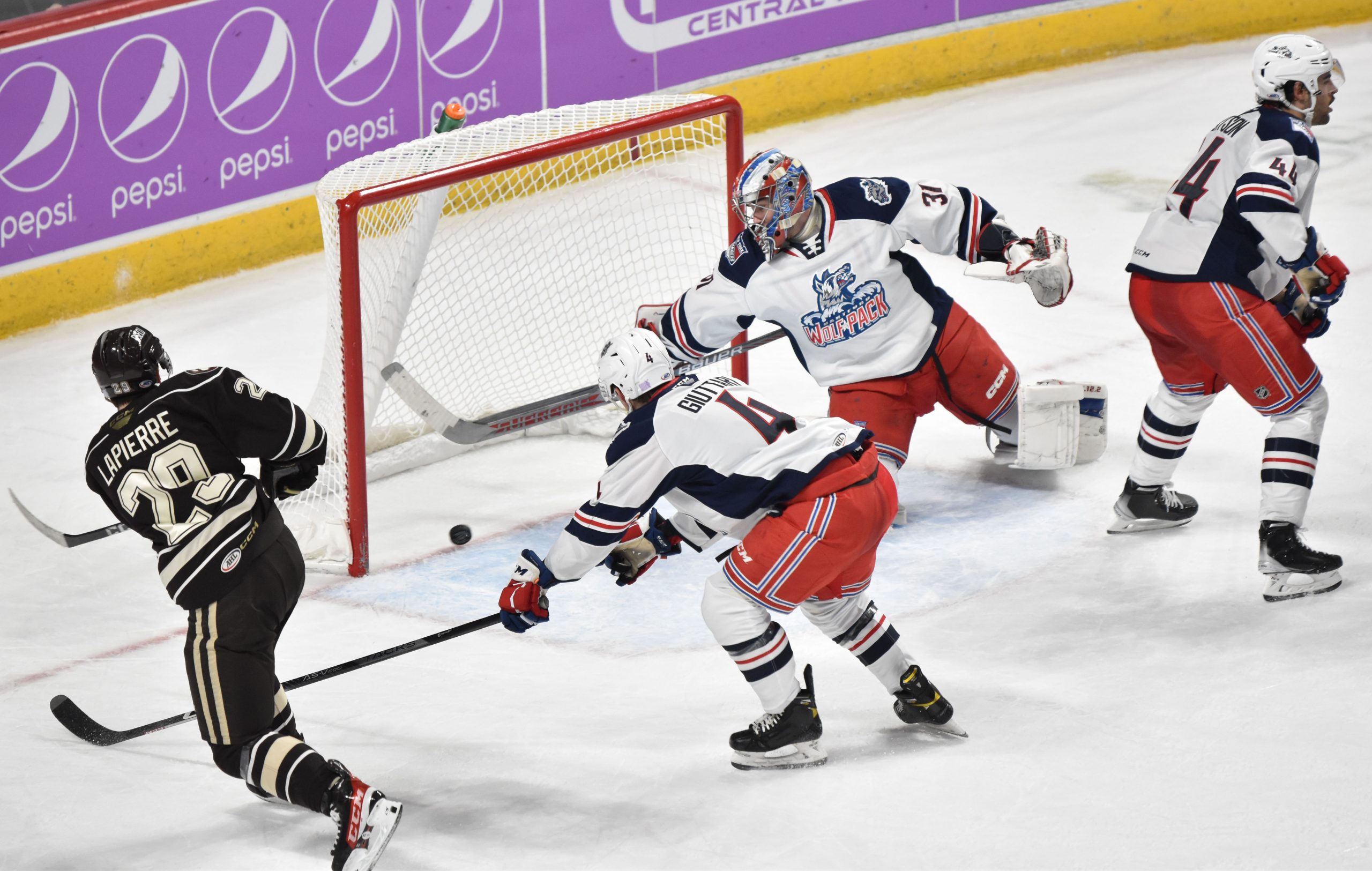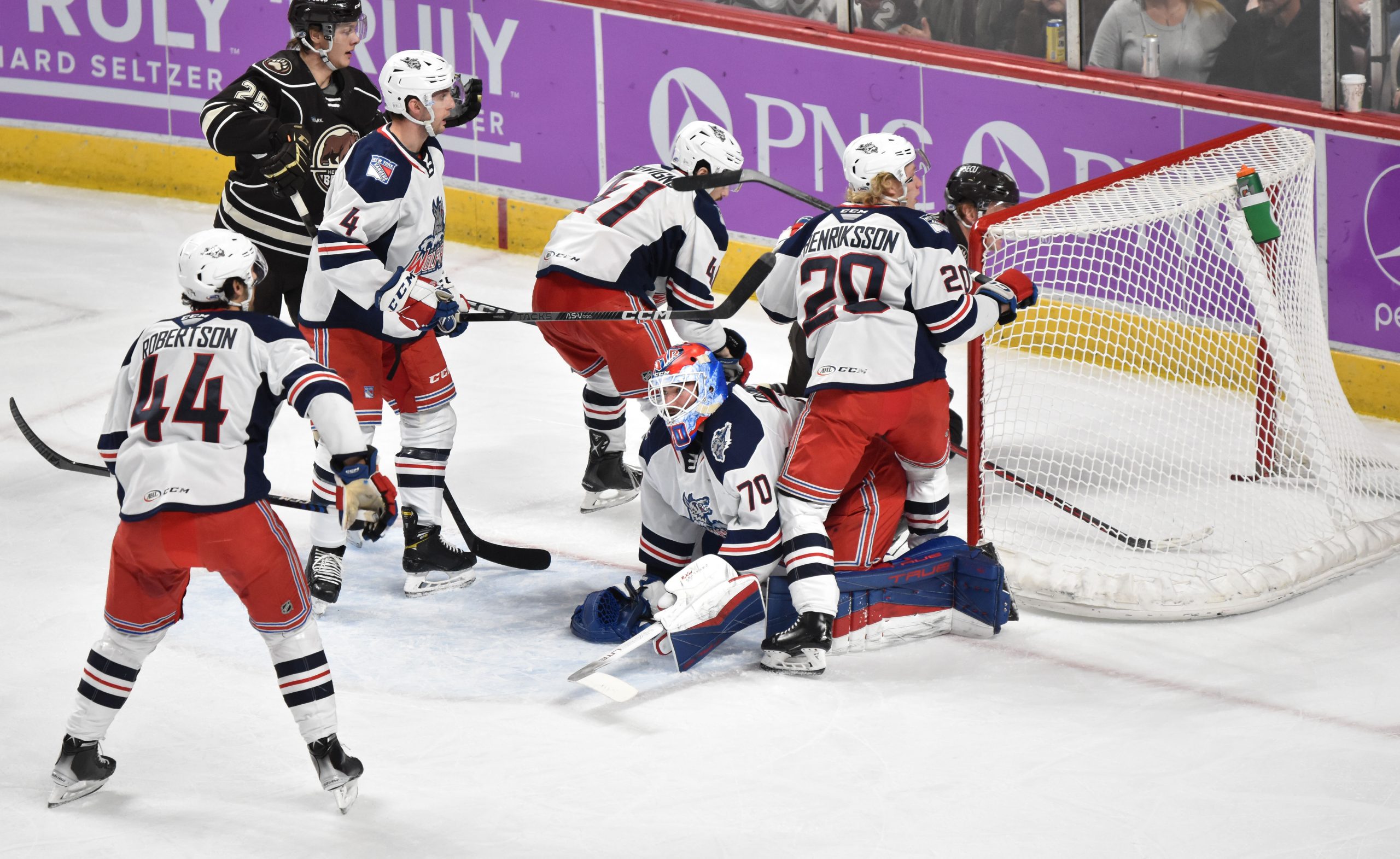 The Wolf Pack replaced Domingue in net with Dylan Garand to begin the second, but the Bears continued the onslaught, as Anas reached the century mark for career goals when he deflected Vincent Iorio’s shot from the right point past Garand at 5:50 for his fourth of the season. Gabriel Carlsson received credit for the secondary assist.