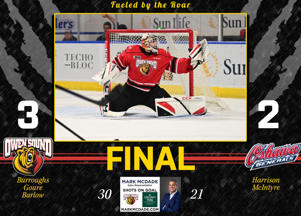 Captain Colby Barlow scored the gaming winning goal off a set stretch pass play with under four minutes to play in the third period, and the Owen Sound Attack held off a late push by the Oshawa Generals for a 3-2 win.