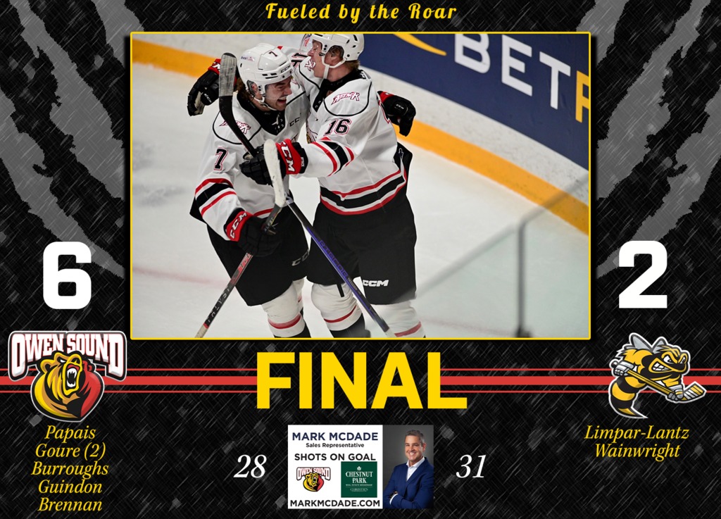 It wasn’t a perfect game in any means by the Bears, as they were forced to kill off eight Sarnia power plays, but a strong PK group along with George in net, iced the Sting’s extra man, as Owen Sound went a perfect 8-for-8 shorthanded. Though taking a high amount of penalties, the Attack never deterred from their aggressive style, taking the game to Sarnia from start to finish.