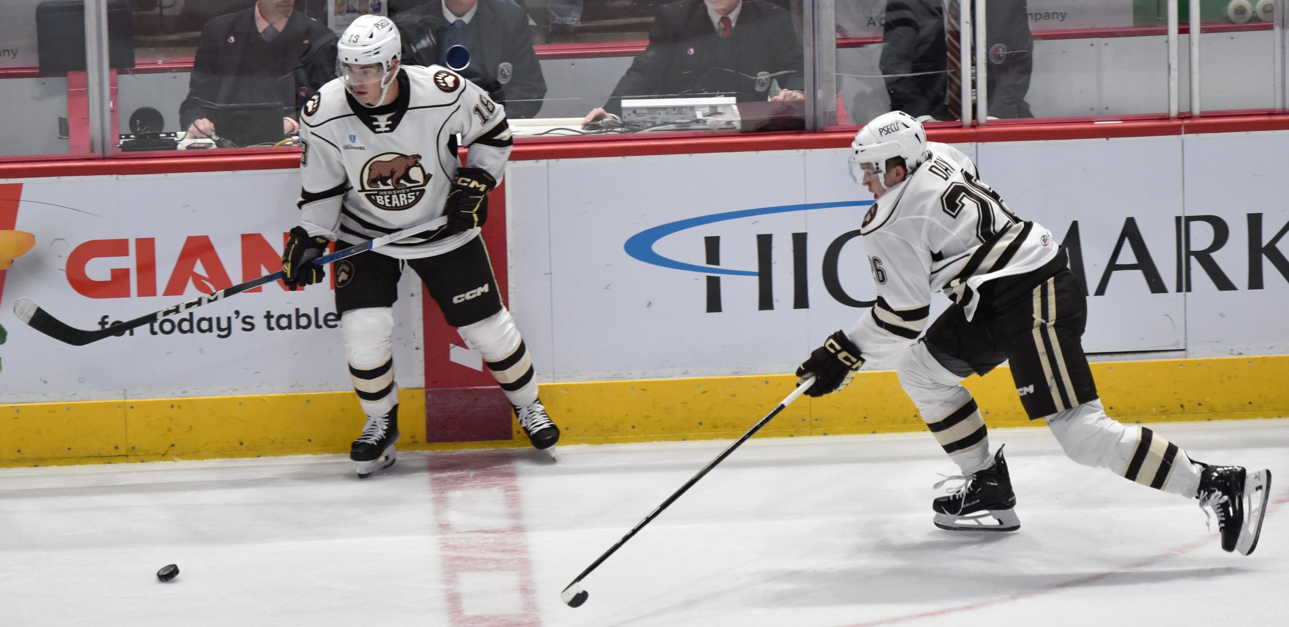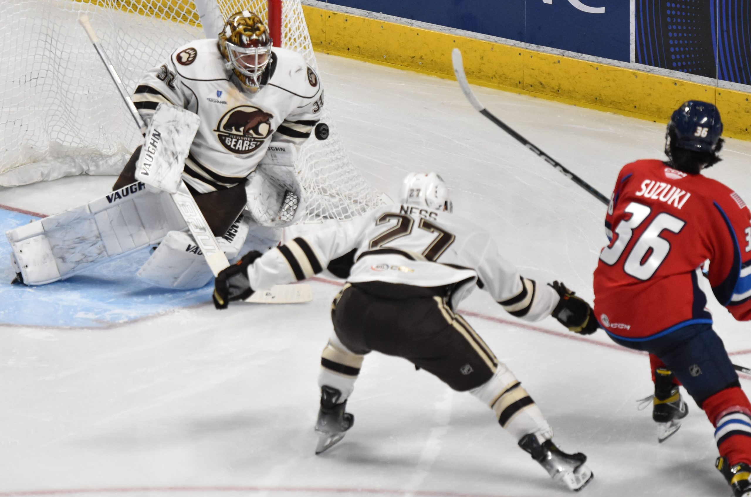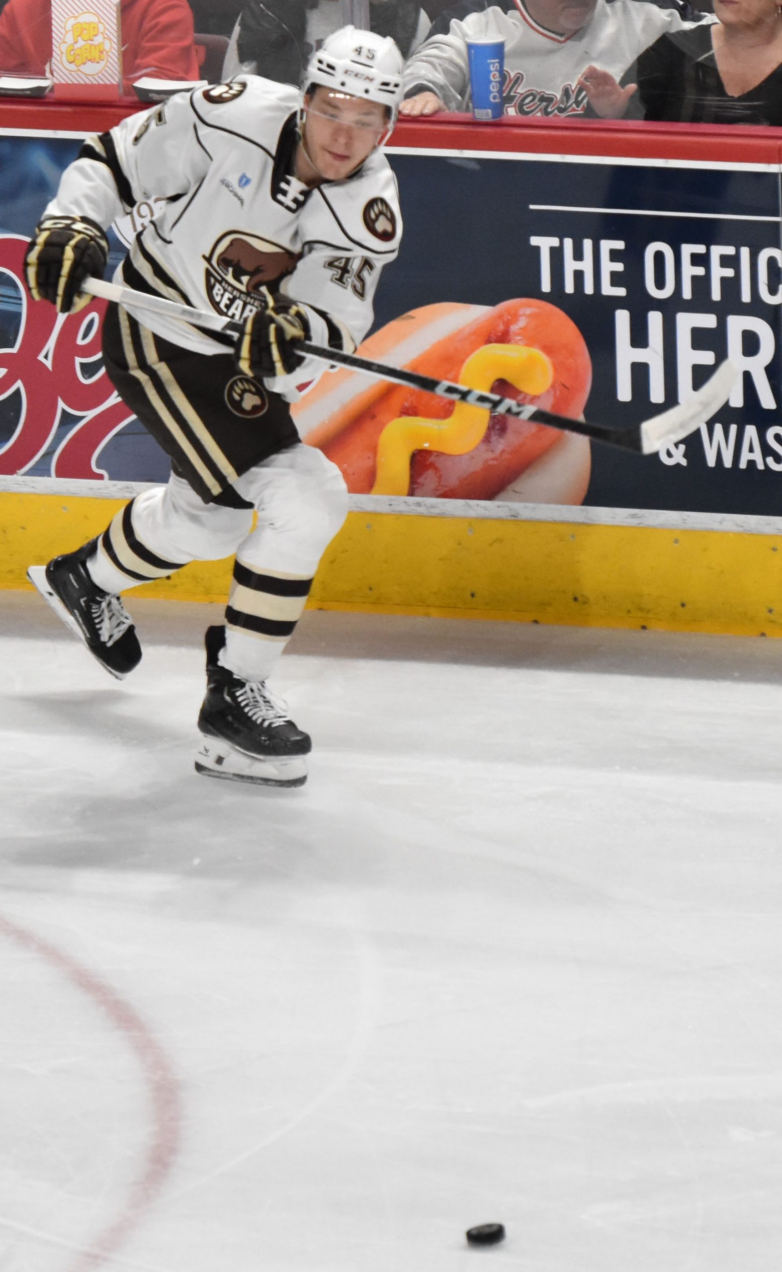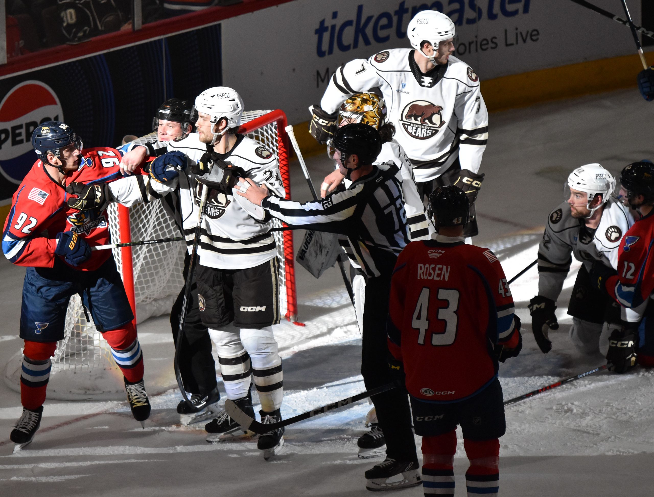 The first period began with a spirited bout between Bears captain Dylan McIlrath and Thunderbirds forward Sam Bitten at 3:21 that lasted for over half a minute before McIlrath knocked Bitten down to the left of the Hershey bench.