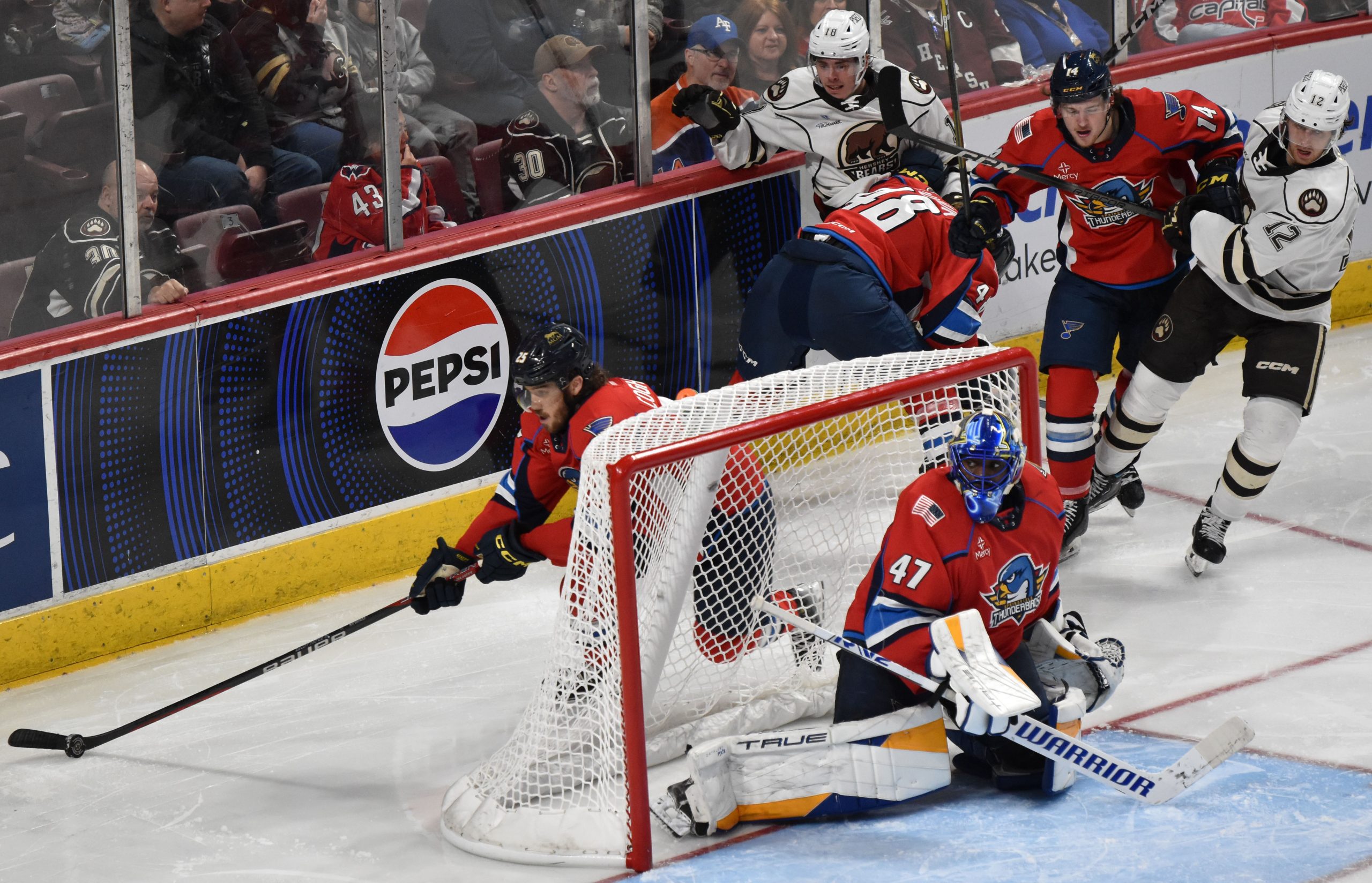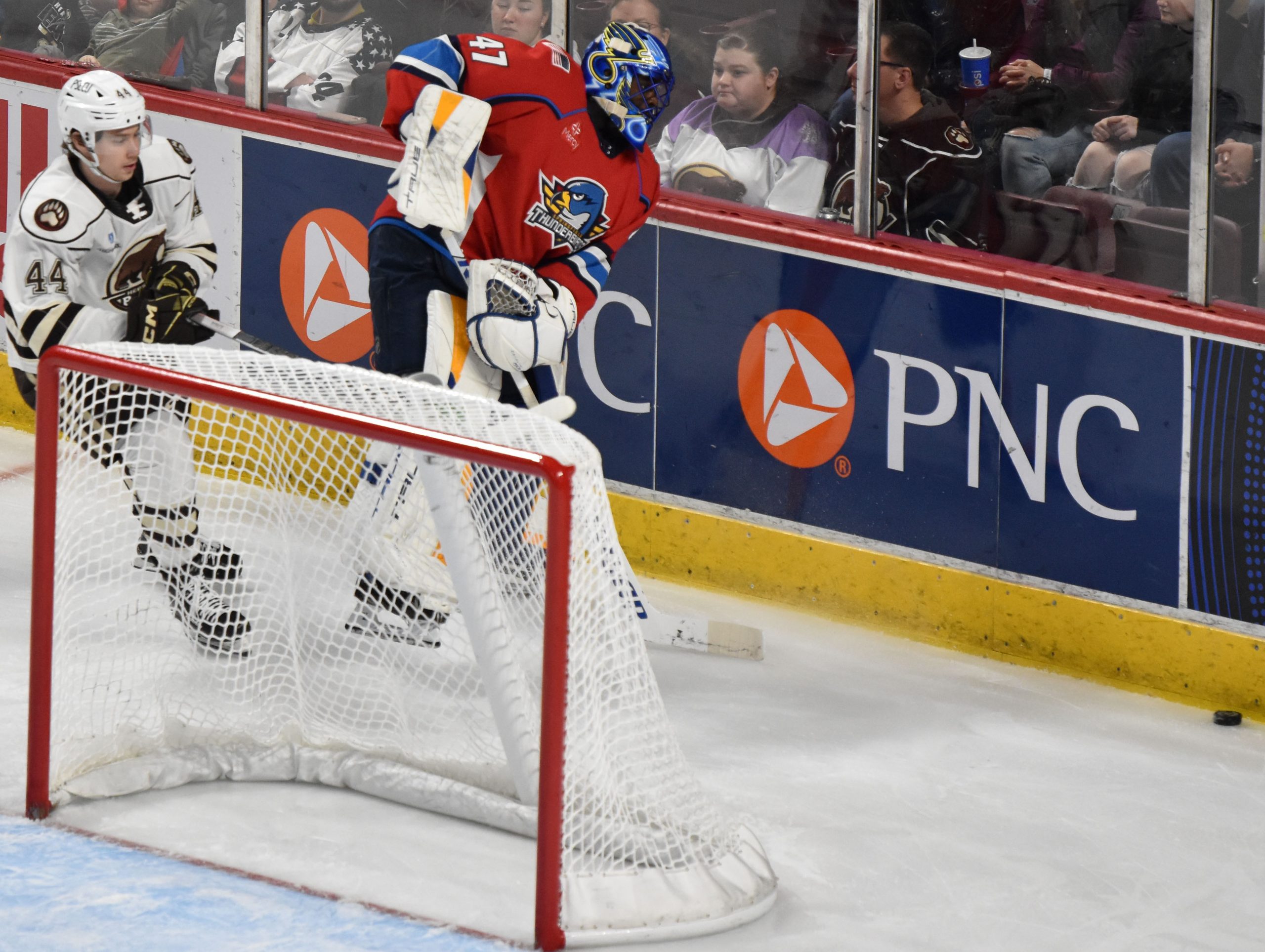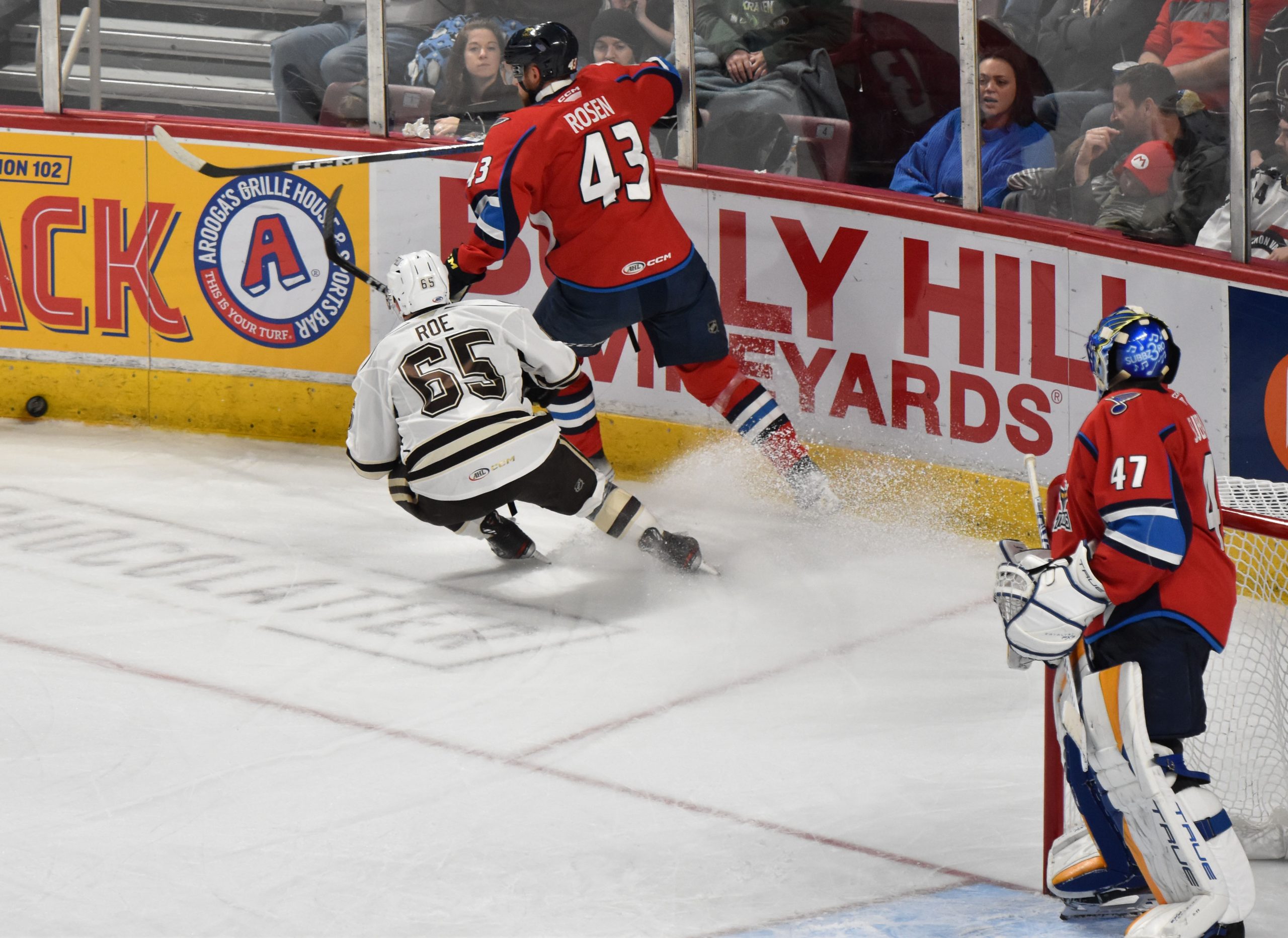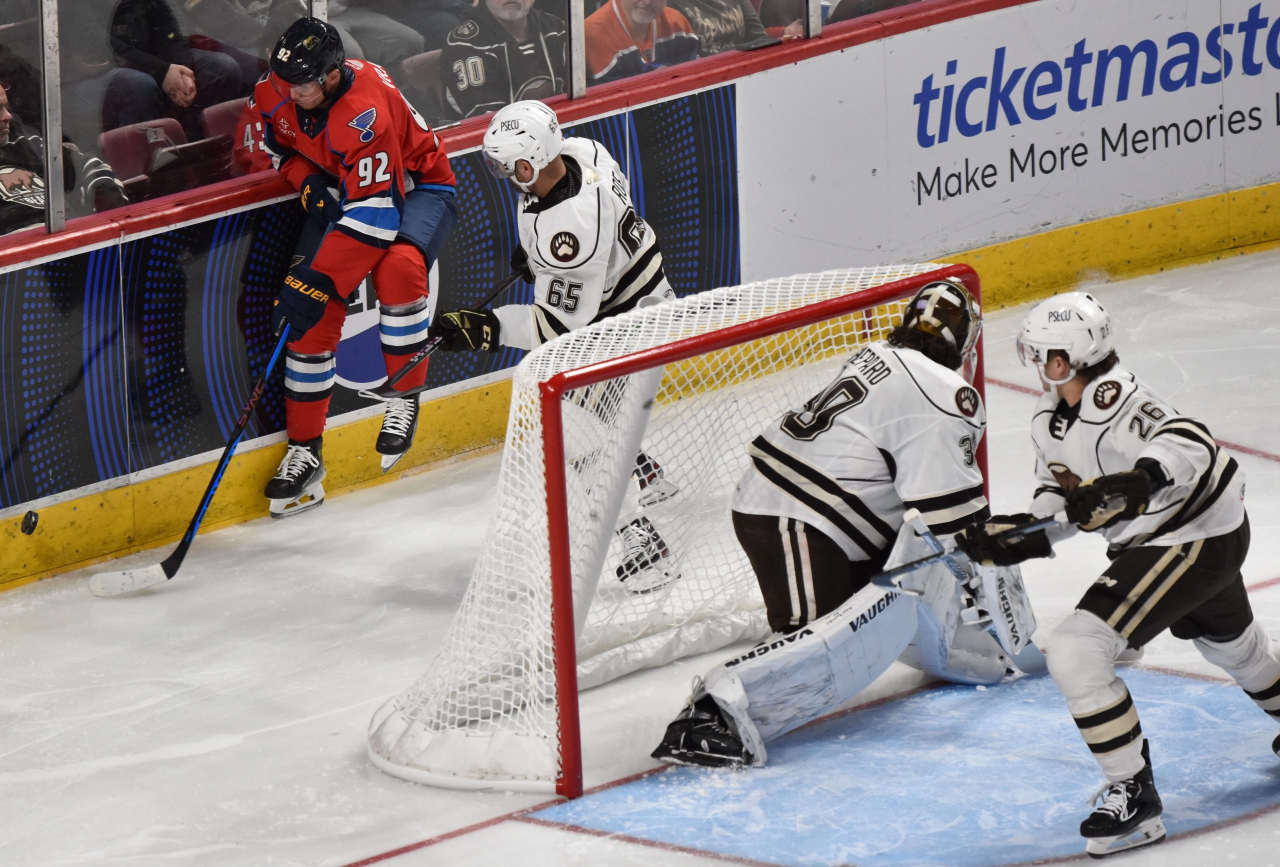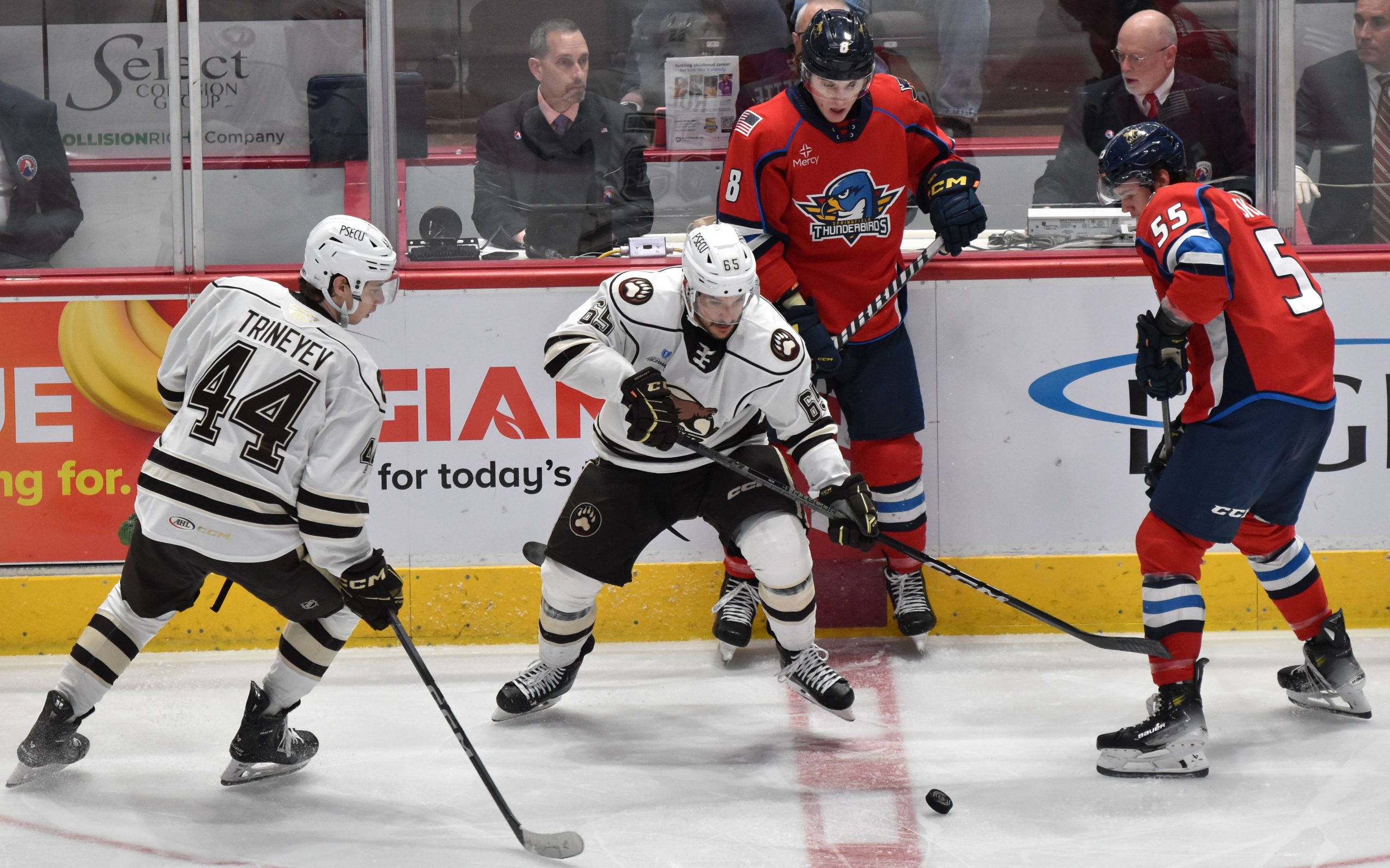 The first period began with a spirited bout between Bears captain Dylan McIlrath and Thunderbirds forward Sam Bitten at 3:21 that lasted for over half a minute before McIlrath knocked Bitten down to the left of the Hershey bench.