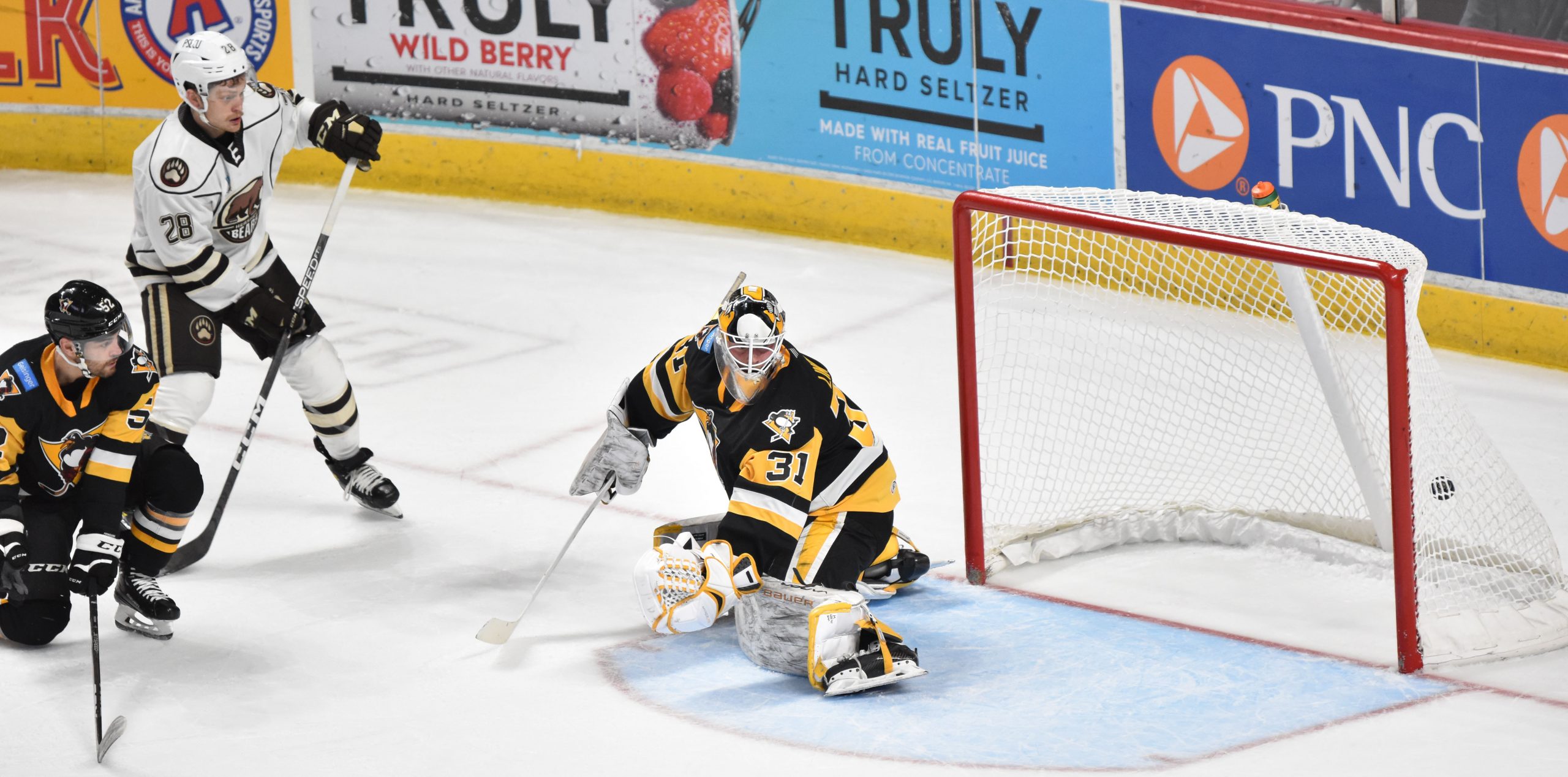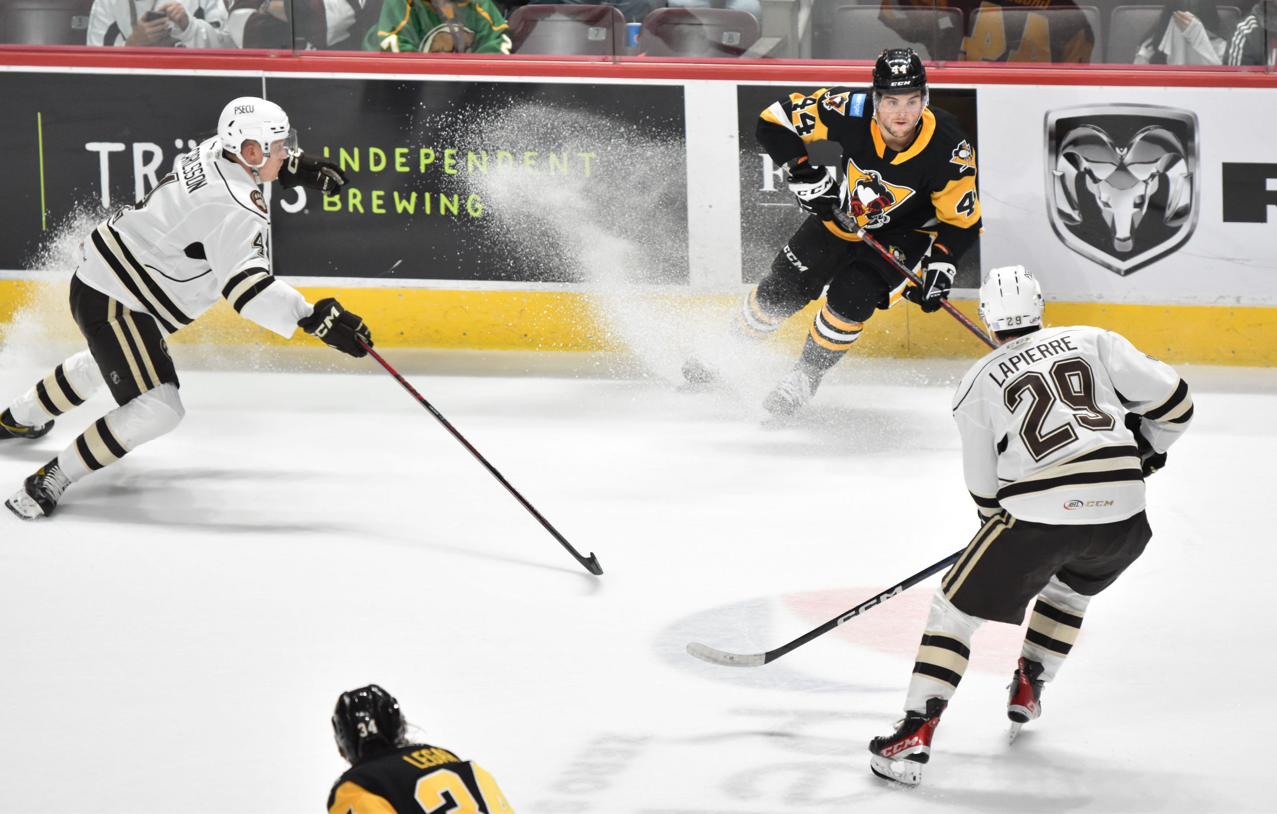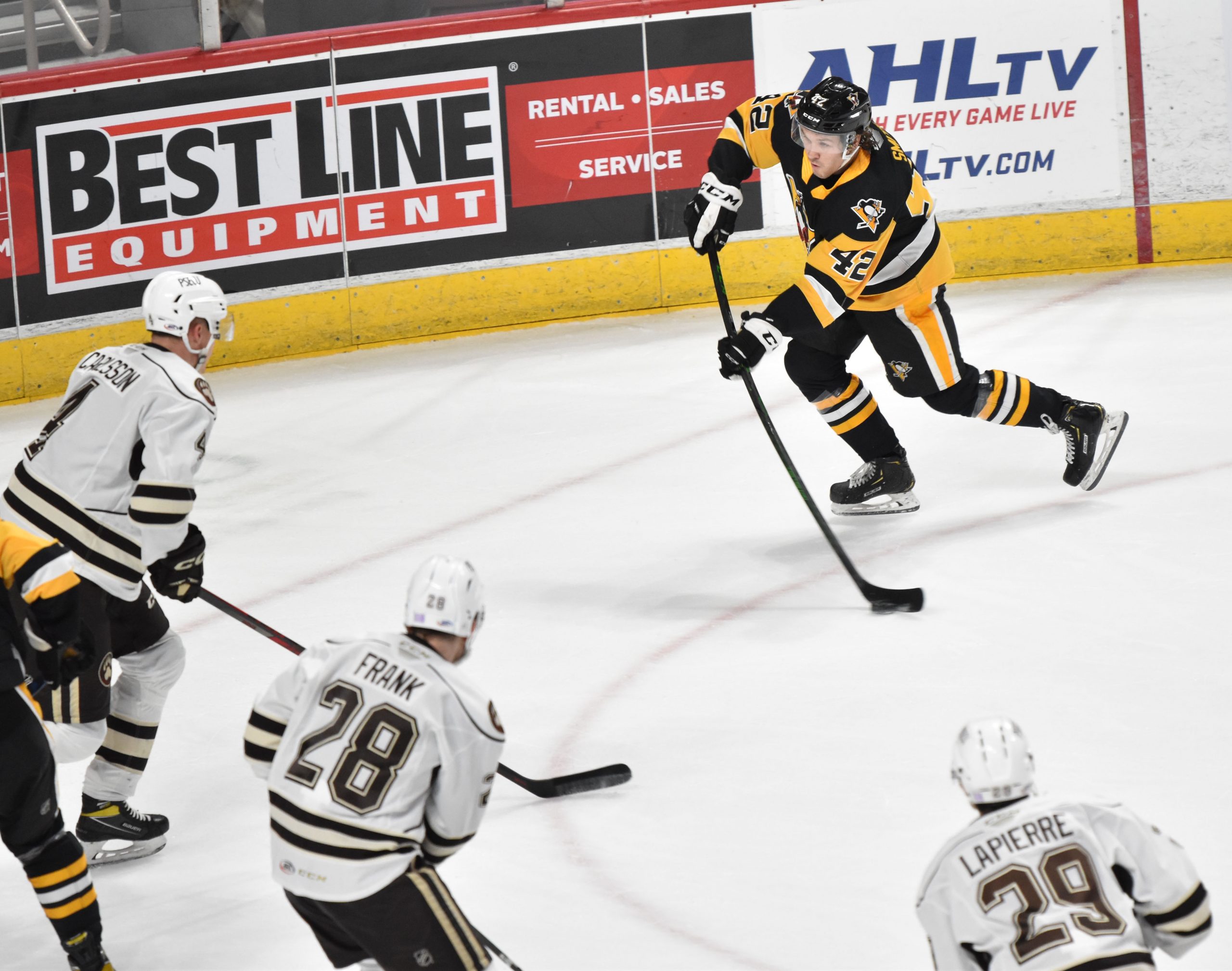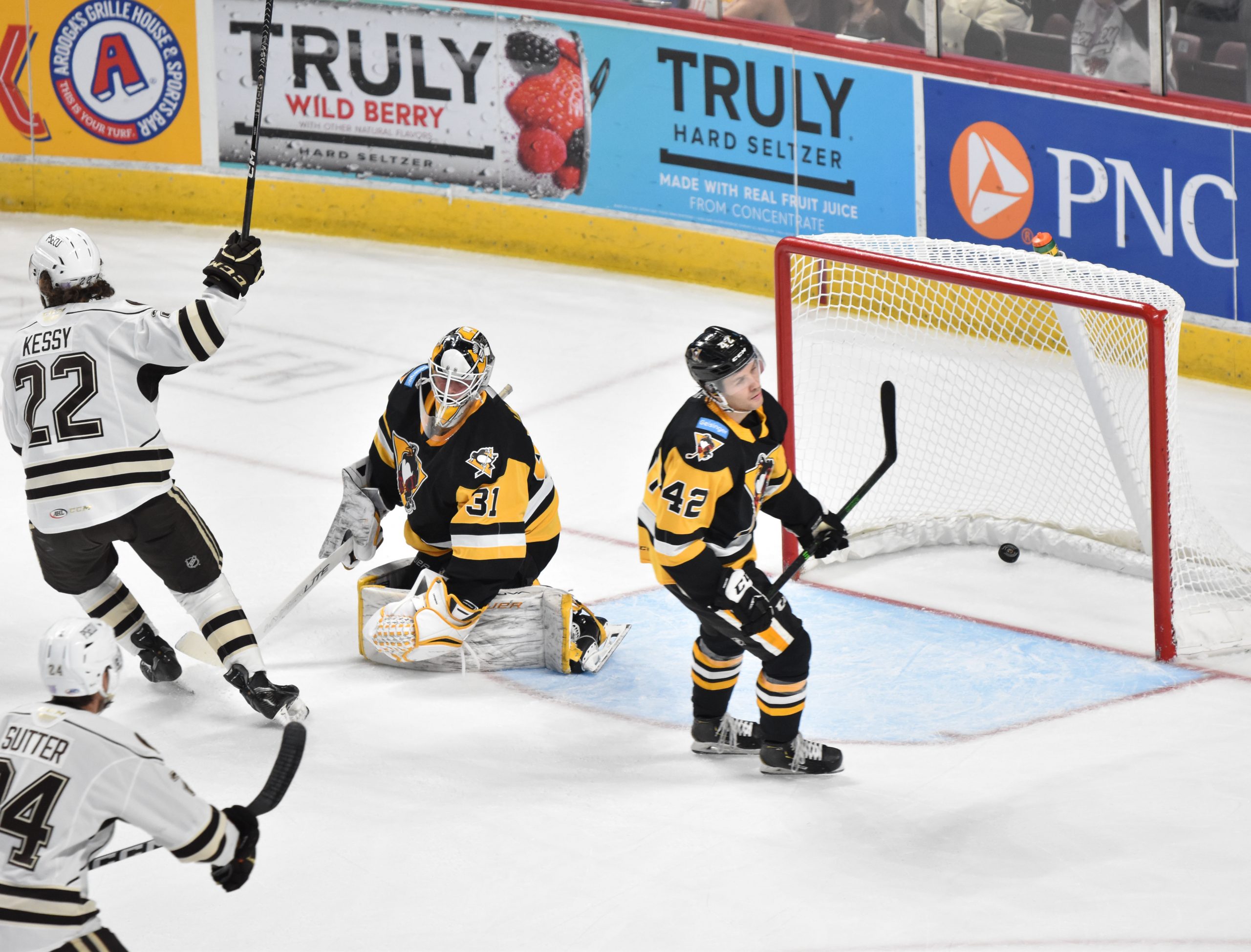 Jonathan Gruden got the Penguins on the board just 13 seconds into the third as Filip Hallander fed the Wilkes-Barre/Scranton forward from beneath the goal line, and Gruden managed to beat Hunter Shepard above the blocker.