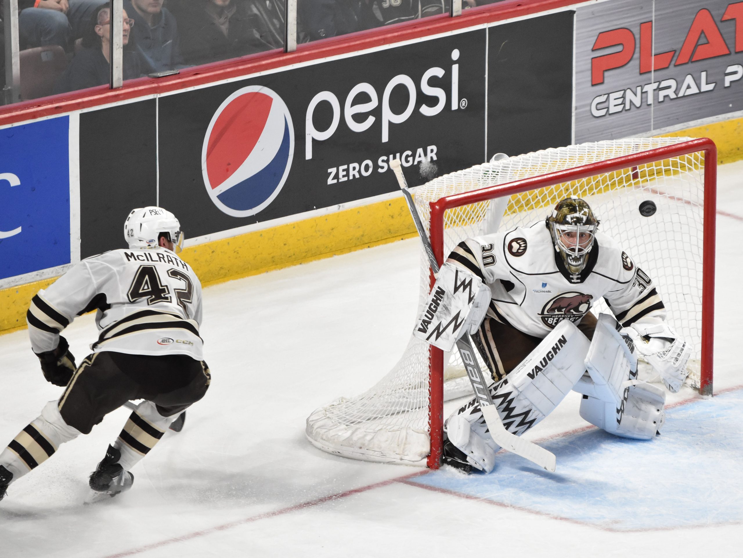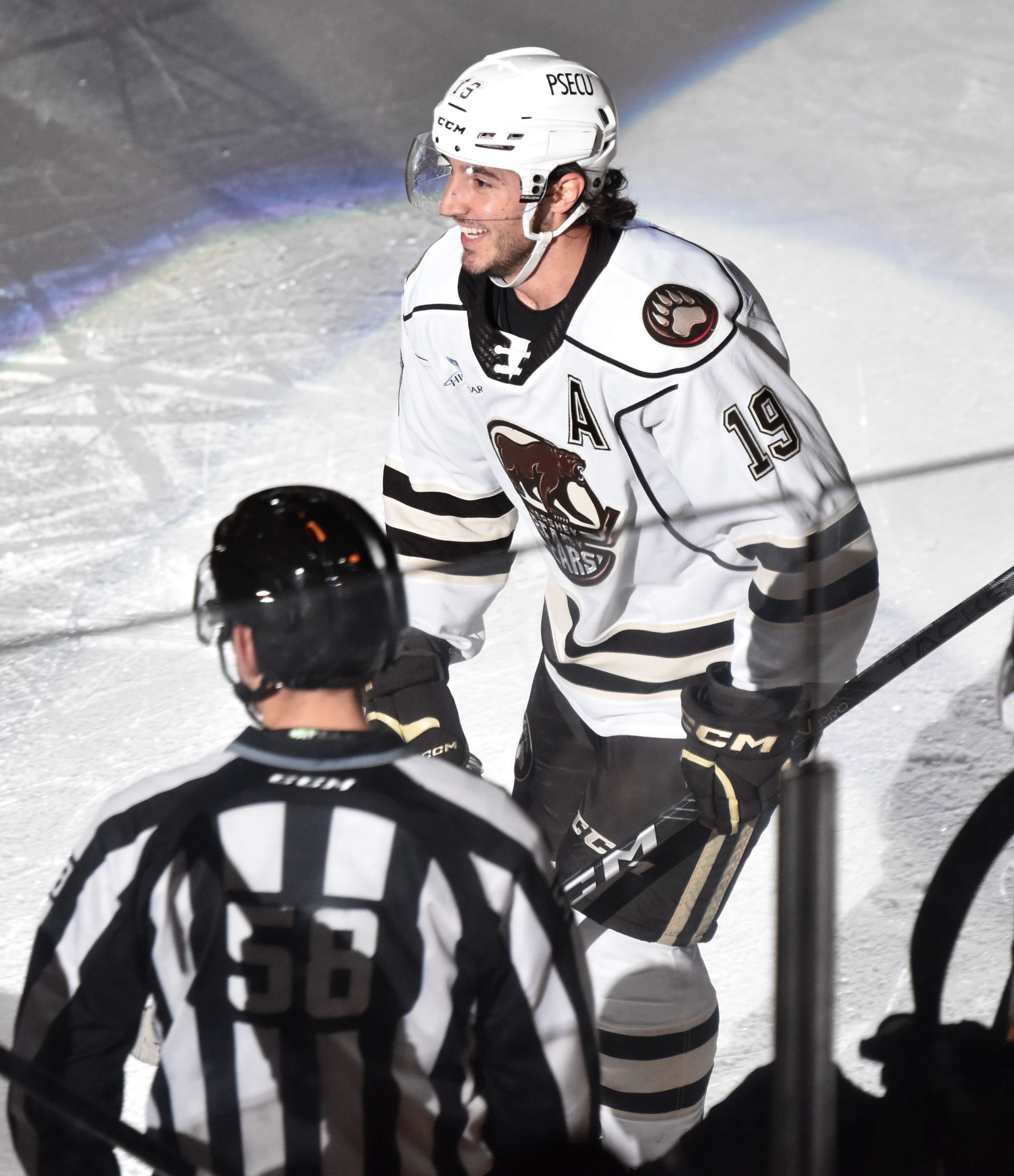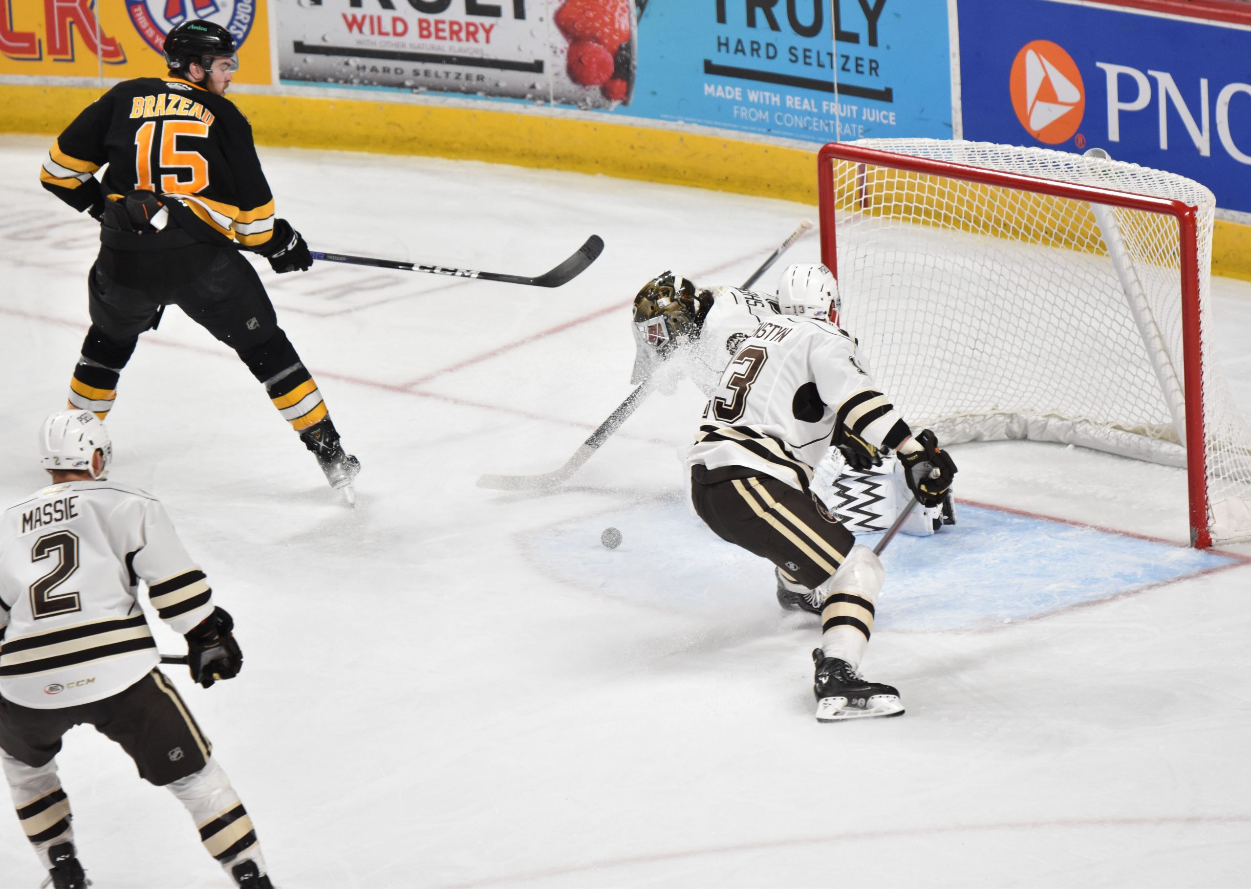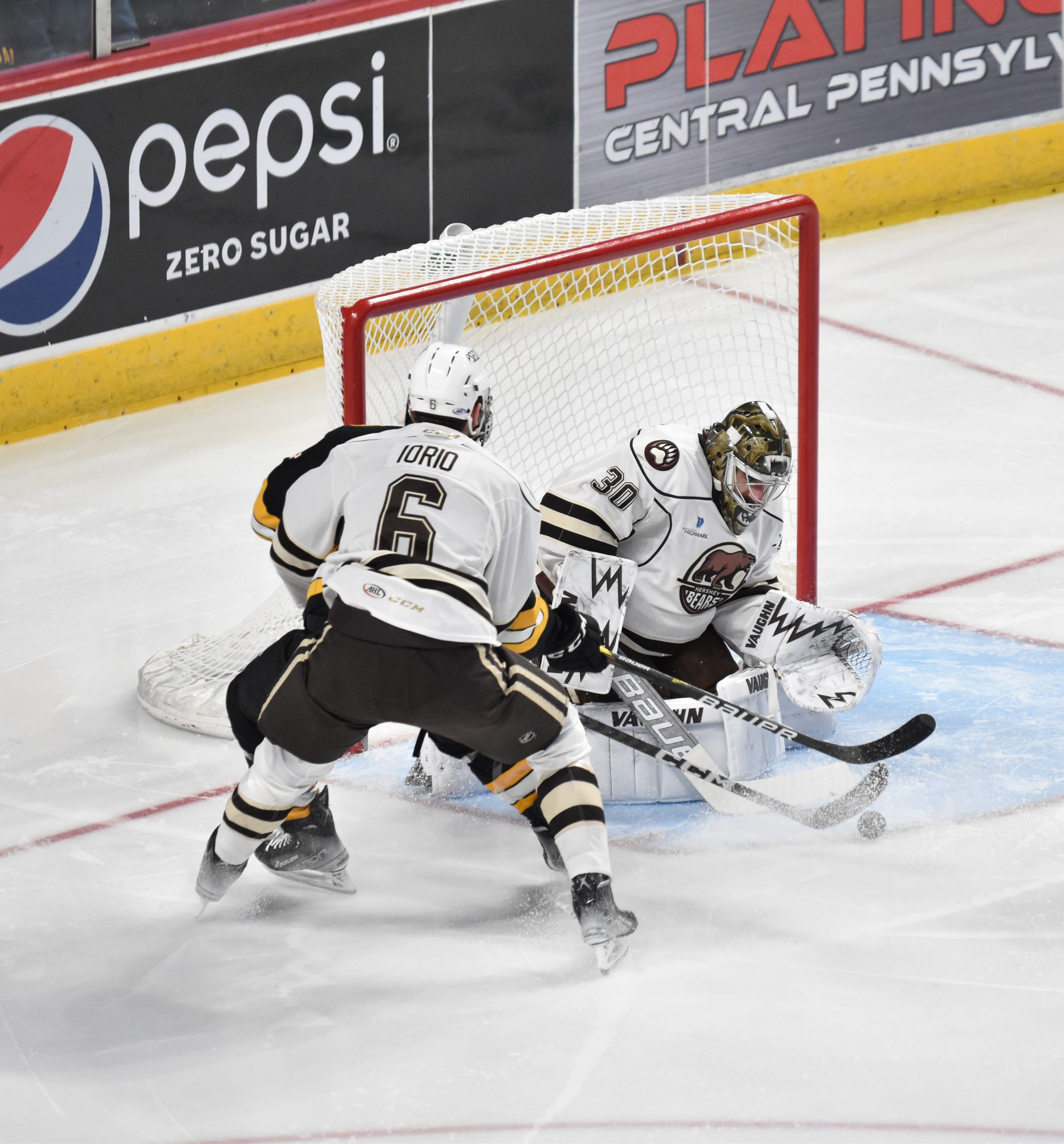 Hershey took a 1-0 lead 12:59 into the first period when Jake Massie found Vecchione in the slot, and the forward wristed the puck past the glove of Brandon Bussi into the top-right corner of the net for his team-leading 12th of the season. Vincent Iorio received credit on the secondary assist.