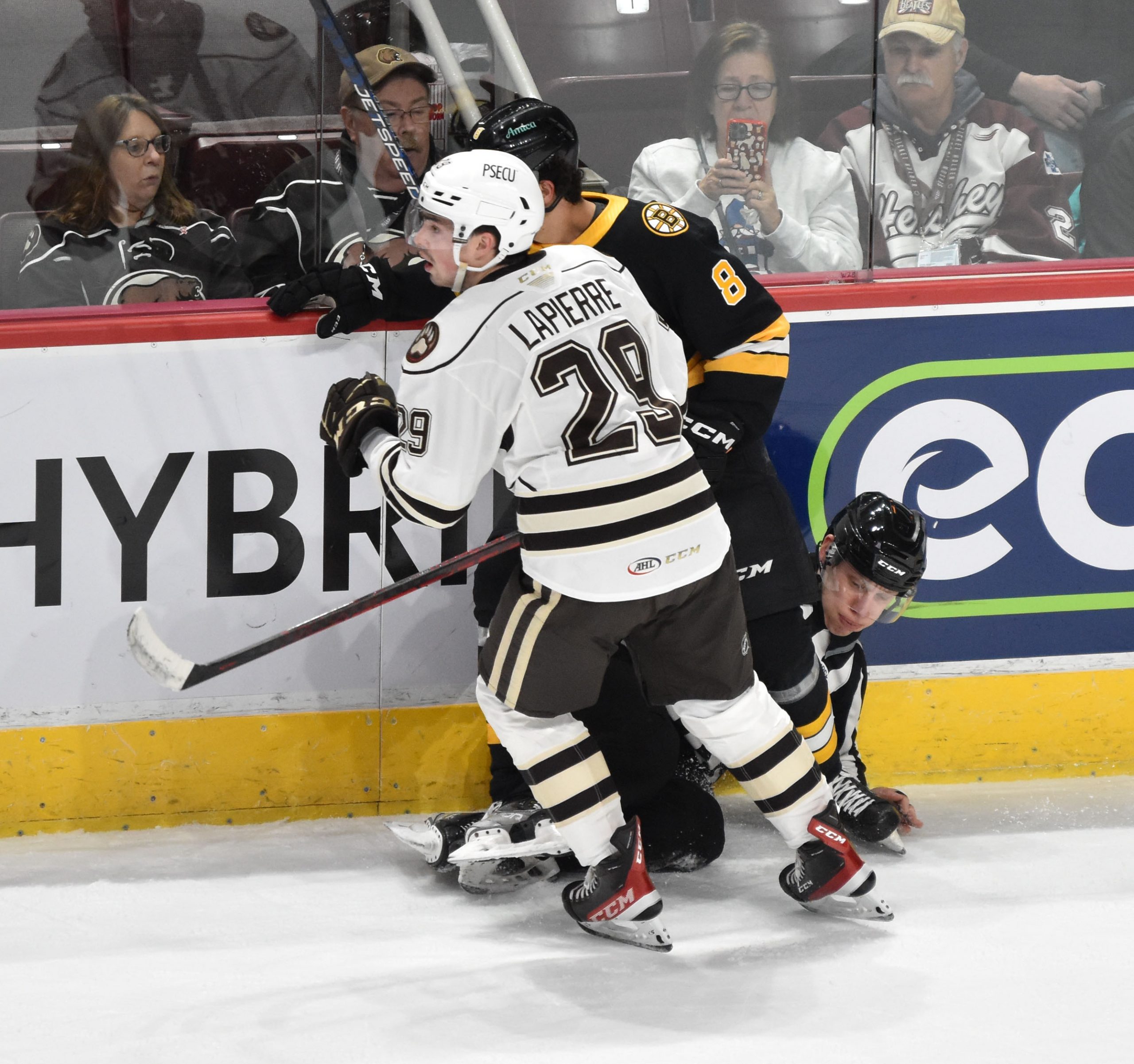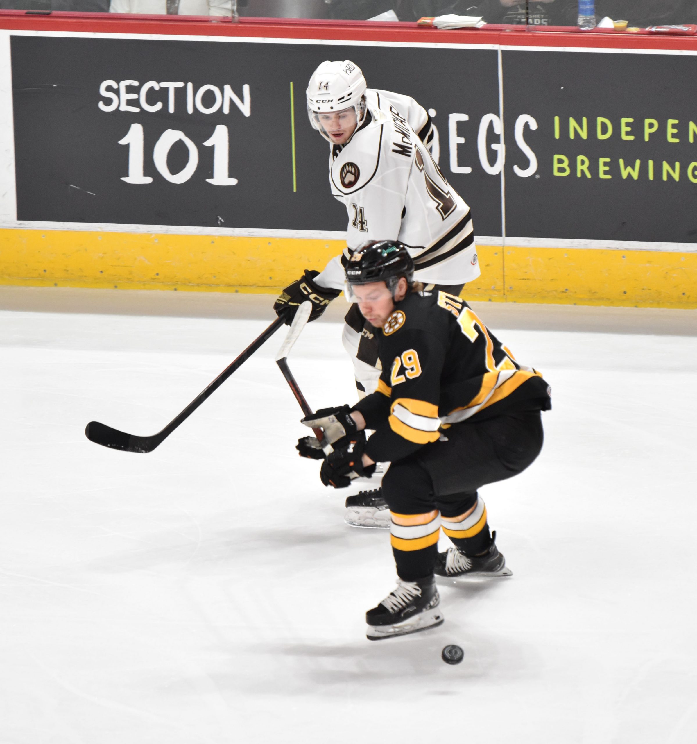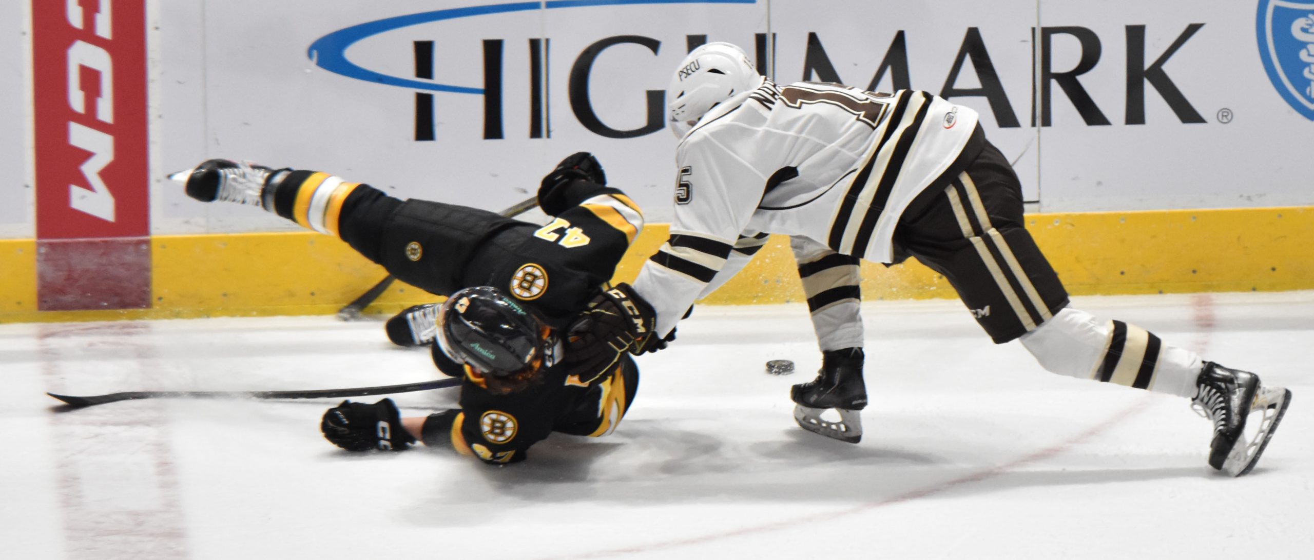 A check by Providence’s Chris Wagner on Bears forward Connor McMichael along the boards in the neutral zone at 15:09 of the second period prompted a scrap between Mason Morelli and Wagner. The resulting penalties levied a match penalty to Wagner for a check to the head and a five-minute fighting major, while Morelli received a 10-minute misconduct for instigating, a five-minute fighting major and a two-minute minor for instigating. Morelli finished the night with a career-high 19 penalty minutes.