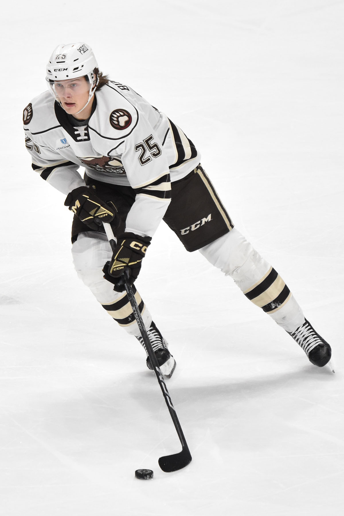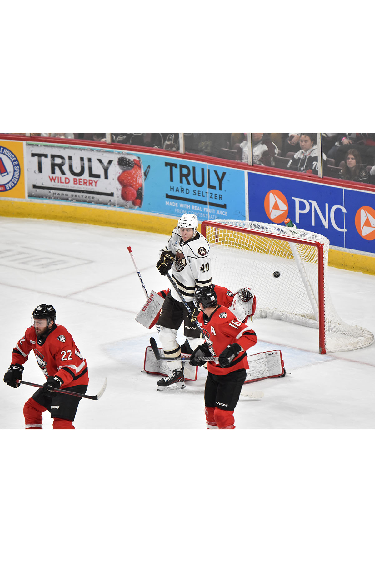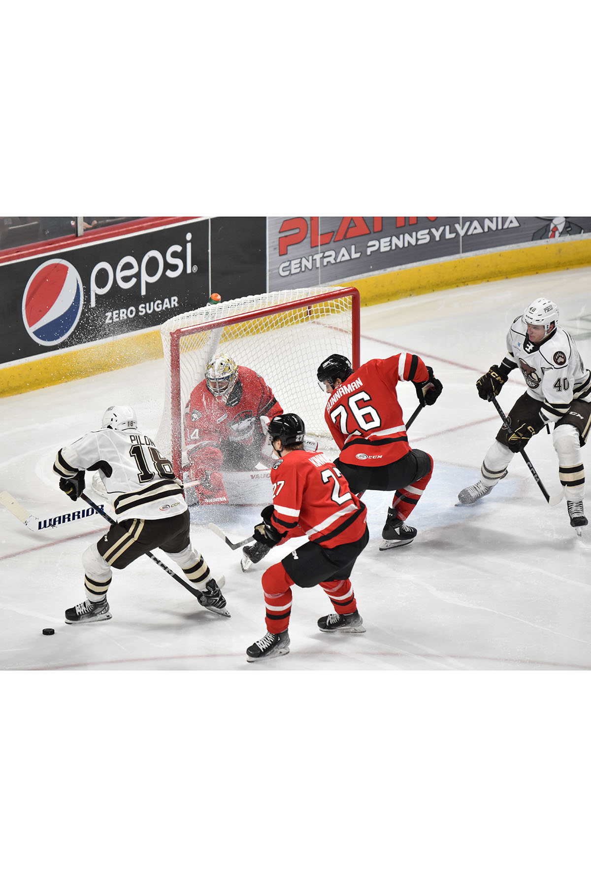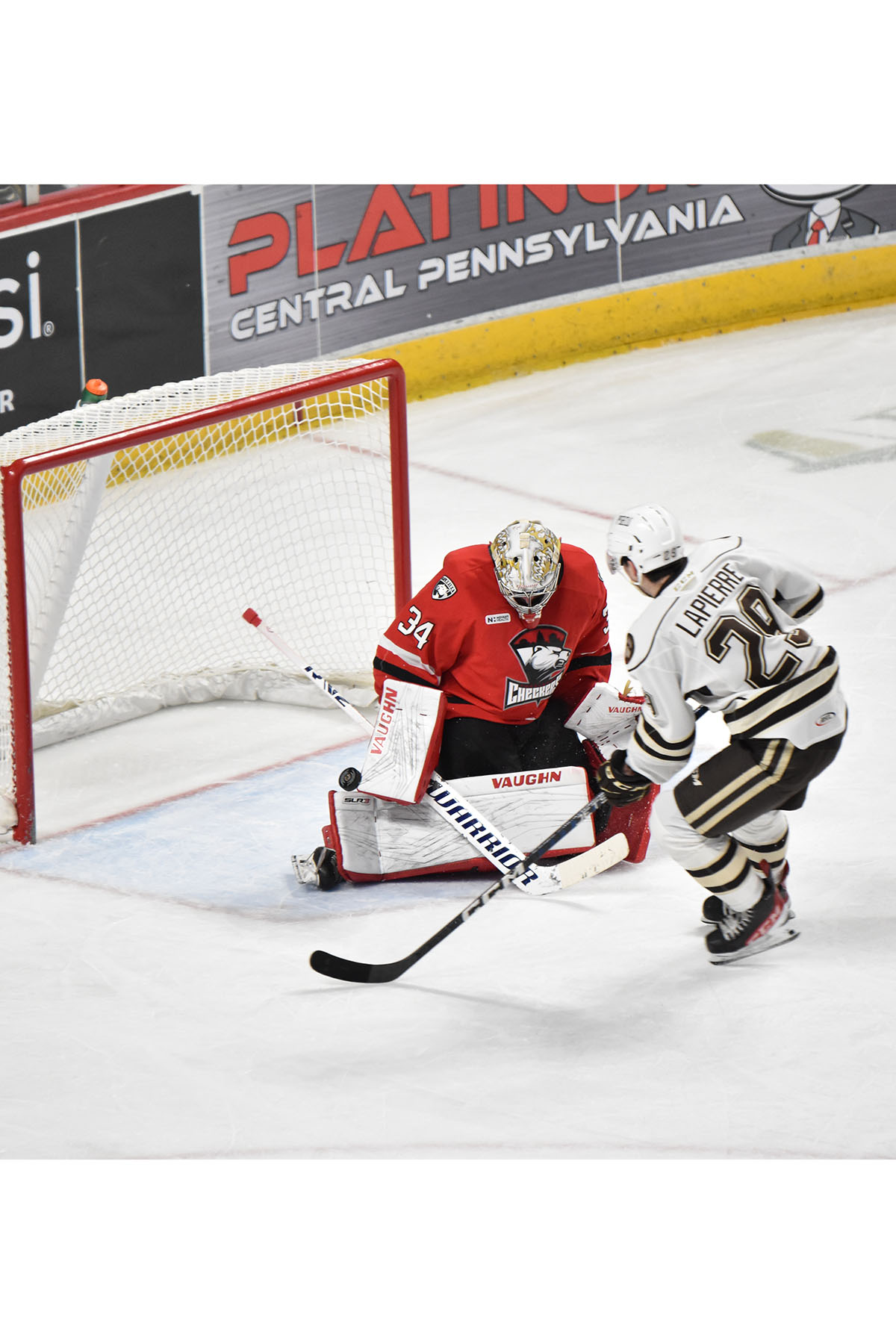 Hershey drew level at 1-1 at 17:30 when Lapierre raced down a dump-in from Aaron Ness at the left circle and beat Alex Lyon with a low shot to the far post for his ninth of the season.