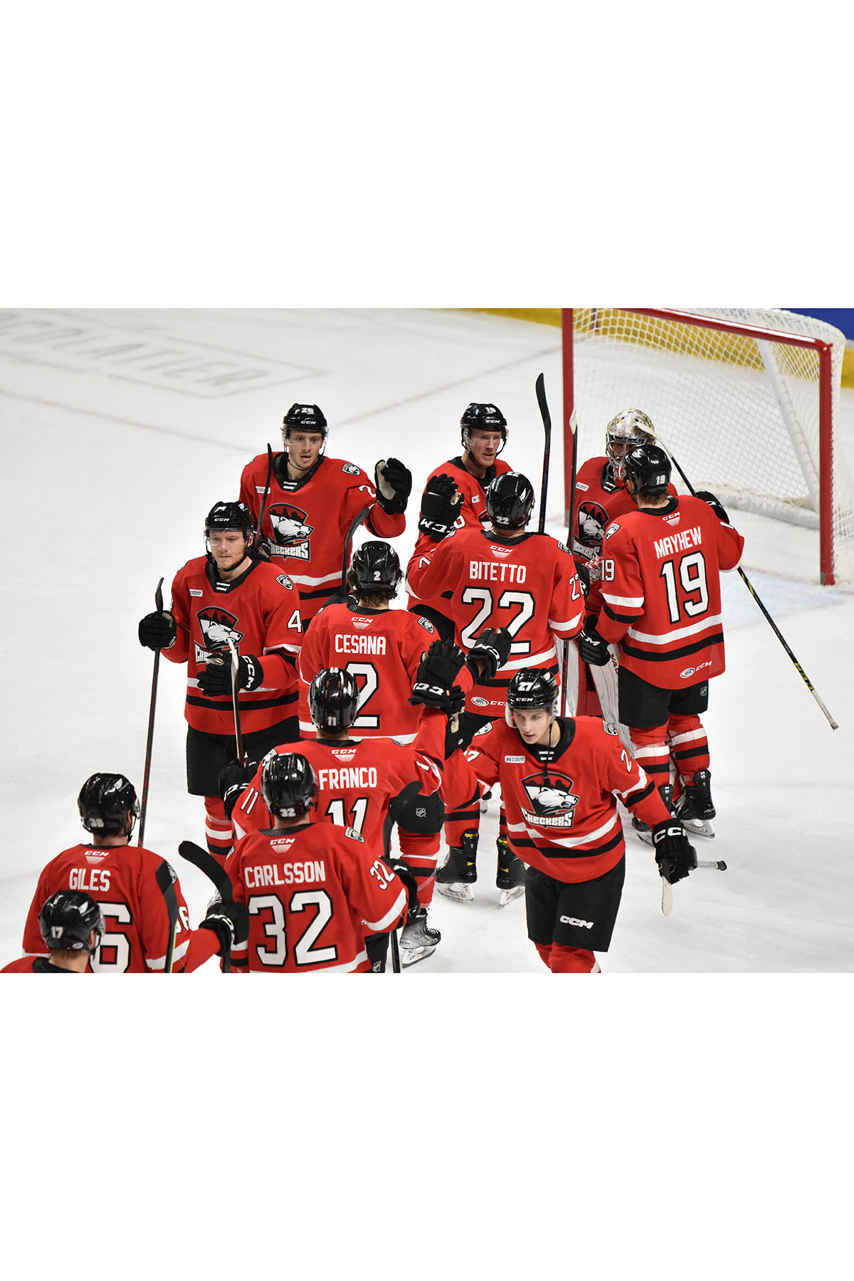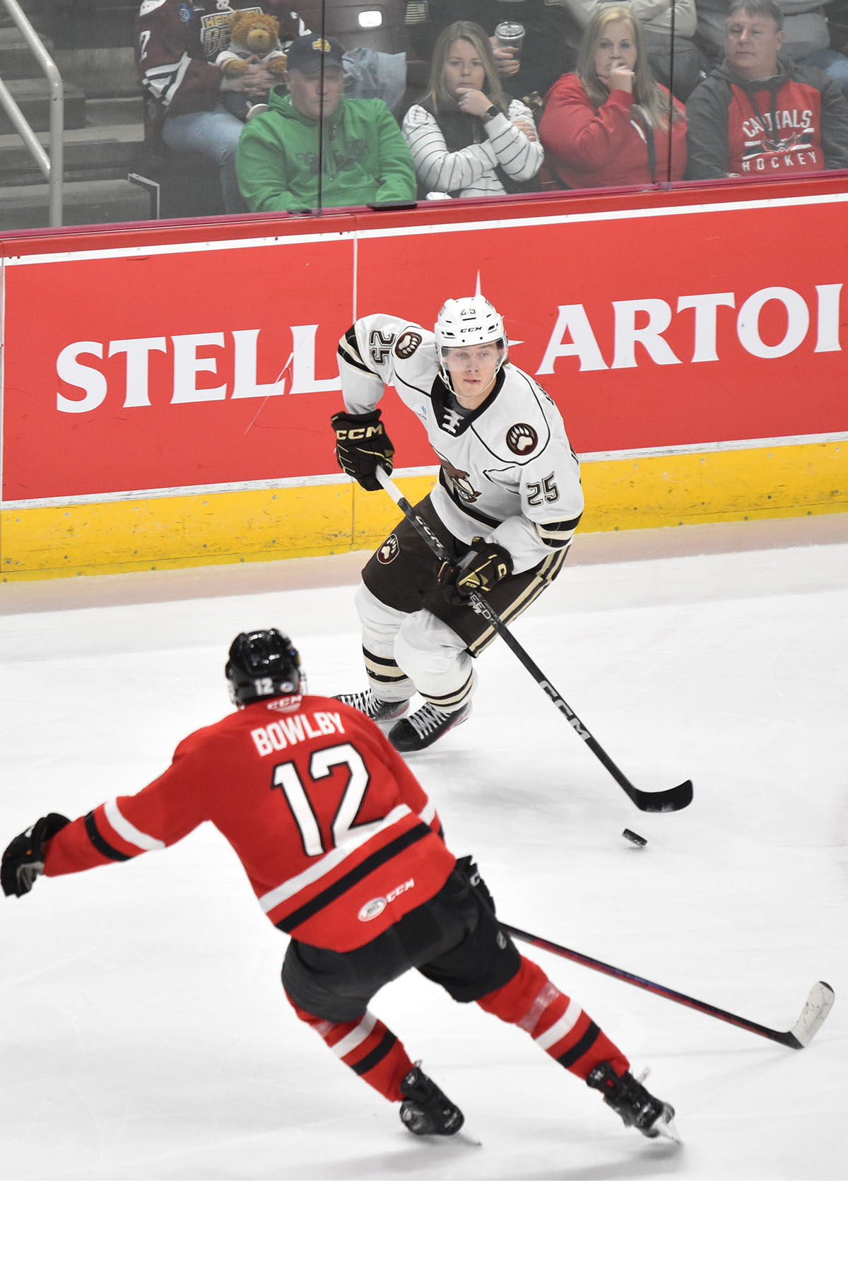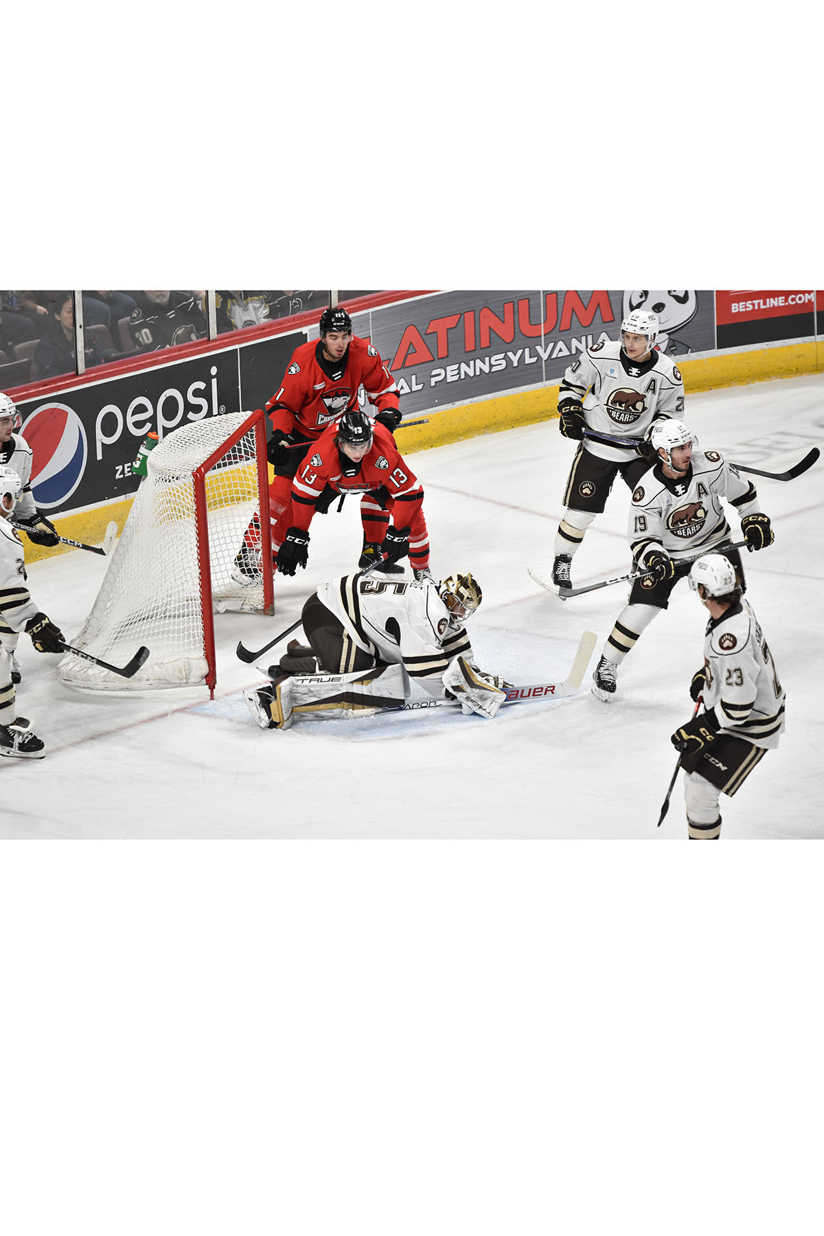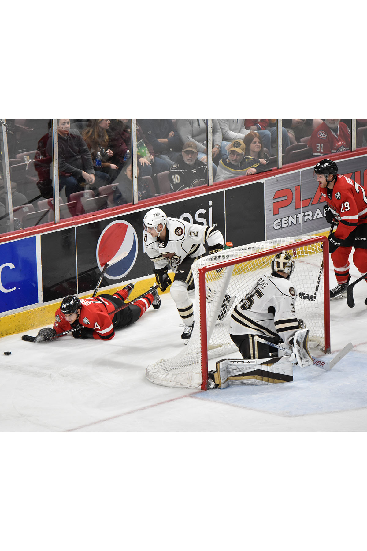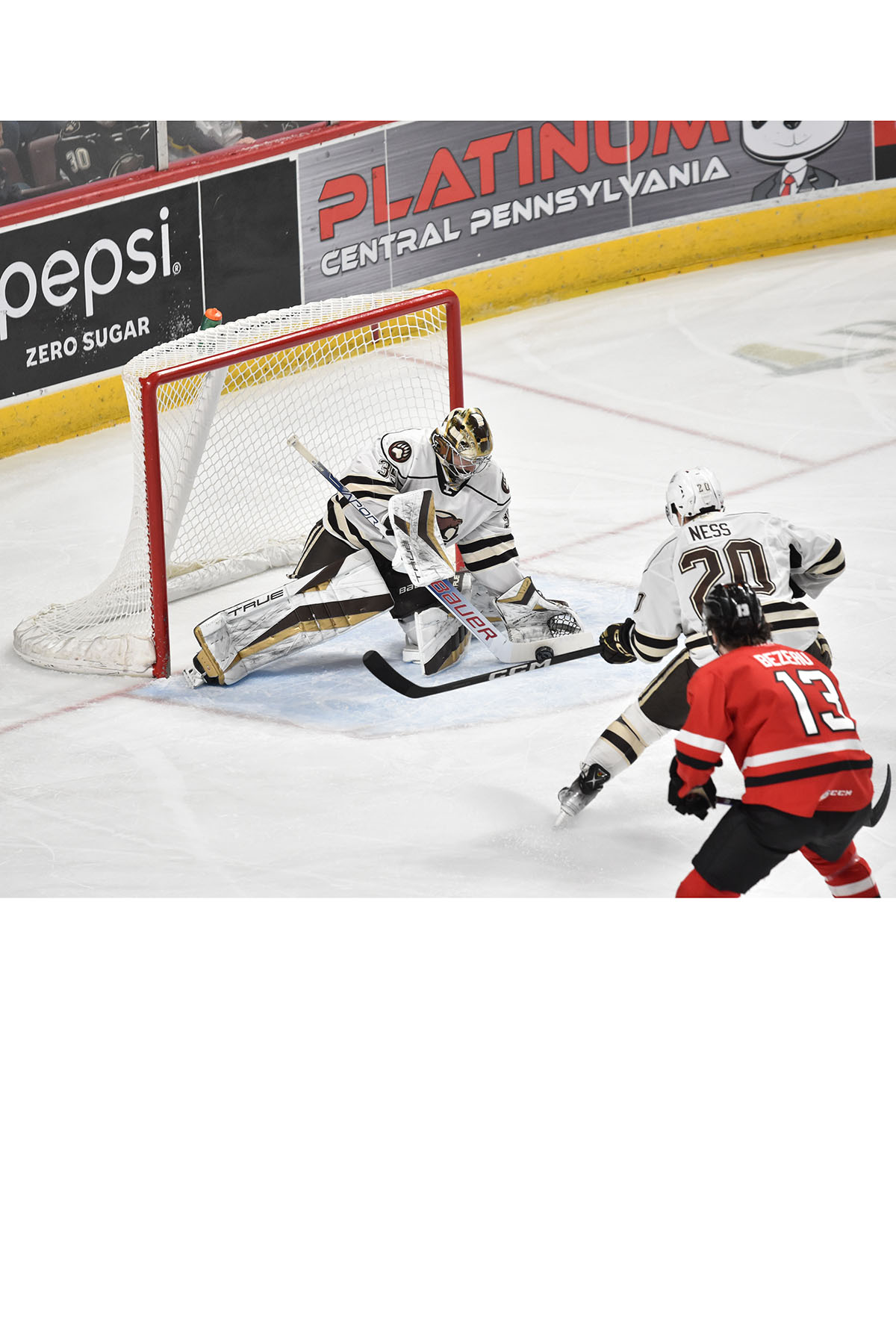 Hershey drew level at 1-1 at 17:30 when Lapierre raced down a dump-in from Aaron Ness at the left circle and beat Alex Lyon with a low shot to the far post for his ninth of the season.
