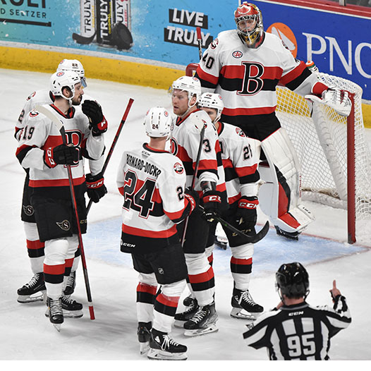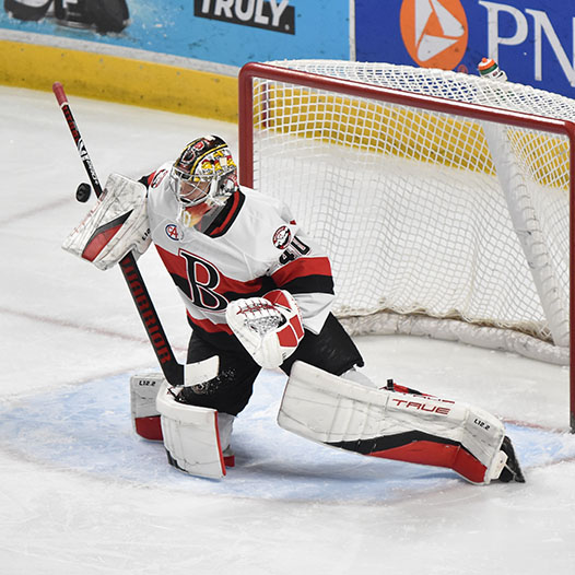 Hugo Roy responded with a power play goal for Belleville at 11:28, striking for his first marker in the AHL. His one-timer beat Hershey netminder Hunter Shepard to make it 1-1.