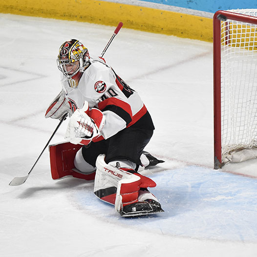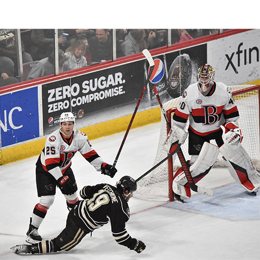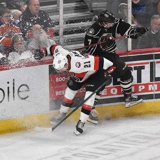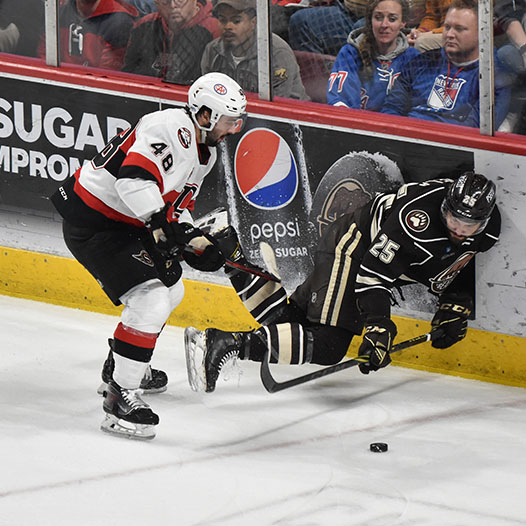 After Hershey’s Dylan McIlrath was assessed a five-minute major penalty and a game misconduct for slashing, Belleville took advantage on the power play as Egor Sokolov added to his team lead in goals, tallying for his 11th marker of the season. Zac Leslie assisted on the tally at 16:25.