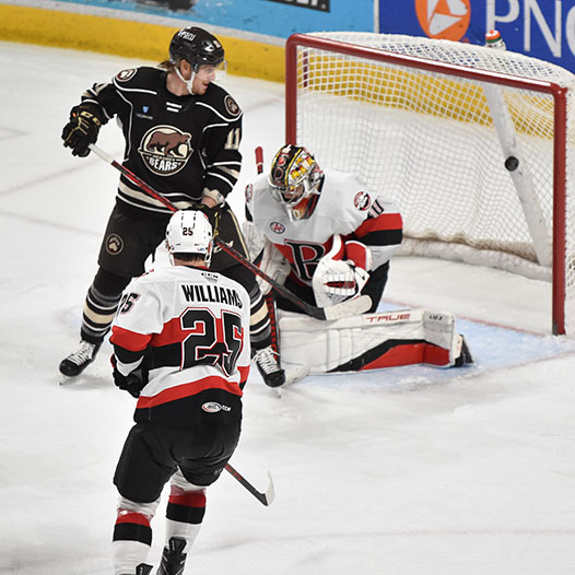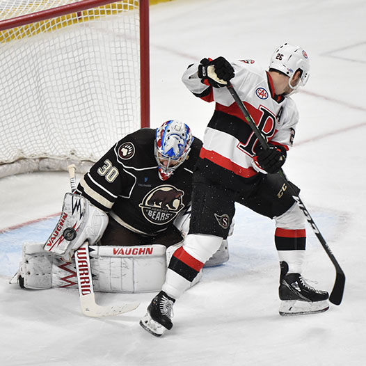 Just 15 seconds later, the Bears regained the lead on a goal from Marcus Vela. Vela won an offensive zone faceoff back to Lucas Johansen at the left point. His snap shot to the goal was deflected by Vela past Sogaard to make it 2-1 Hershey. The goal was Vela’s third of the season.