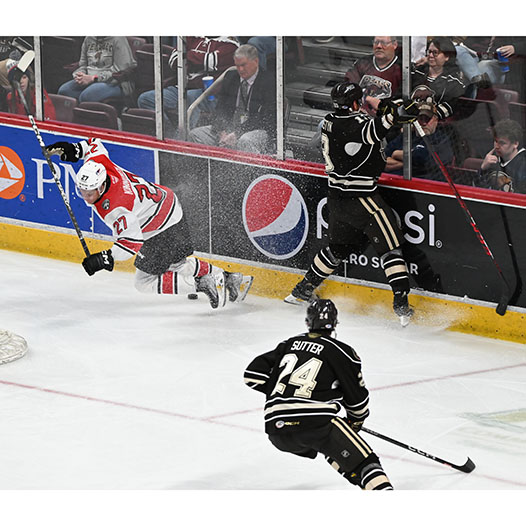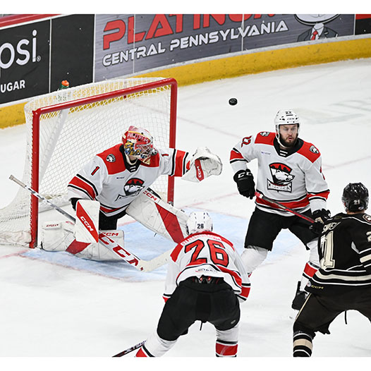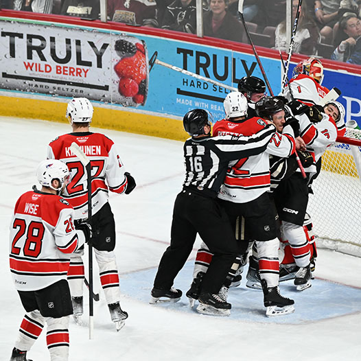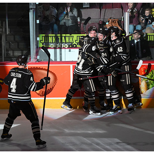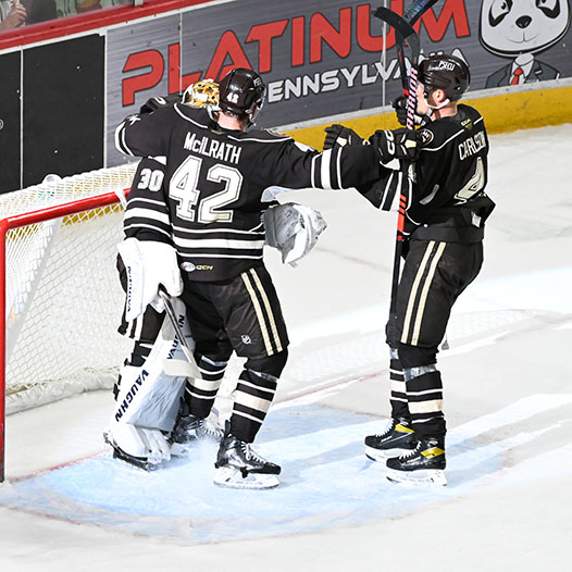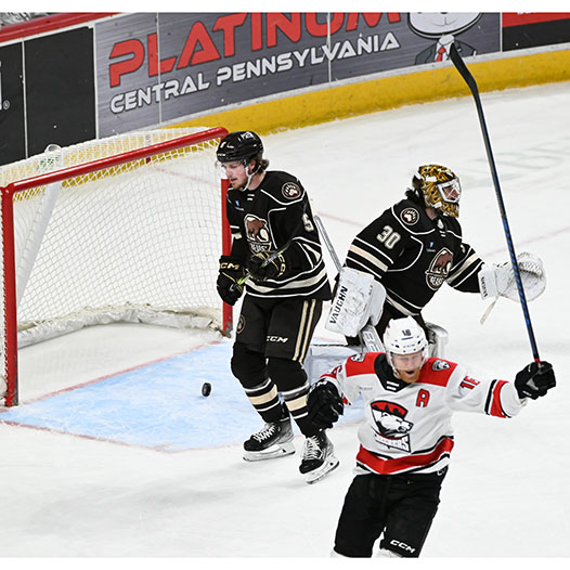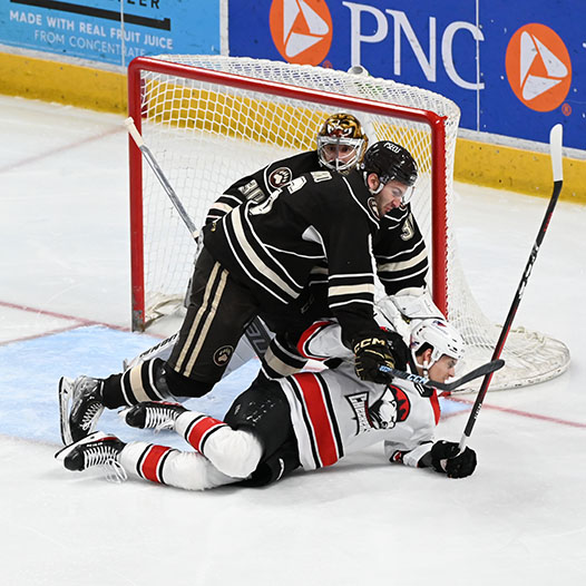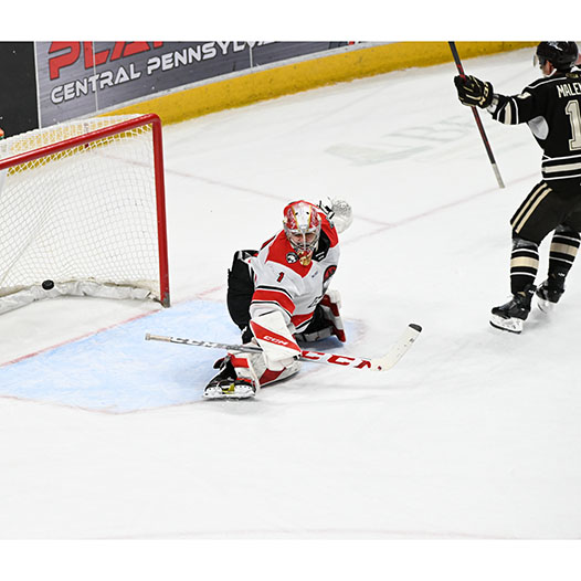 Riley Sutter was credited with Hershey’s fifth goal when the Checkers inadvertently shot the puck into their own empty net with 2:11 to go, and Dylan McIlrath scored a second empty-netter at the 19:00 mark, his first goal in 70 games between the AHL and NHL this season.