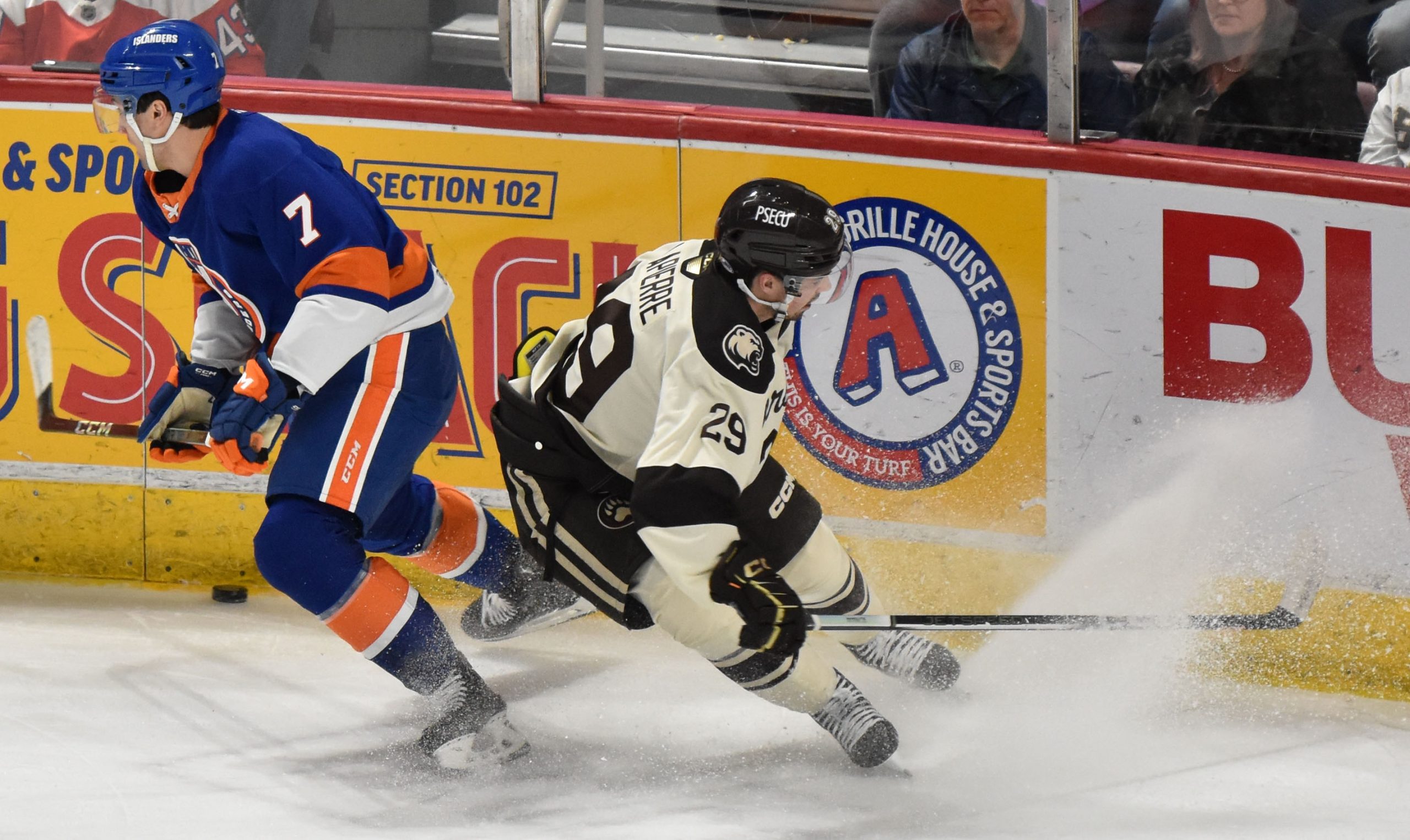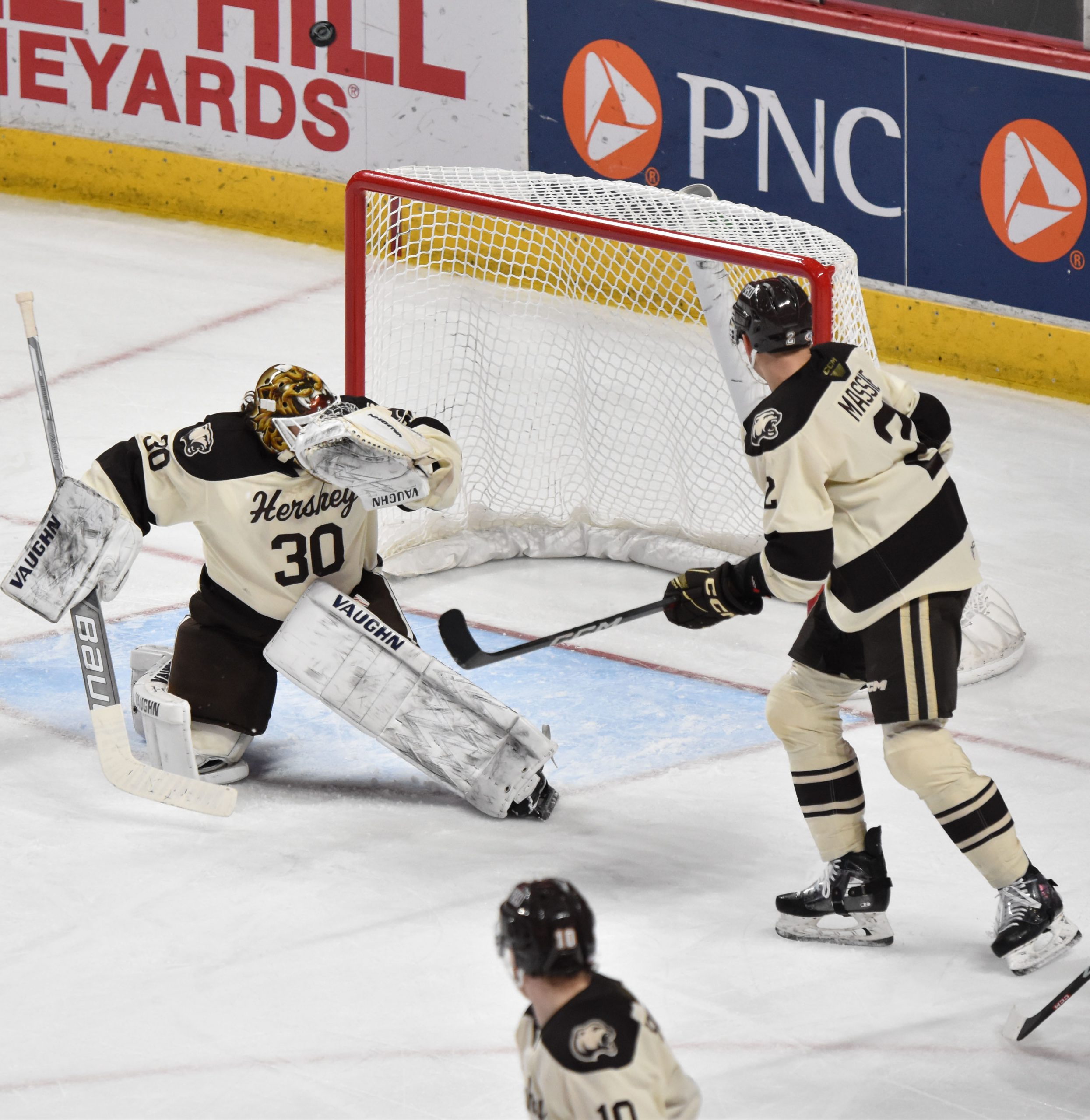 It took just over two minutes for the Bears to find twine, as Pierrick Dube netted his 24th of the season at the 2:01 mark of the first period on Hershey’s second shot of the game, as Ivan Miroshnichenko took hold of the puck behind the Bridgeport net and fed it out in front to Dube, who shot it past Ken Appleby. Dube is now tied with Springfield’s Adam Gaudette for the AHL’s goal-scoring lead.