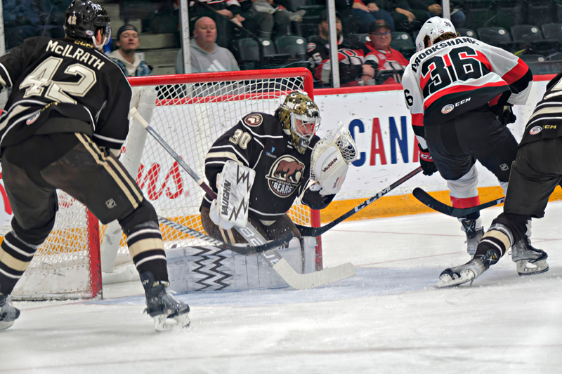 The Belleville Senators hosted the Hershey Bears on Saturday January 21st, 2023. Angus Crookshank (36) of the Senators tries a backhanded shot against goaltender Hunter Shepard (30) of the Bears while Dylan McIlrath (42) of the Bears looks on. (Photo Credit: John Warren / ProHockeyNews)